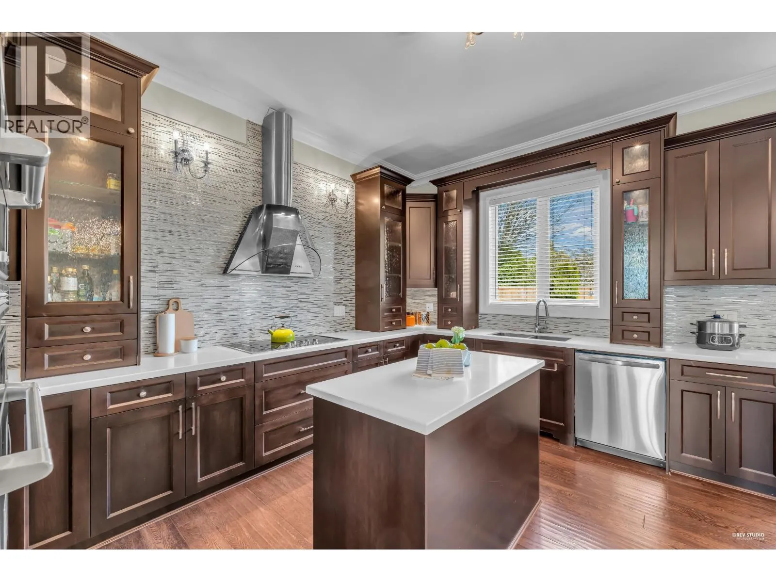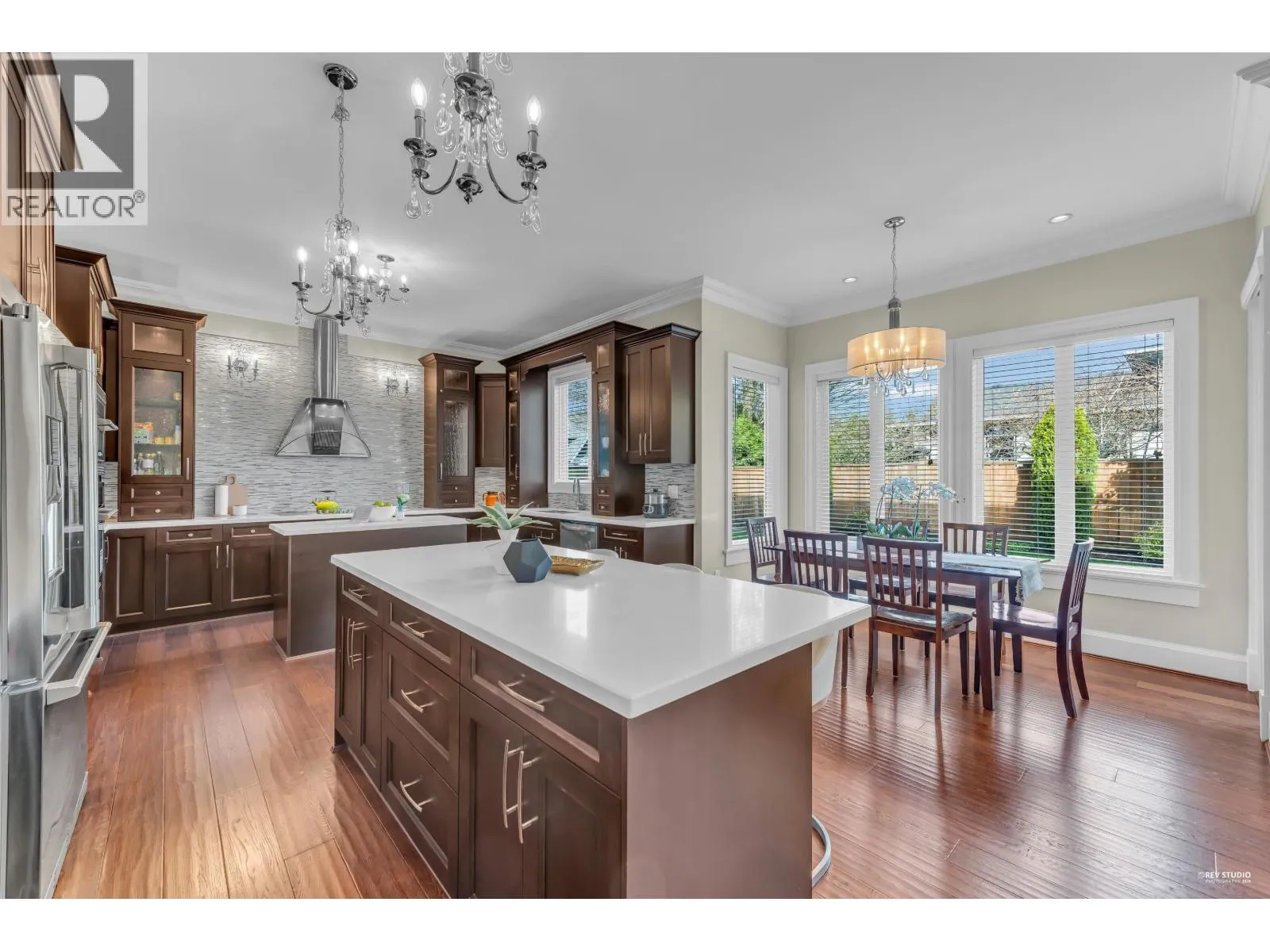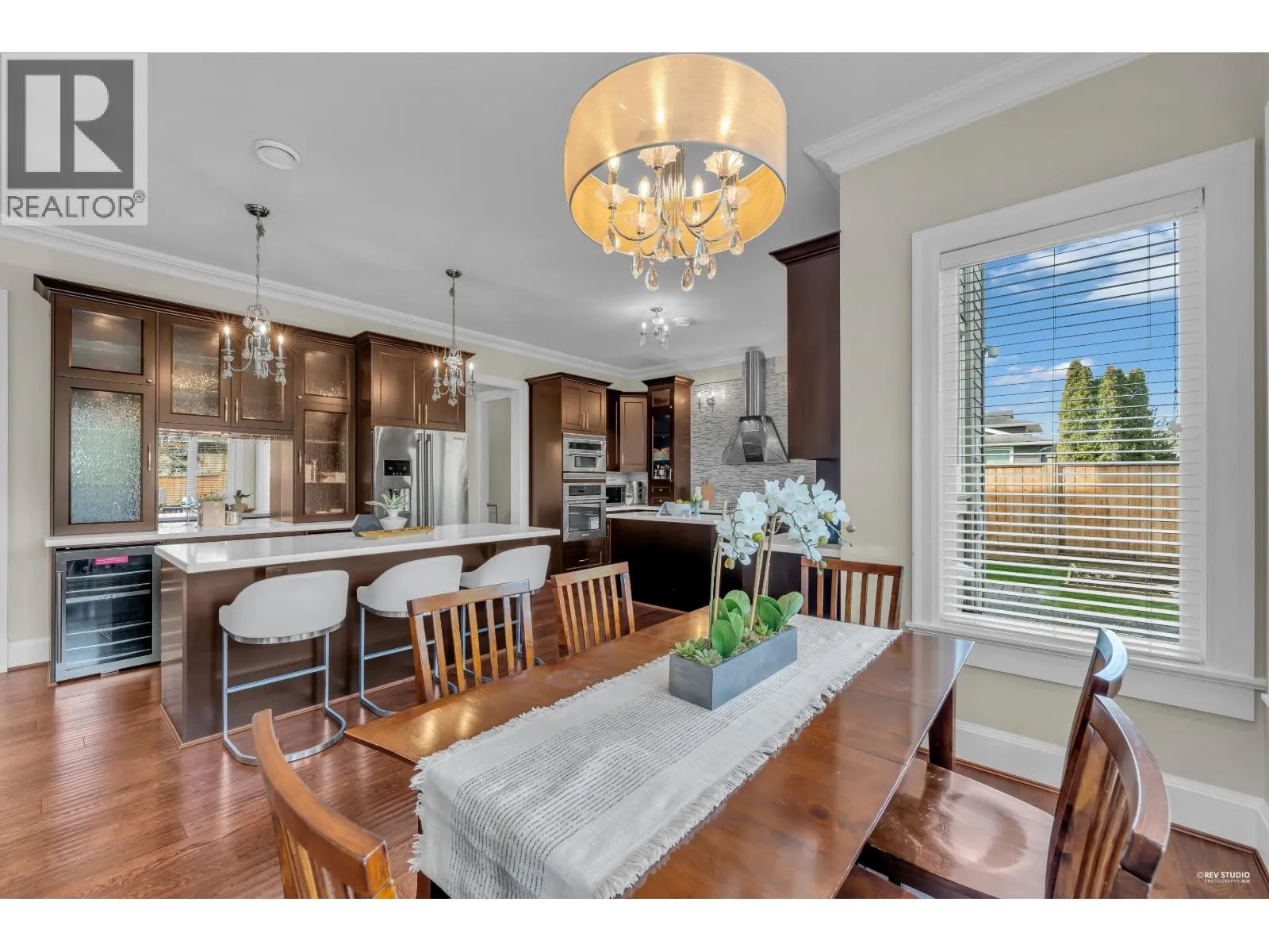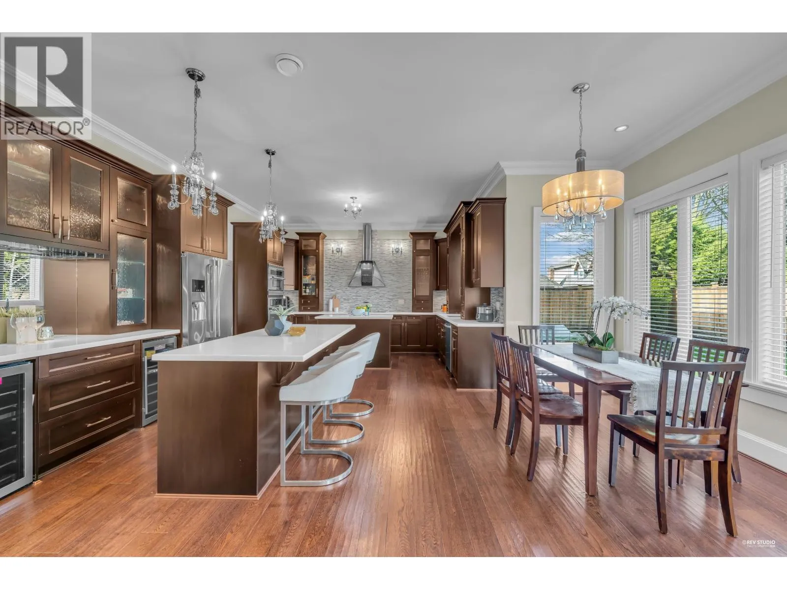 Magnificent South facing custom-designed home built by a European builder with exceptional quality and craftsmanship. Featuring supreme finishing and thoughtful interior design, this residence offers a warm yet luxurious atmosphere. Gourmet kitchen with premium appliances and soft-close cabinetry plus separate wok kitchen. Real oak hardwood floors, and Swarovski crystal chandelier. 4 spacious upstairs bedrooms, all with own bathrooms. Wet bar, A/C, HRV, and security system with cameras. Huge corner lot next to the golf course, minutes to Terra Nova Shopping Centre and Thompson Community Centre, in the Burnett Secondary School catchment and only 5min walking to Quilchena Elementary. A rare opportunity in a prime location. (id:27476)