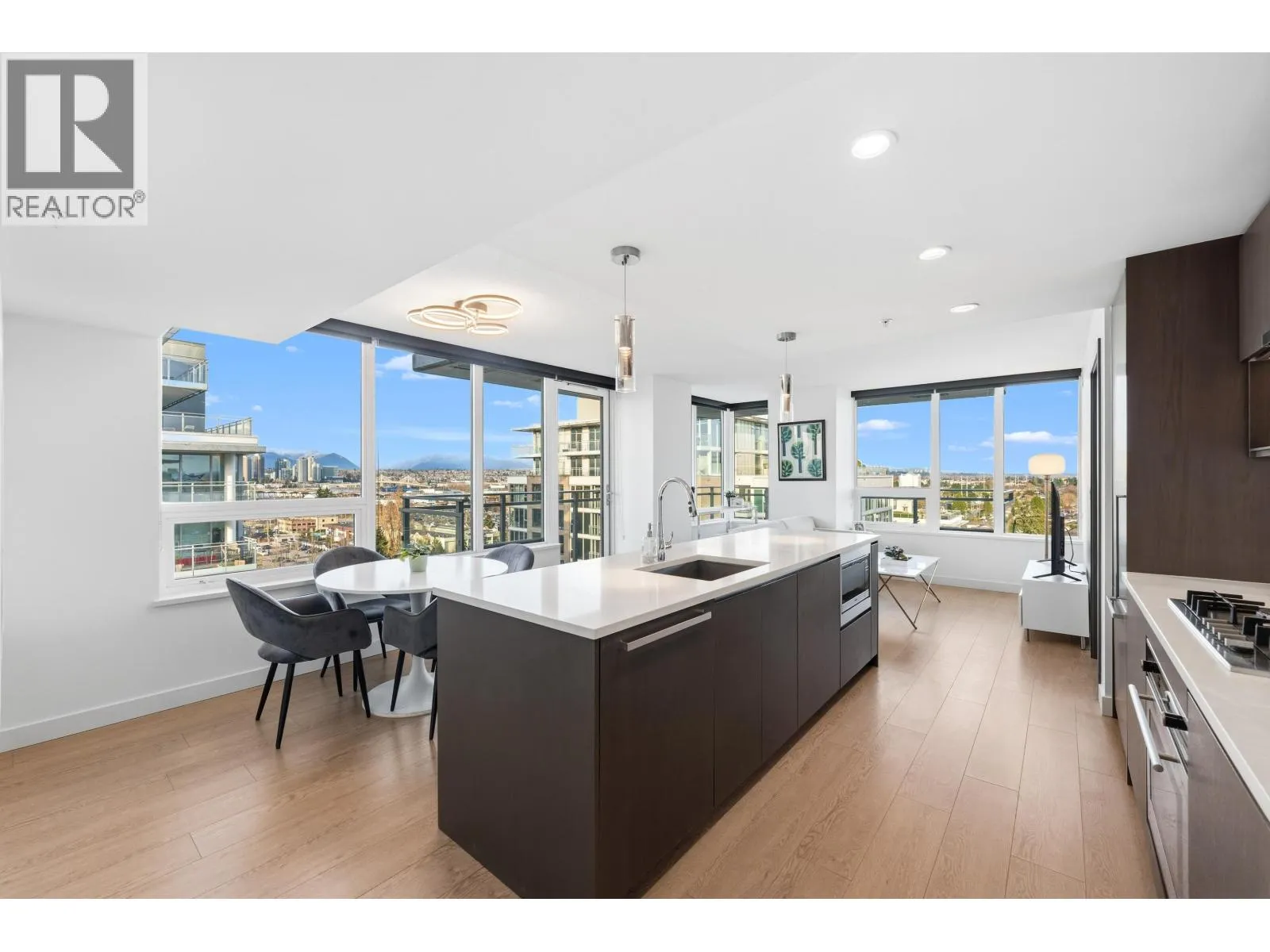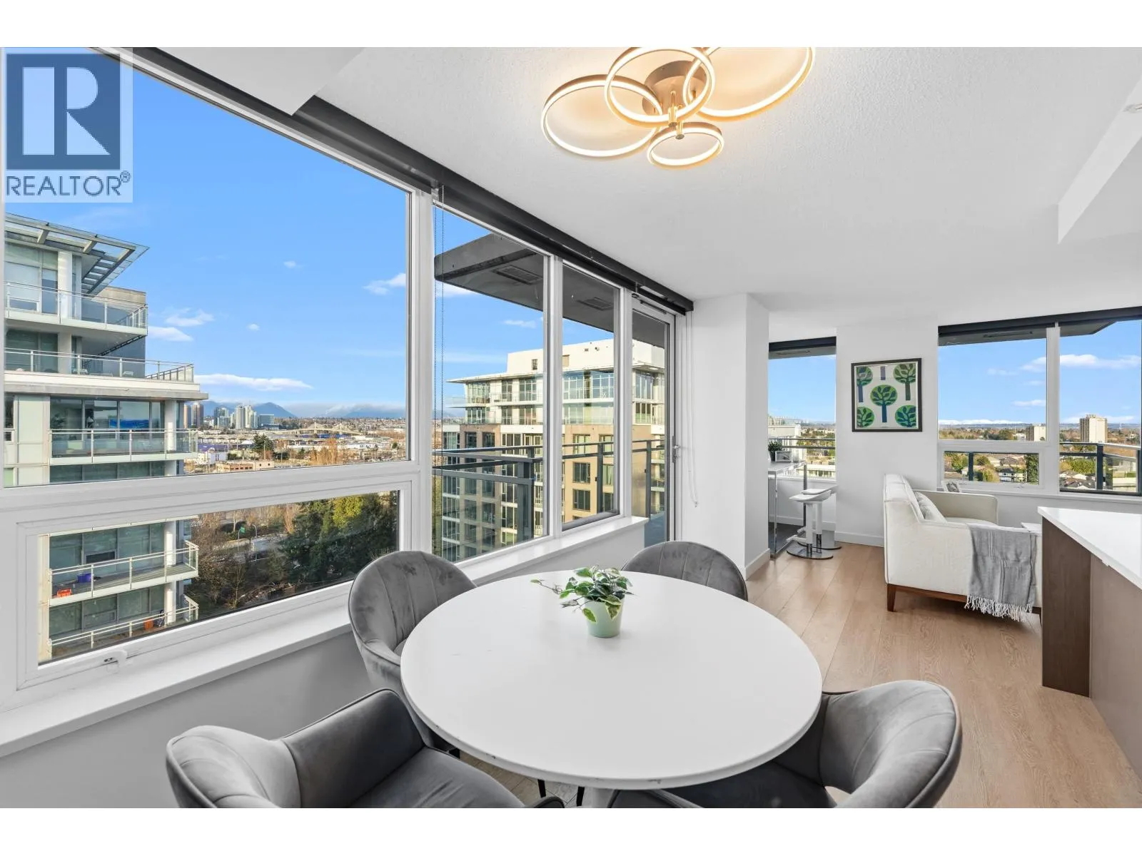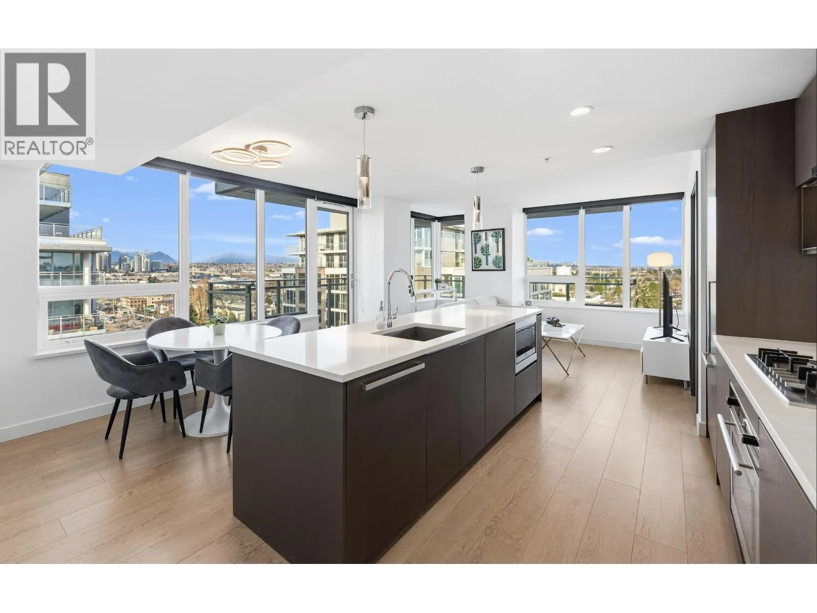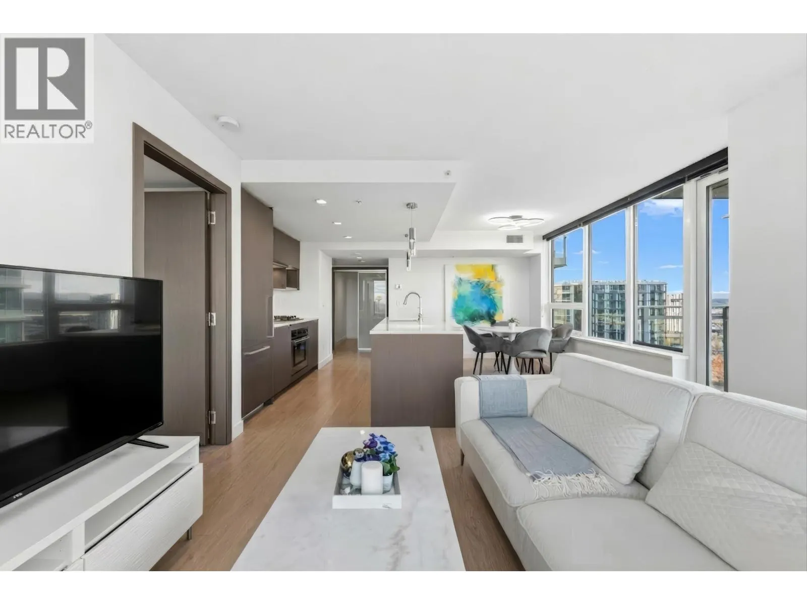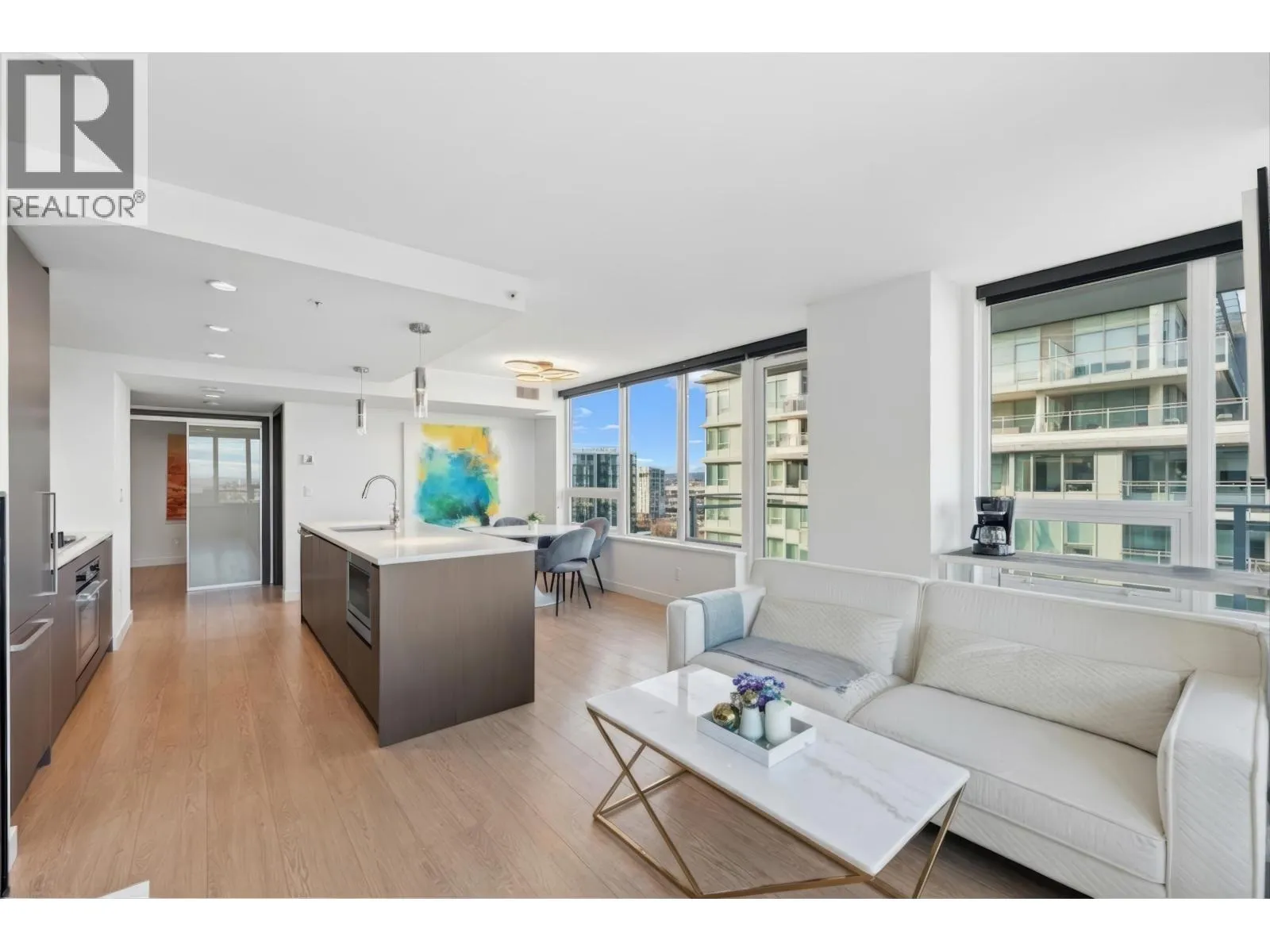 This air-conditioned 17th-floor corner residence at Concord Gardens features a bright 2-bedroom + den, 2-bathroom layout with fresh 2026 paint. Large floor-to-ceiling windows flood the home with natural light and showcase wide city views. The open living area features modern wide-plank flooring and leads to a private balcony. The gourmet kitchen includes a large island with stone countertops and premium integrated appliances. The versatile den provides a dedicated space for a home office or extra storage. Residents have access to the Diamond Club, which offers an indoor pool and fitness center. Located in Capstan Village, you are steps away from the SkyTrain, shopping, and dining. Open House: Apr5(Sun) 2-4PM. (id:27476)