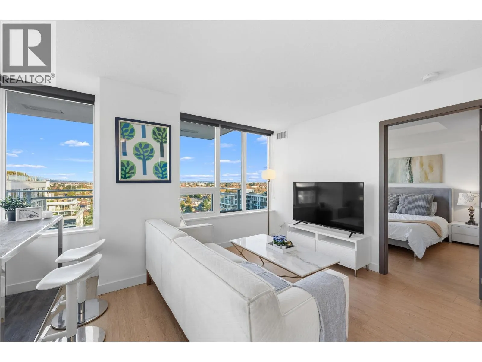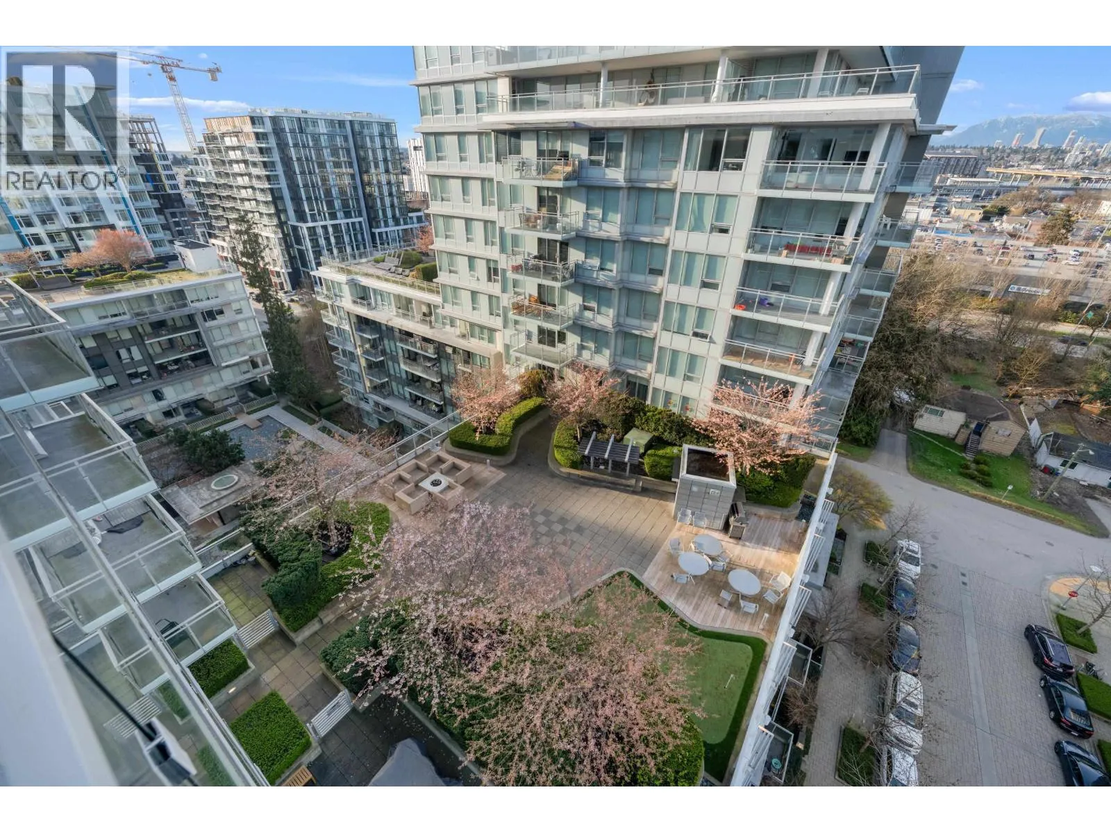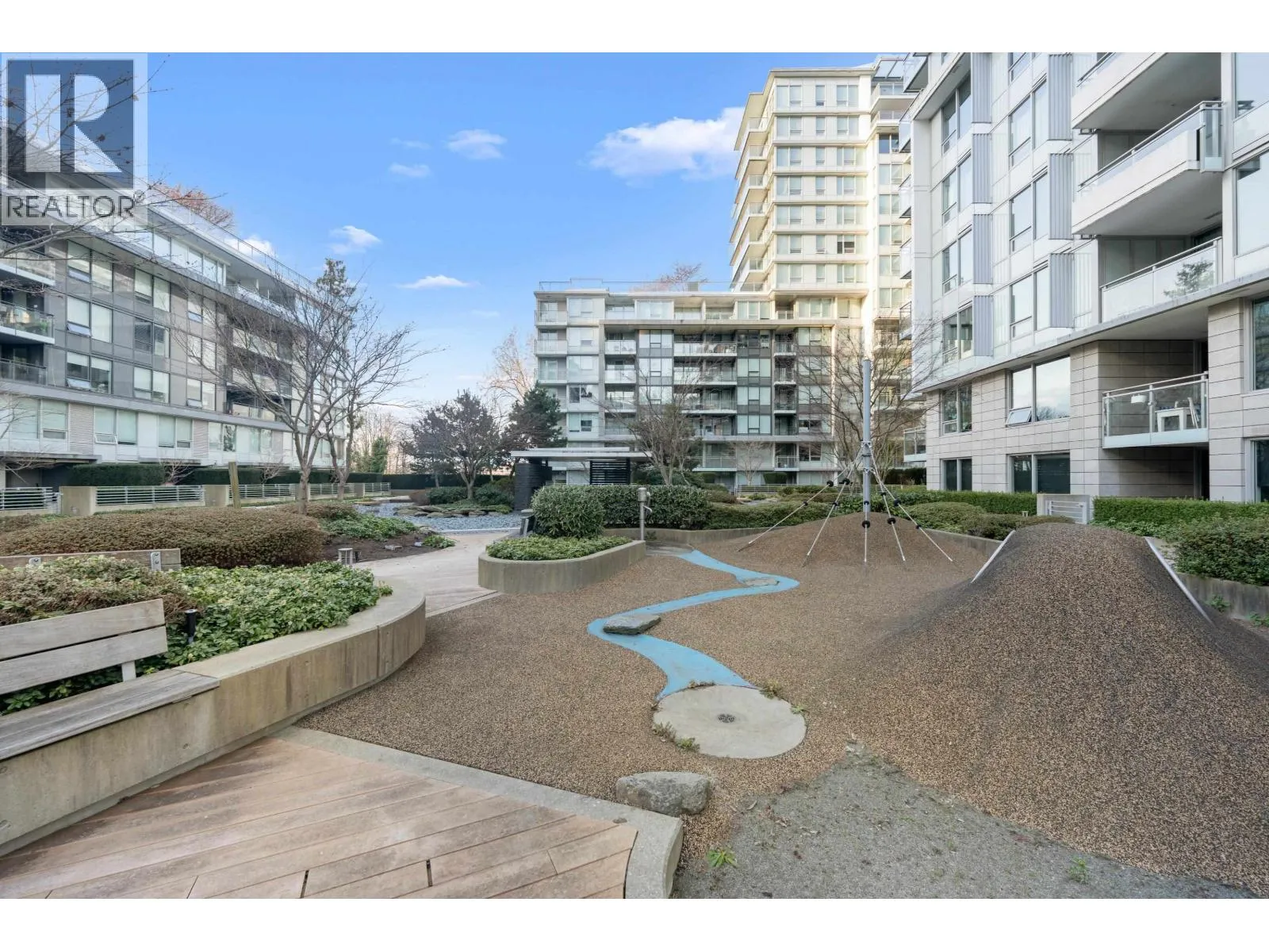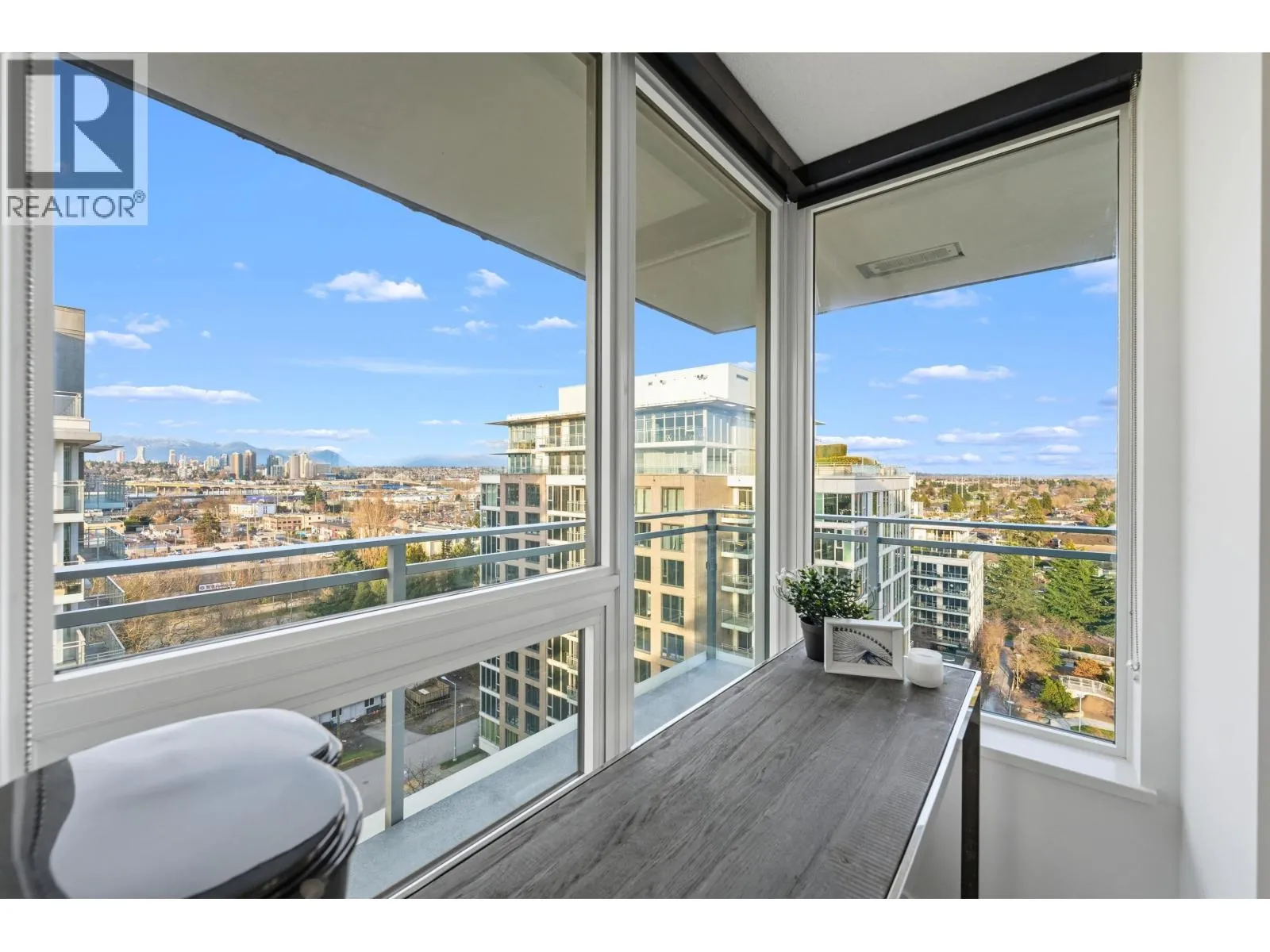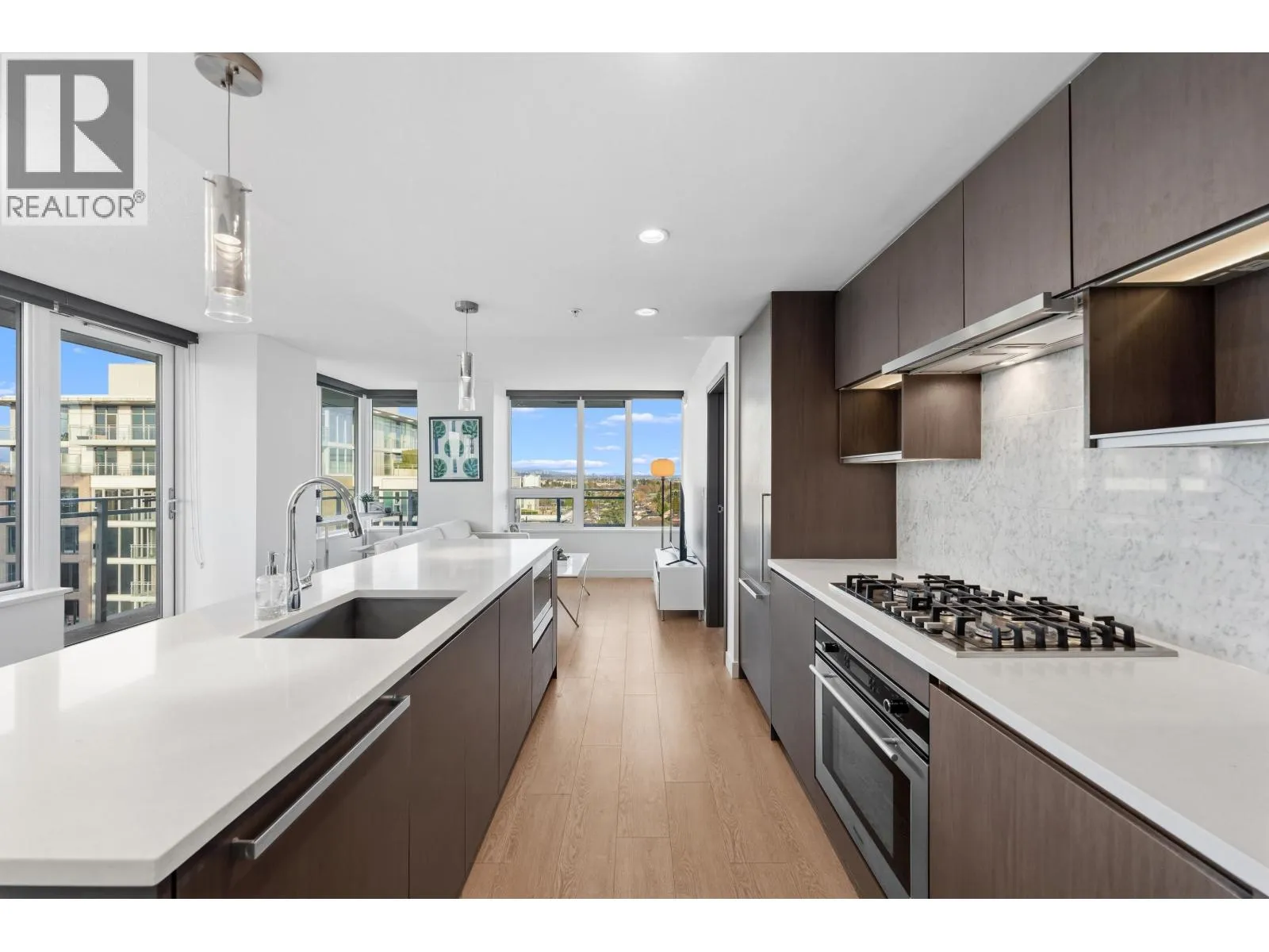 This air-conditioned 17th-floor corner residence at Concord Gardens features a bright 2-bedroom + den, 2-bathroom layout with fresh 2026 paint. Large floor-to-ceiling windows flood the home with natural light and showcase wide city views. The open living area features modern wide-plank flooring and leads to a private balcony. The gourmet kitchen includes a large island with stone countertops and premium integrated appliances. The versatile den provides a dedicated space for a home office or extra storage. Residents have access to the Diamond Club, which offers an indoor pool and fitness center. Located in Capstan Village, you are steps away from the SkyTrain, shopping, and dining. Open House: Apr5(Sun) 2-4PM. (id:27476)