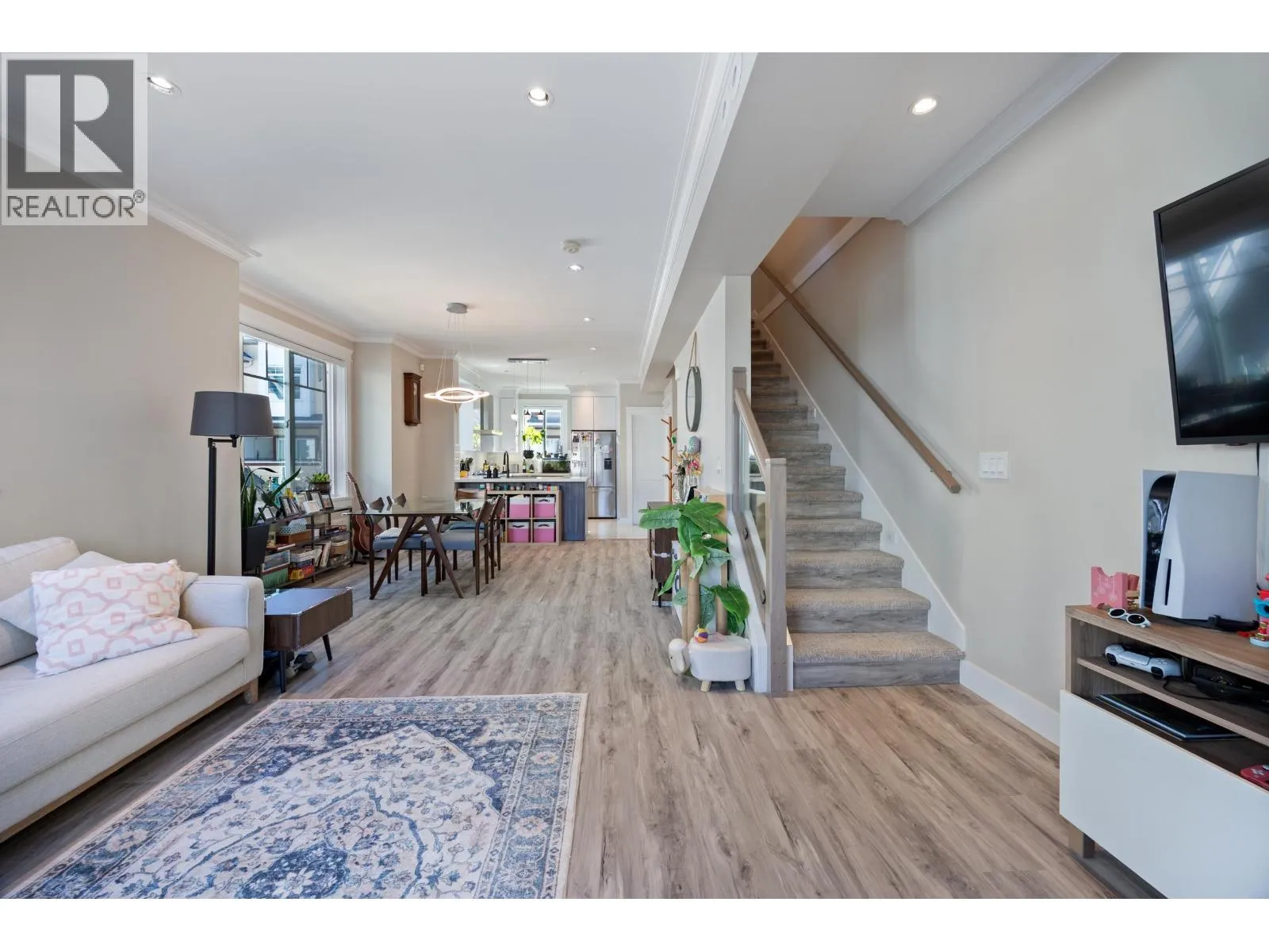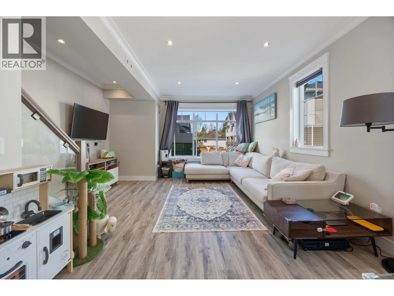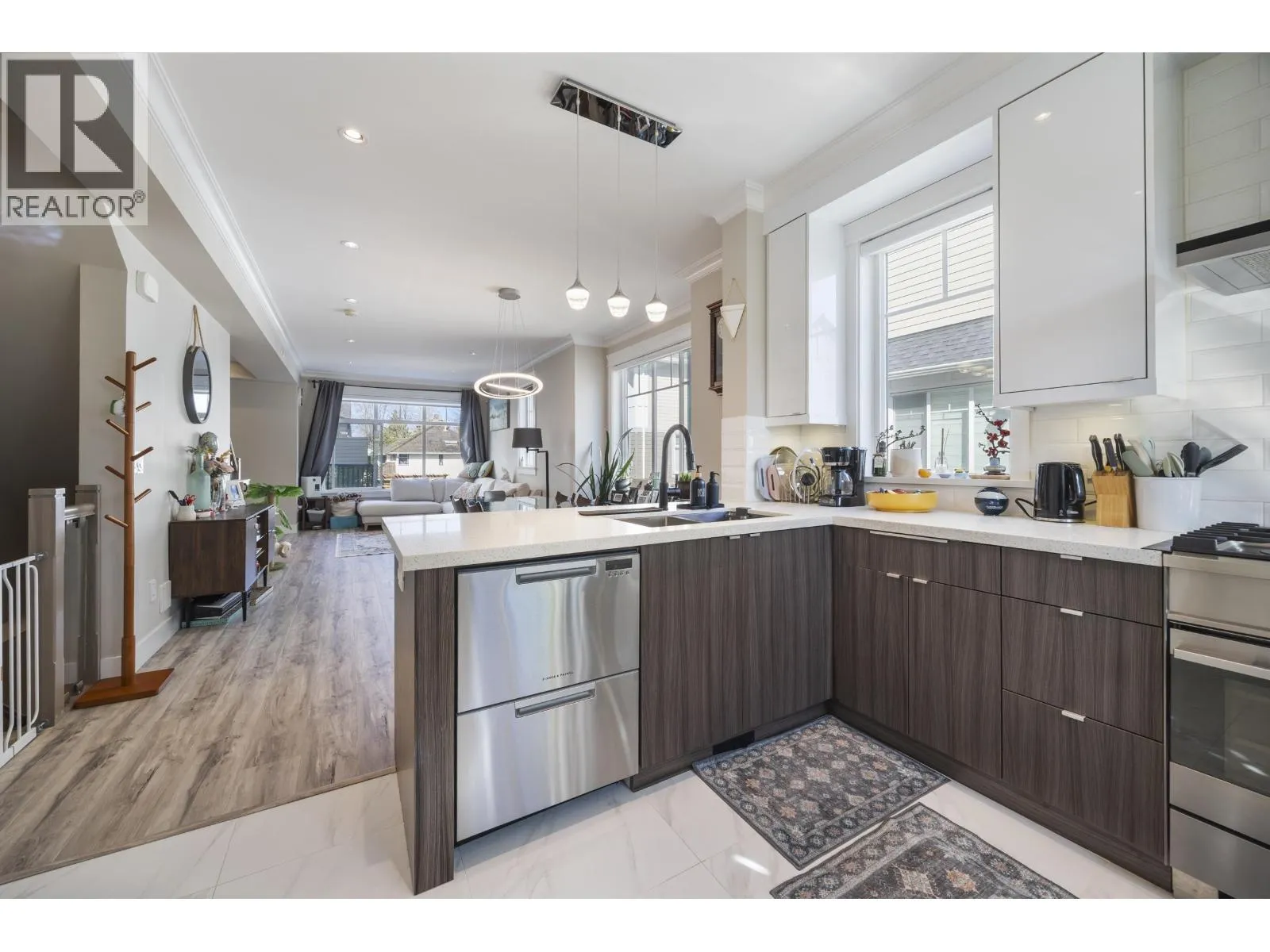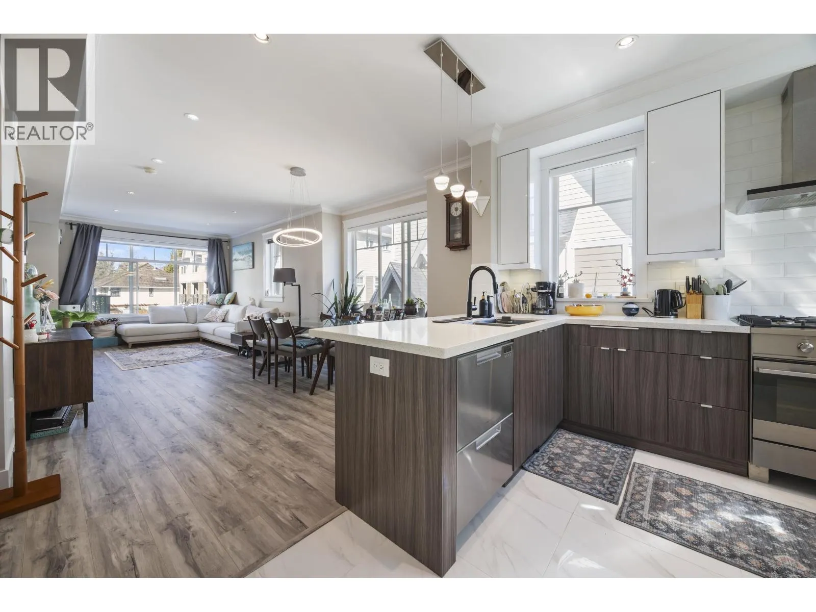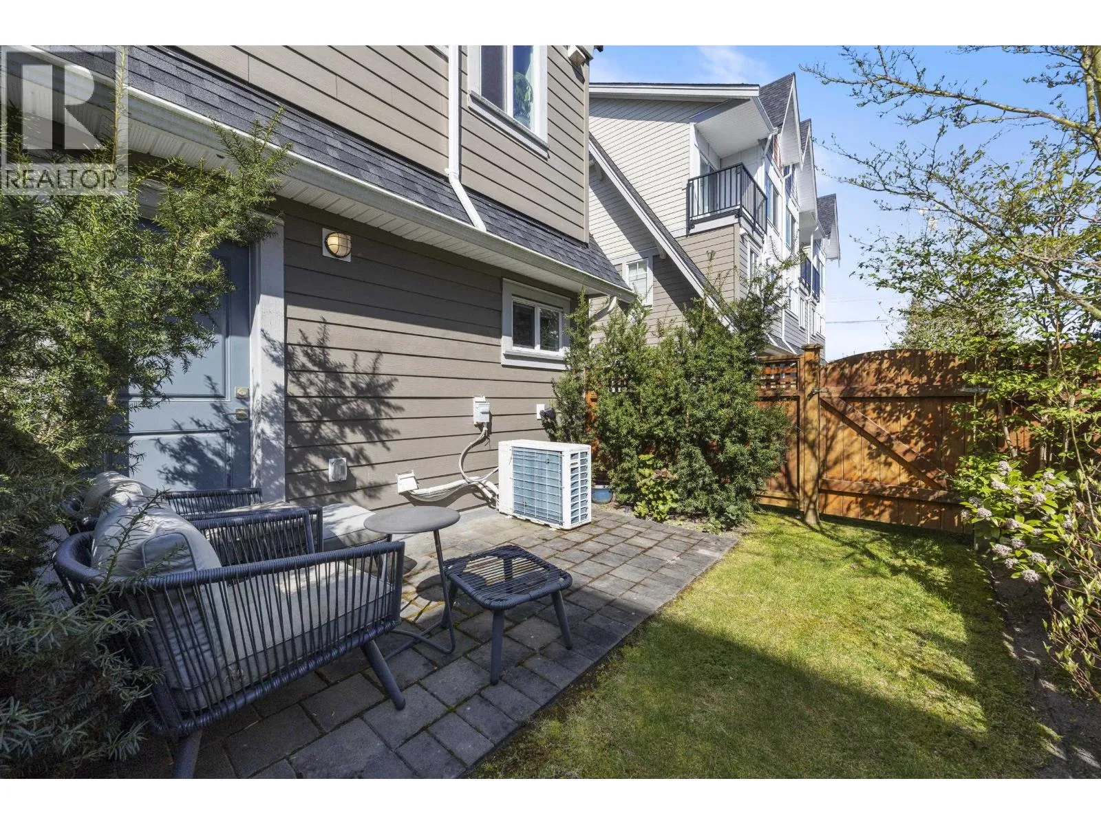 Welcome to this spacious and bright 3-bedroom, 2.5-bath townhome offering an open-concept layout with high ceilings on both the main and upper levels. The modern kitchen is equipped with premium Fisher & Paykel appliances, ideal for everyday living and entertaining alike. Tucked away on the interior of the complex, this home enjoys a quiet setting while remaining centrally located with easy access to major routes. Outside, enjoy a private yard perfect for relaxing or hosting, plus the convenience of a tandem garage and air conditioning for year-round comfort. Just one block from Garden City Park & within walking distance to Anderson Elementary and MacNeill Secondary. An excellent opportunity for families or buyers seeking comfort, quiet, & connectivity in one package. OH Sat May 2nd, 2-4PM (id:27476)