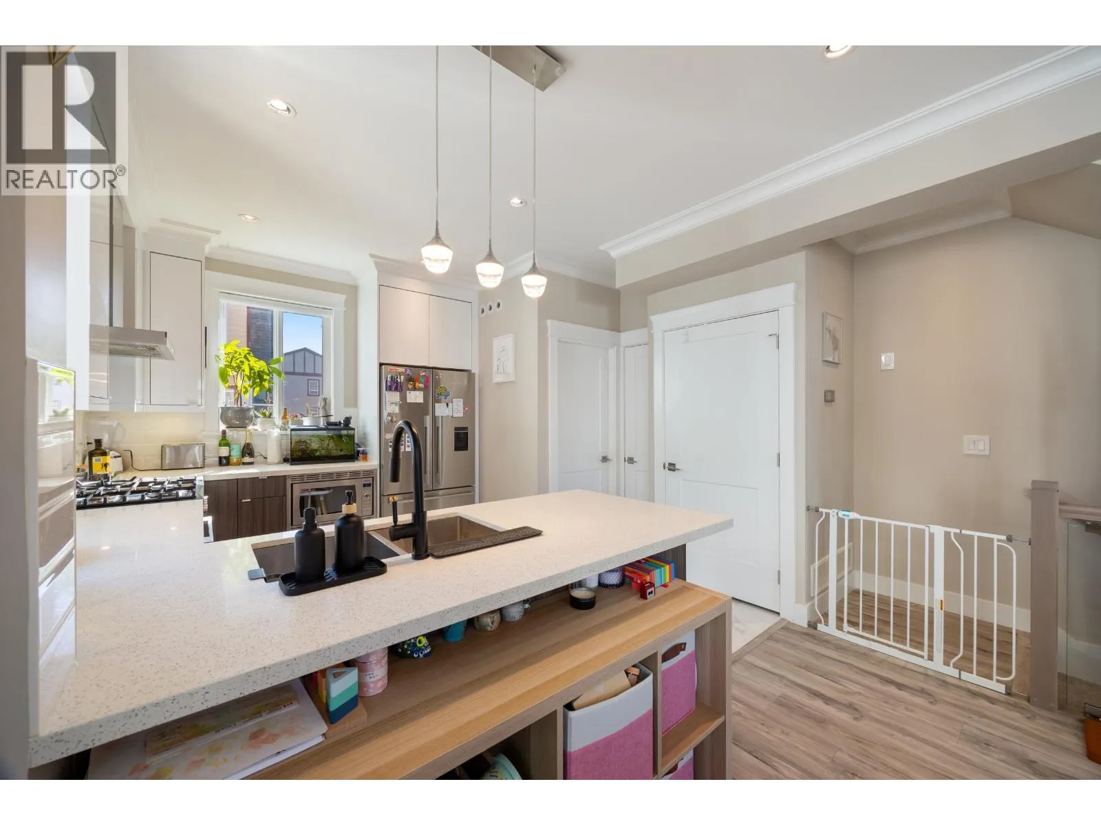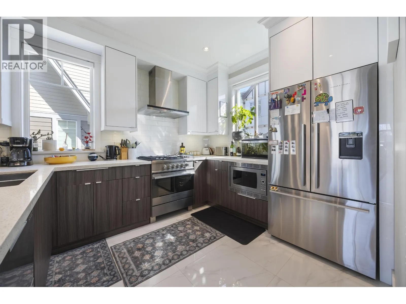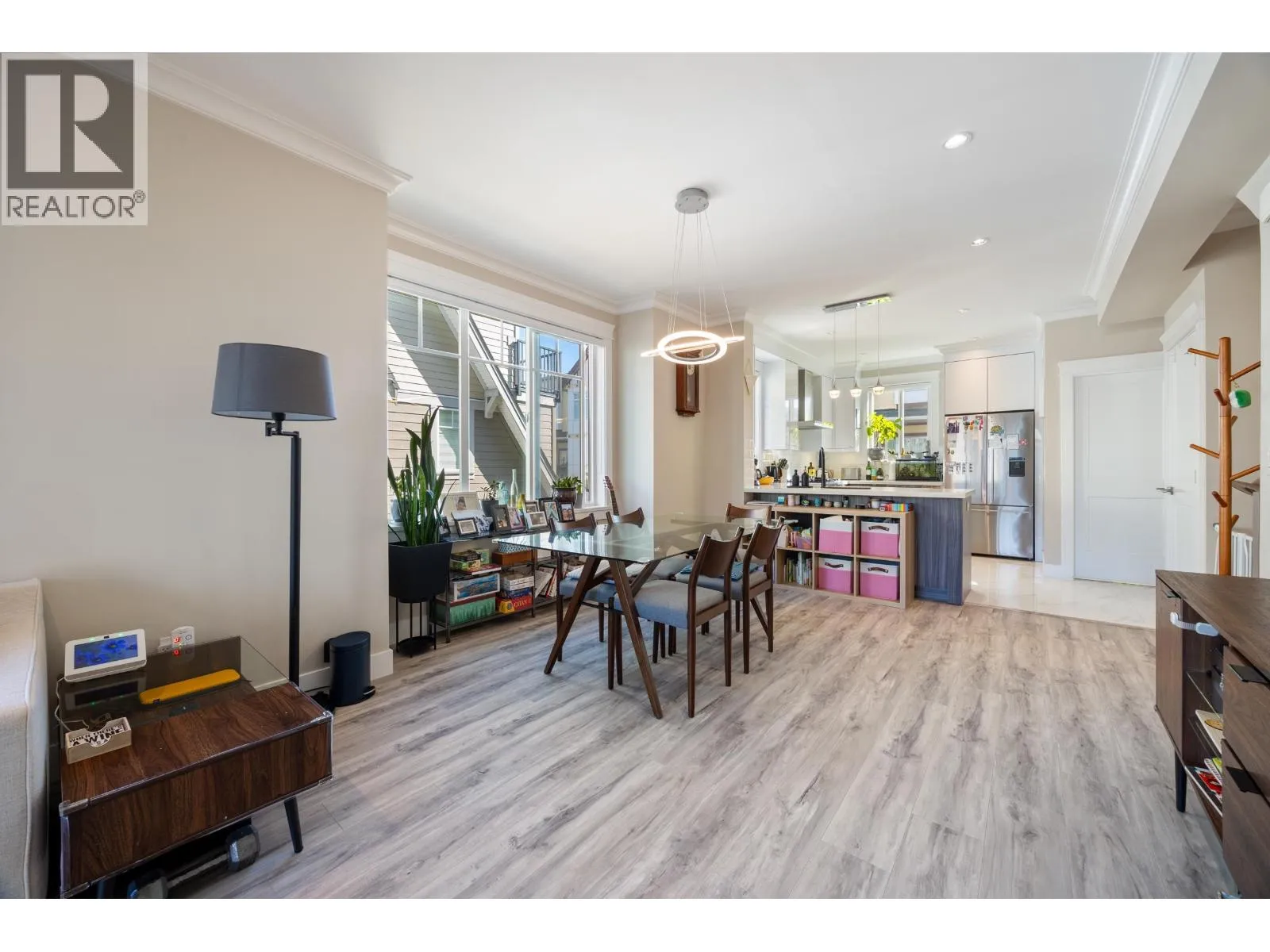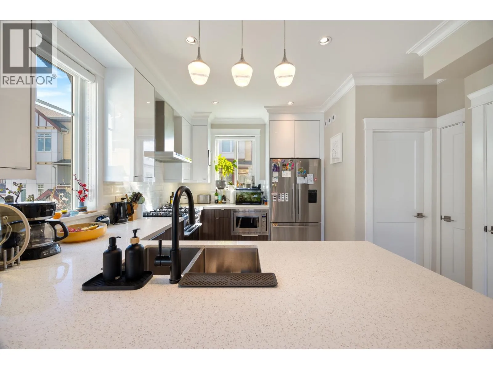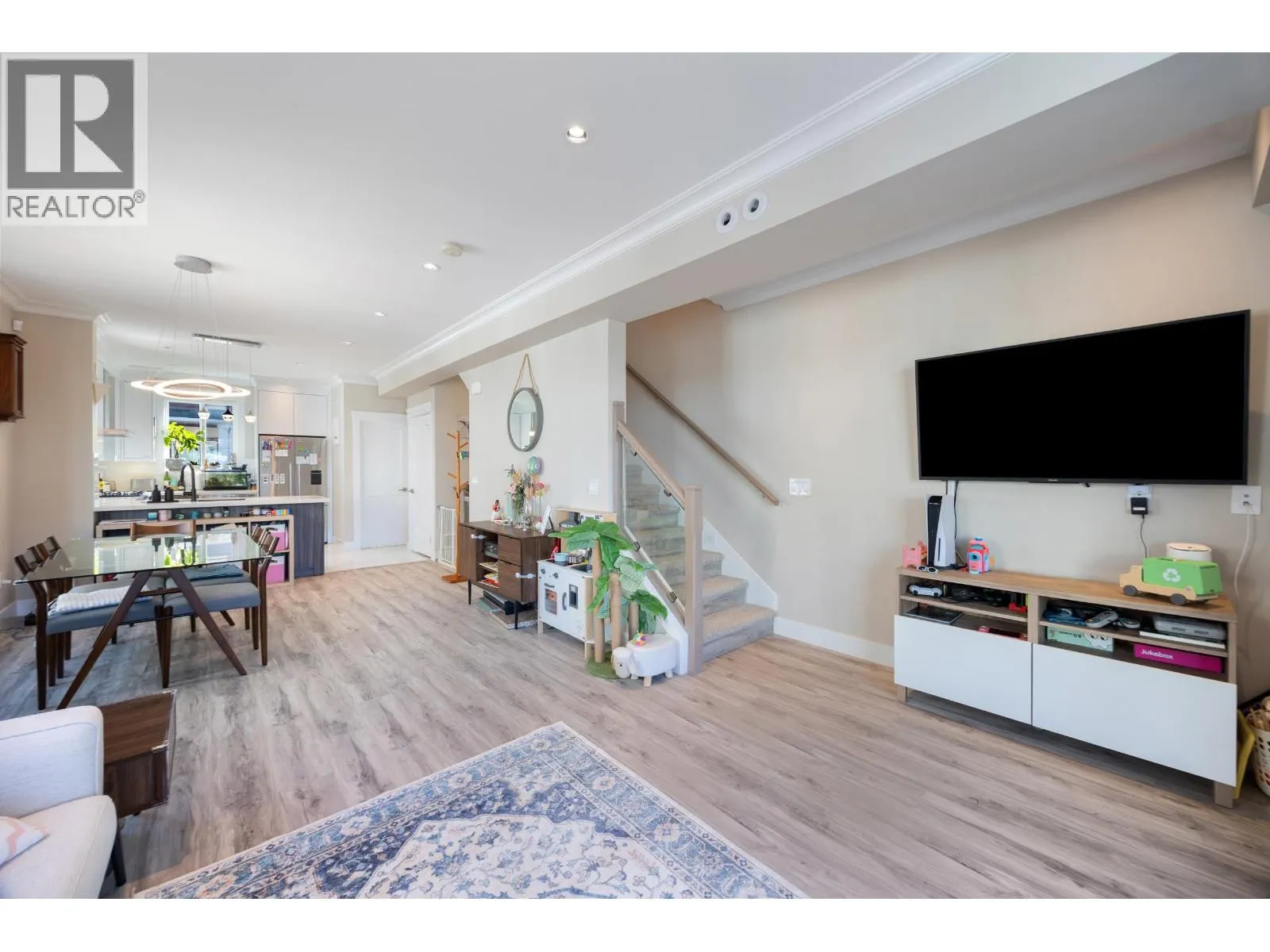 Welcome to this spacious and bright 3-bedroom, 2.5-bath townhome offering an open-concept layout with high ceilings on both the main and upper levels. The modern kitchen is equipped with premium Fisher & Paykel appliances, ideal for everyday living and entertaining alike. Tucked away on the interior of the complex, this home enjoys a quiet setting while remaining centrally located with easy access to major routes. Outside, enjoy a private yard perfect for relaxing or hosting, plus the convenience of a tandem garage and air conditioning for year-round comfort. Just one block from Garden City Park & within walking distance to Anderson Elementary and MacNeill Secondary. An excellent opportunity for families or buyers seeking comfort, quiet, & connectivity in one package. OH Sat May 2nd, 2-4PM (id:27476)