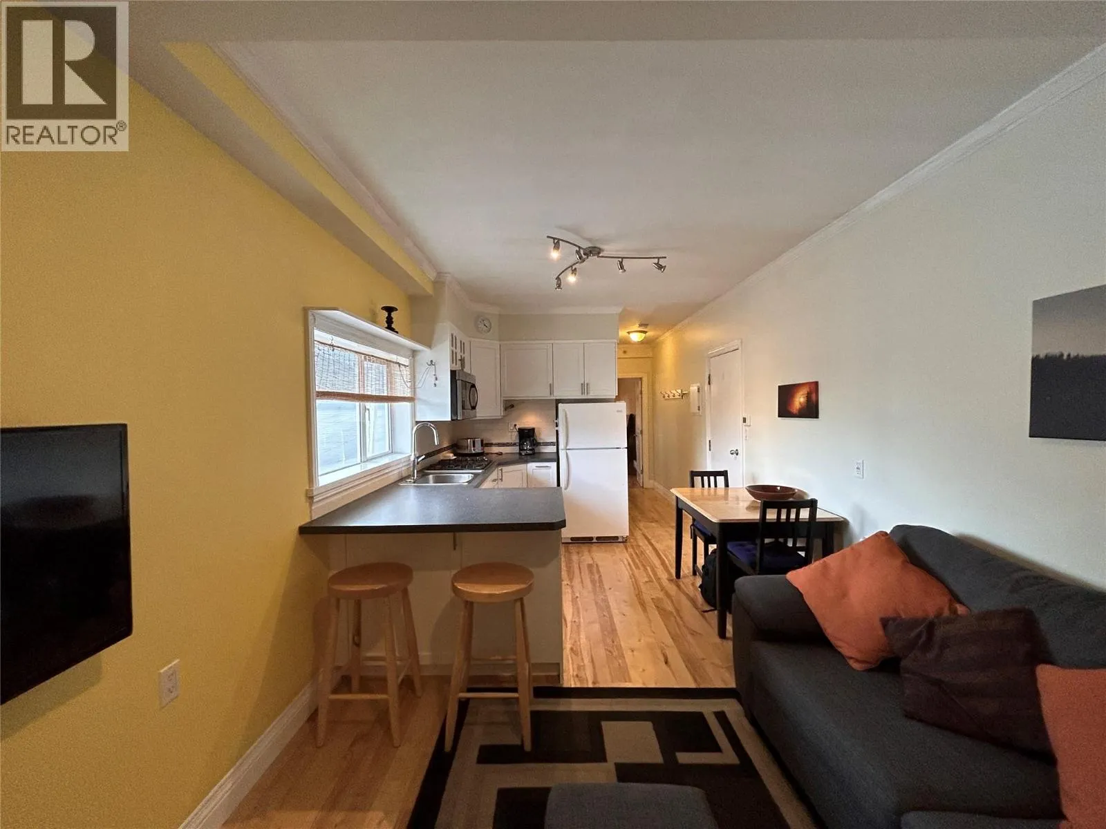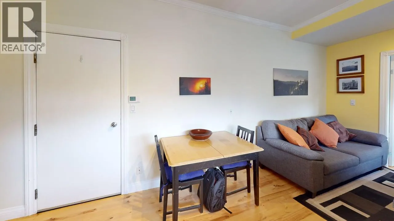 This bright welcoming condo is located in the middle of town. Everything is walkable from the heritage Wise's Apartment Building. Groceries, brewery, post office, coffee shops, book store, arena, bakery, laundromat, restaurants, shops and the winter ski bus shuttle are right there. Recently renovated, this unit has hardwood flooring, modern drywall with fresh paint, a bright kitchen that maximizes cupboard space, new appliances and a good sized updated bathroom with a full tub. There is the added bonus of a den with double doors that do duty as a second bedroom, office with a hide-a-bed or be the living room if you prefer. The main bedroom has an extra large closet with some tucked away storage. Don't miss this one. (id:27476)