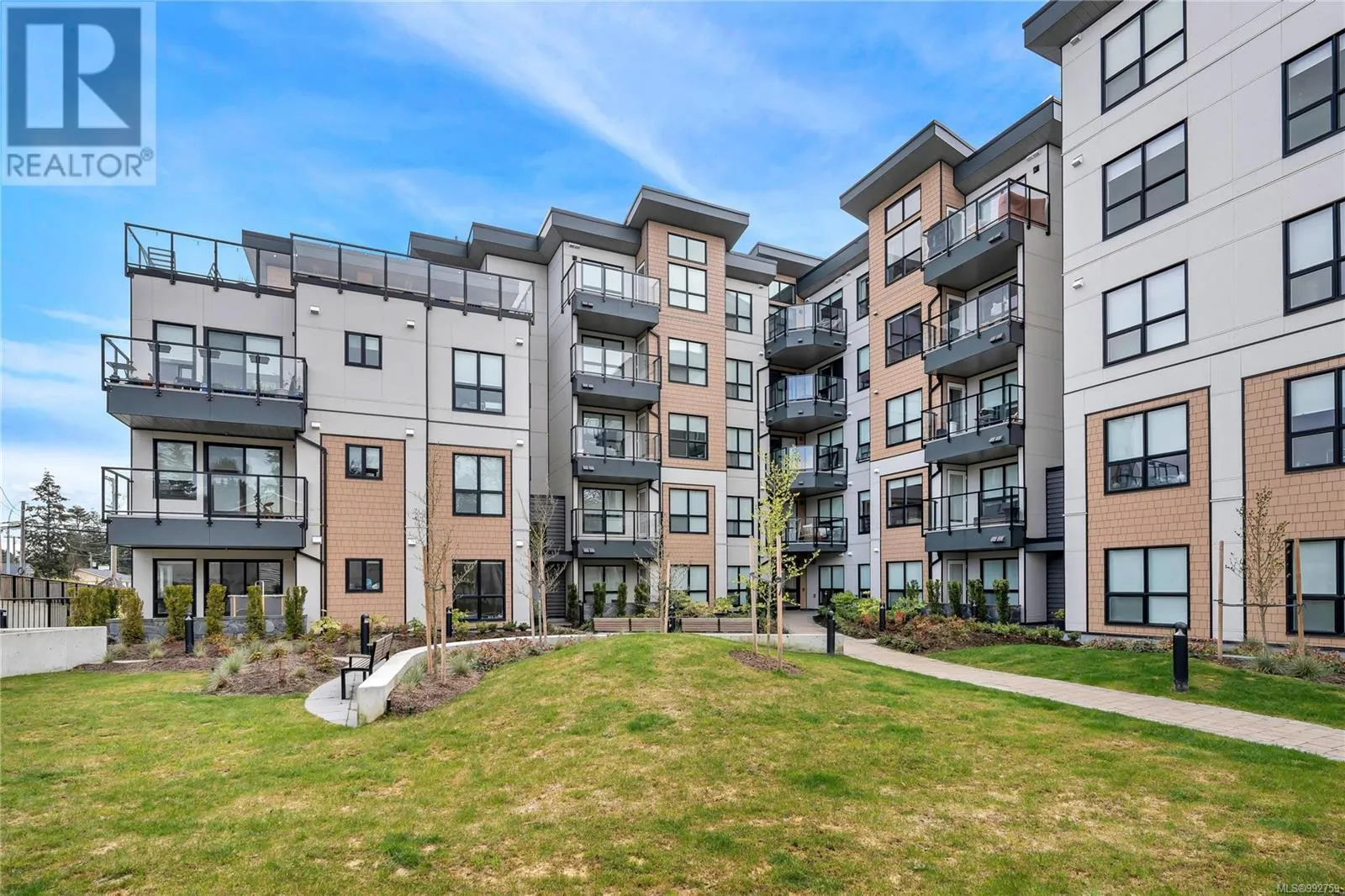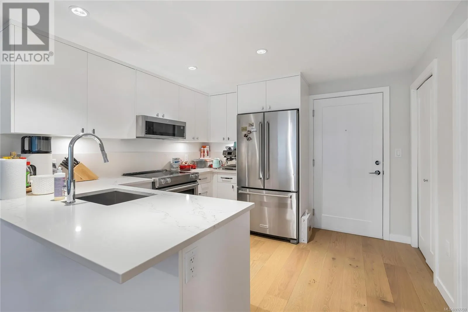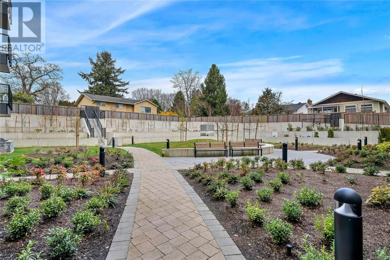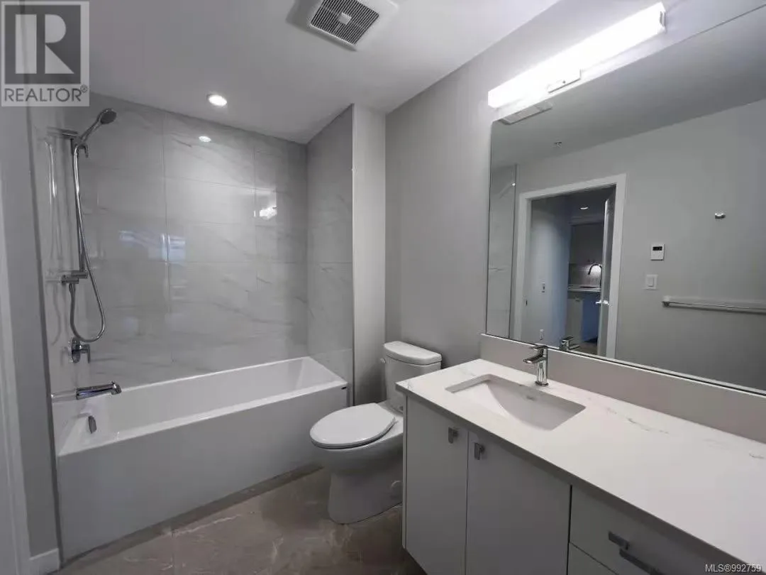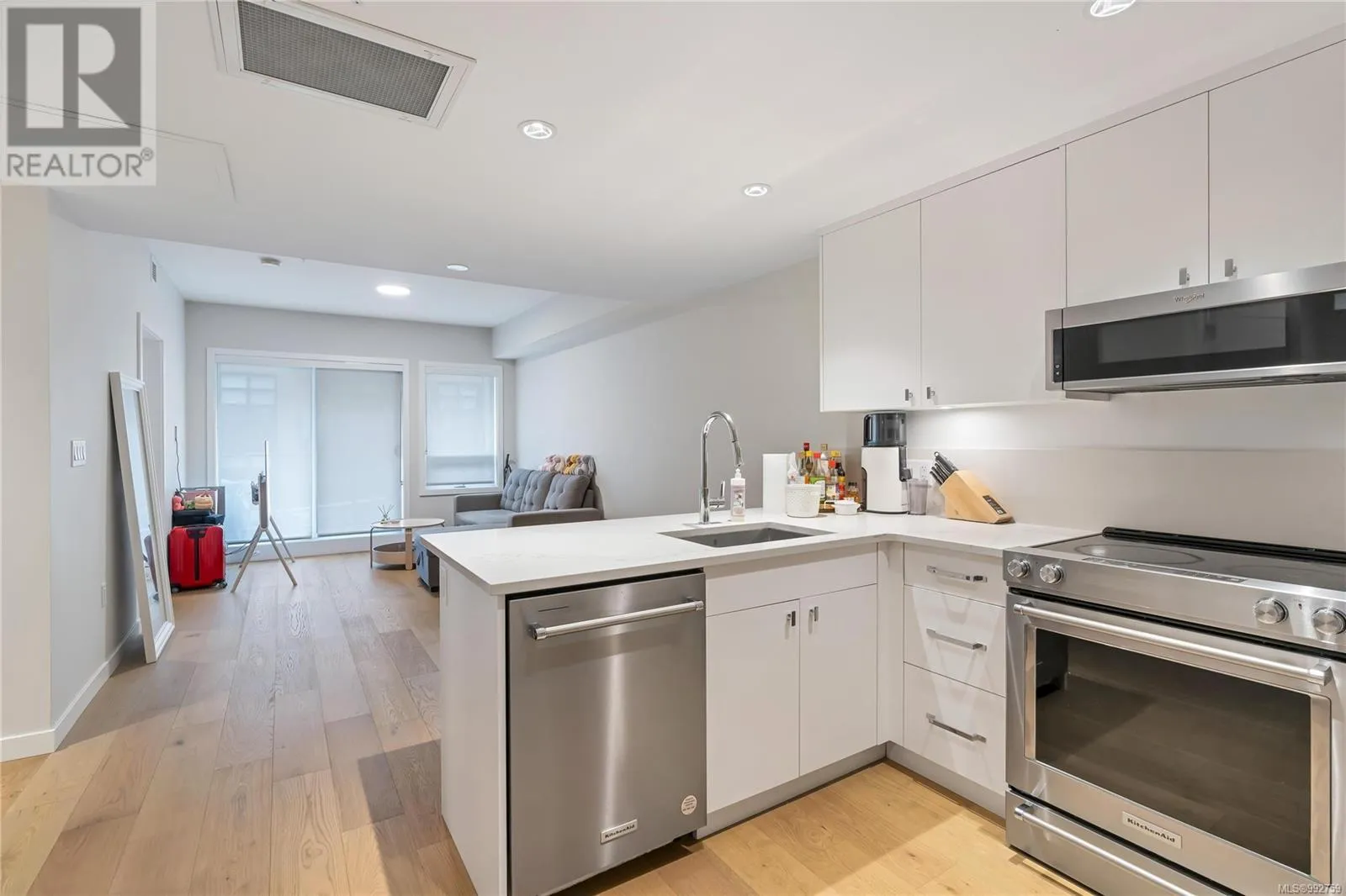 Location, Location, Location!! Welcome to The Affinity! This modern 1-bedroom PLUS DEN, 1-bathroom condo offers 738 sqft of contemporary living space with a south-facing balcony that brings in plenty of natural light. Built in 2023, this like-new energy-efficient home features hardwood flooring, and a central air heating/cooling system for year-round comfort. The sleek kitchen is equipped with high-end stainless-steel appliances and quartz countertops. Additional perks include in-suite laundry, secure underground parking with EV charging, and a separate storage locker. The Affinity is pet-friendly with no age or rental restrictions and full home warranty coverage. Located in the desirable Gordon Head area, close to UVic, parks, recreation centre, restaurants, and shopping. This is an ideal home for first-time buyers, investors, or those looking to downsize. Do not miss this opportunity! (Tenanted. Fixed-term contract till August 31, 2025. $2400 plus utilities. Showings 1-3 pm on Saturdays ONLY. Over night notice required. Pictures were taken before tenant moved in. Floor plan by Stellar Real Estate Marketing; verify if important. No lockbox; listing agent will present. Seller request no photo.) (id:27476)