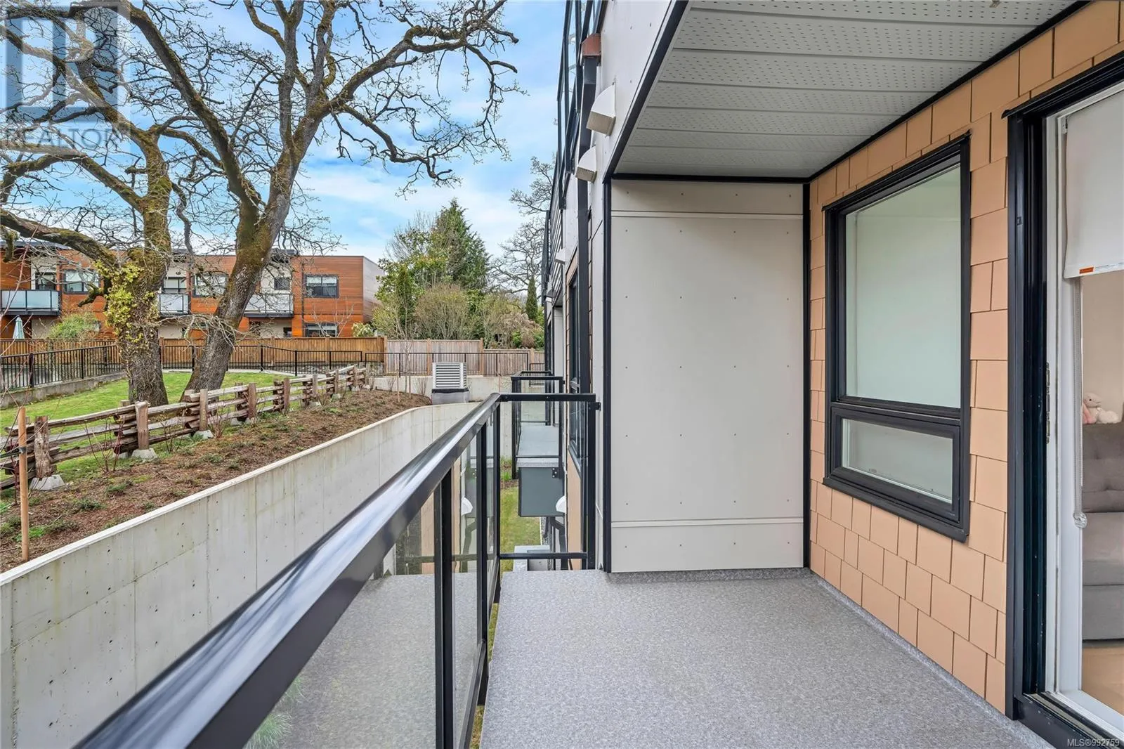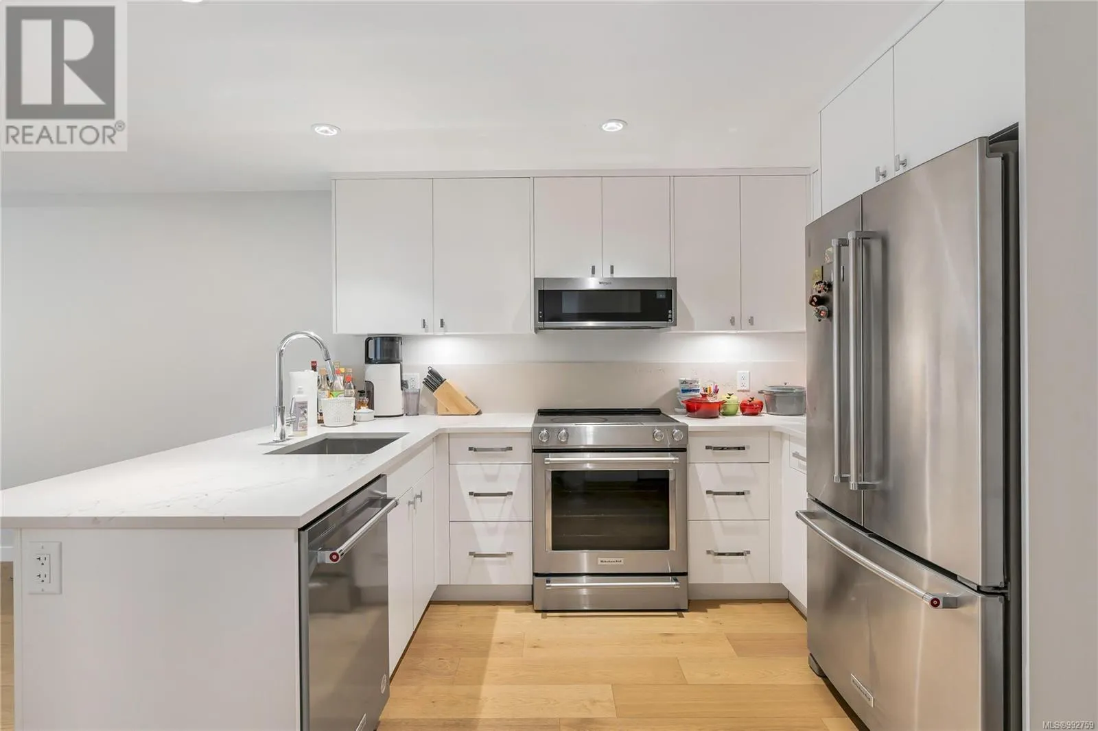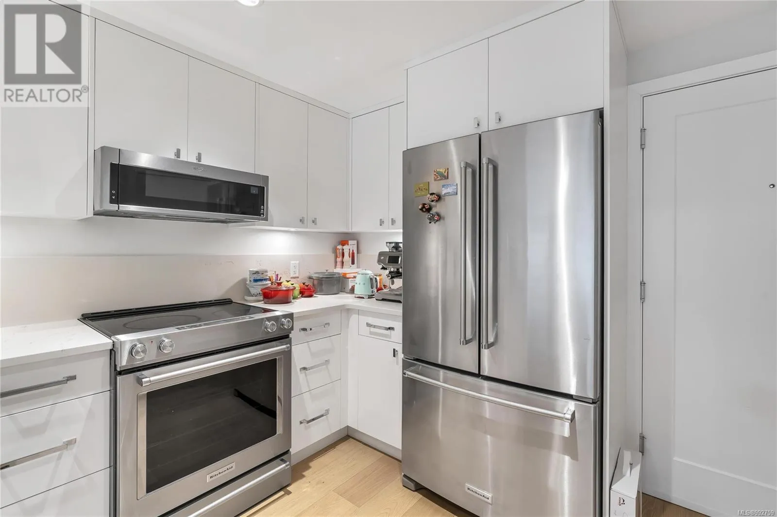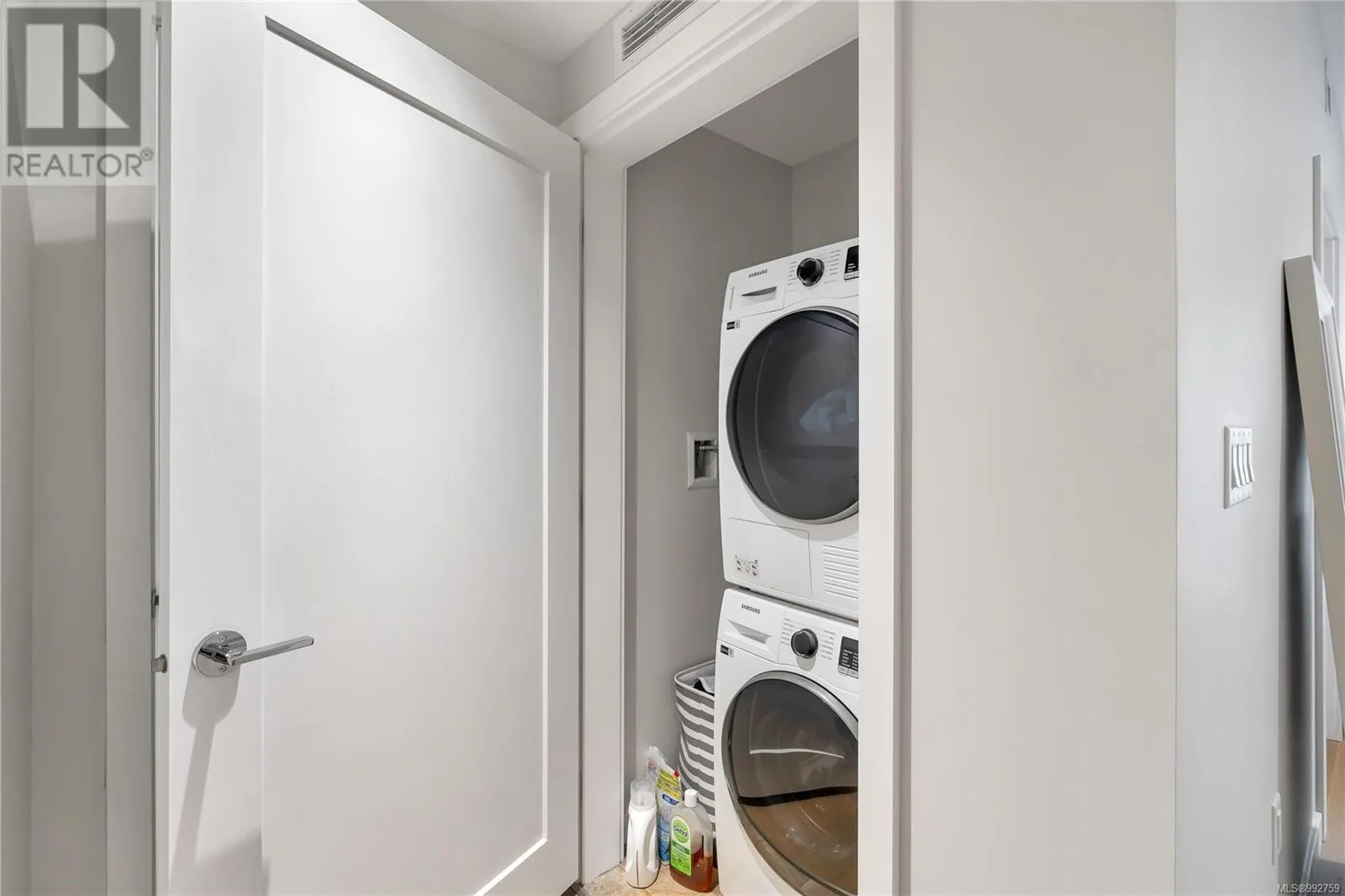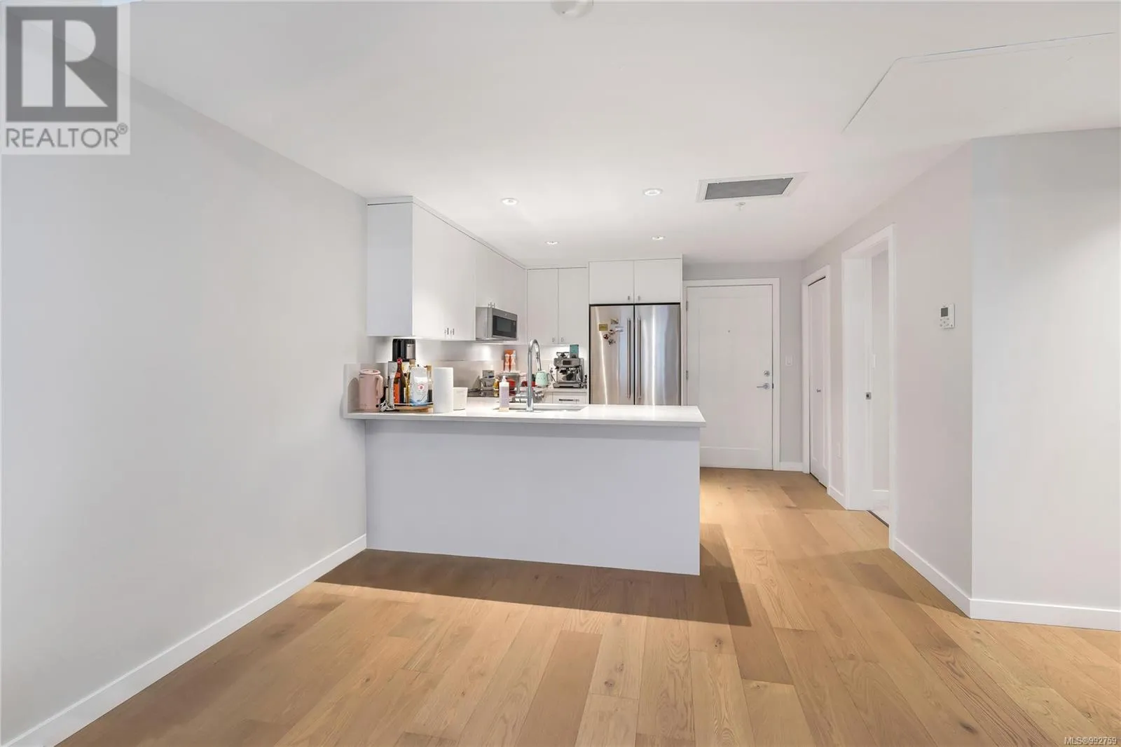 Location, Location, Location!! Welcome to The Affinity! This modern 1-bedroom PLUS DEN, 1-bathroom condo offers 738 sqft of contemporary living space with a south-facing balcony that brings in plenty of natural light. Built in 2023, this like-new energy-efficient home features hardwood flooring, and a central air heating/cooling system for year-round comfort. The sleek kitchen is equipped with high-end stainless-steel appliances and quartz countertops. Additional perks include in-suite laundry, secure underground parking with EV charging, and a separate storage locker. The Affinity is pet-friendly with no age or rental restrictions and full home warranty coverage. Located in the desirable Gordon Head area, close to UVic, parks, recreation centre, restaurants, and shopping. This is an ideal home for first-time buyers, investors, or those looking to downsize. Do not miss this opportunity! (Tenanted. Fixed-term contract till August 31, 2025. $2400 plus utilities. Showings 1-3 pm on Saturdays ONLY. Over night notice required. Pictures were taken before tenant moved in. Floor plan by Stellar Real Estate Marketing; verify if important. No lockbox; listing agent will present. Seller request no photo.) (id:27476)