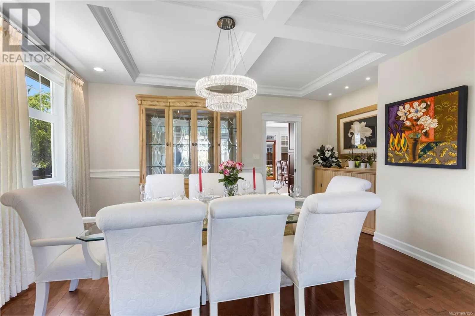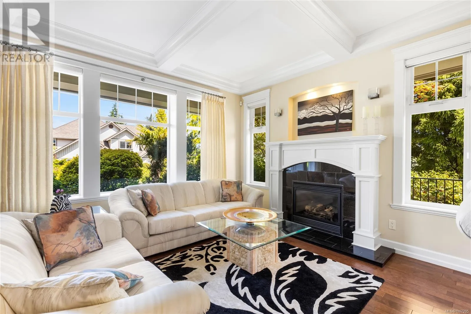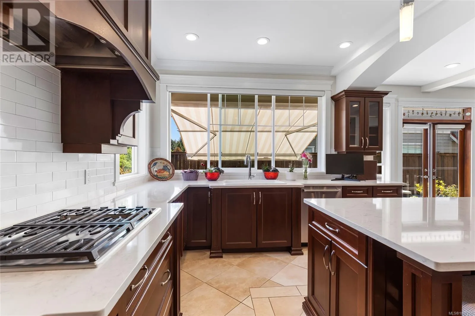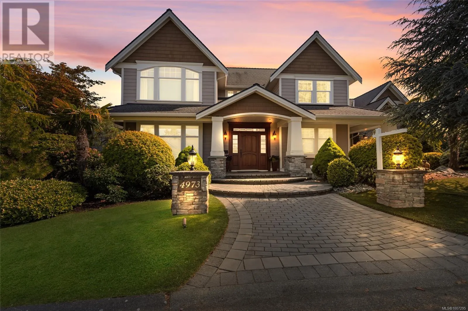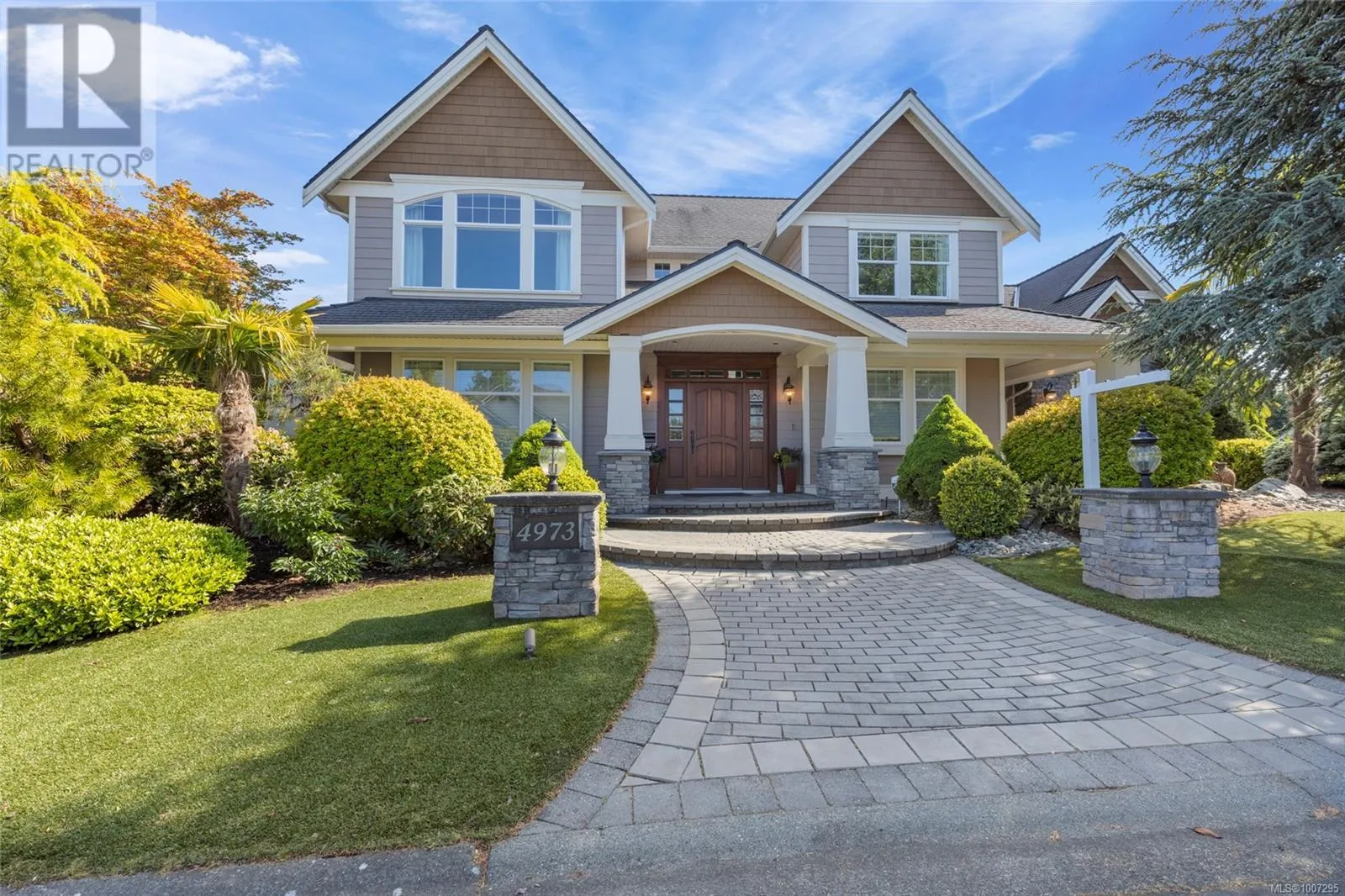 Welcome to 4973 La Quinta Place. This family home sits on a ¼-acre lot on a quiet cul-de-sac in Cordova Bay. Conveniently located within walking distance to Claremont Secondary School. Offering an impressive 5,000+ sq ft of open living space enhanced by high coffered ceilings, Cherrywood flooring, built-ins, marble tile, elegant molding details and more. Step inside to a well appointed interior where no detail has been overlooked. 5 beds, den + office, 6 bathrooms, & 2 self contained suites (1BR above garage and a 1BR + den garden level/Nanny suite) Ideal for multi-generational families or income generator. Thoughtful upgrades incl. coffered ceilings, quartz countertops, porcelain sink, gas cooktop, walk-in pantry, custom wine pantry, LED Light Fixtures, expansive laundry room, triple car garage, ducted heat pump, central vac, and a theatre room downstairs. The etched-glass patio doors lead to a textured concrete patio, covered by an electric awning for those hot summer days. The home is surrounded by a lush mature garden with stunning majestic palm trees and a low maintenance AstroTurf lawn, featuring a putting green for the Golf lover! (id:27476)