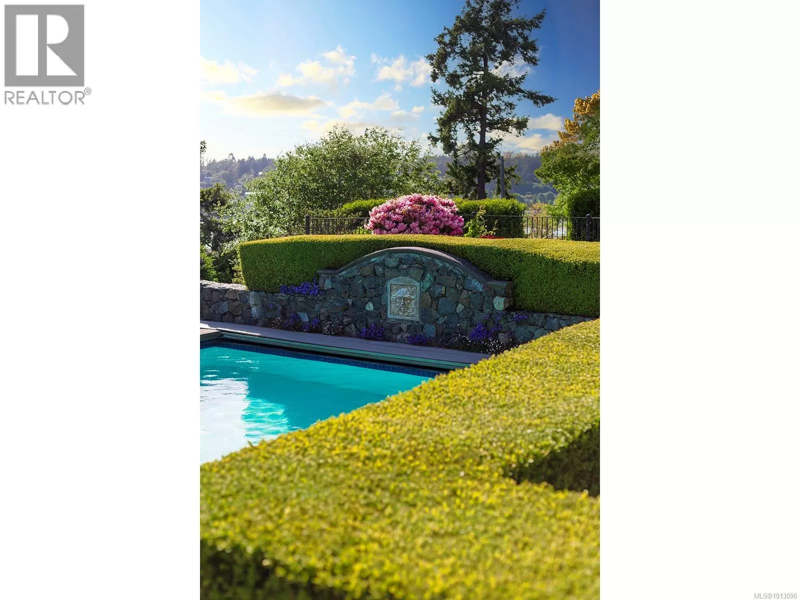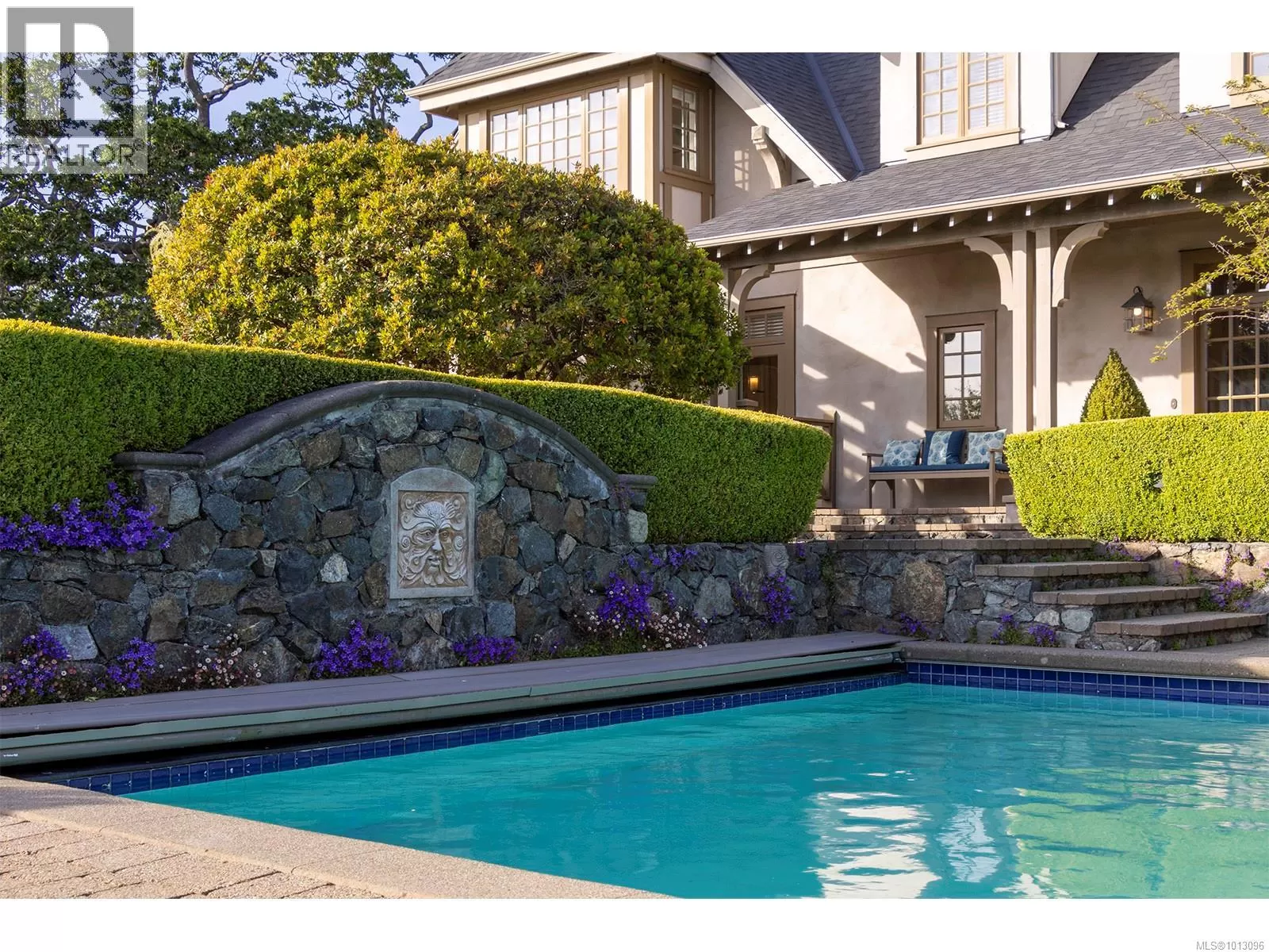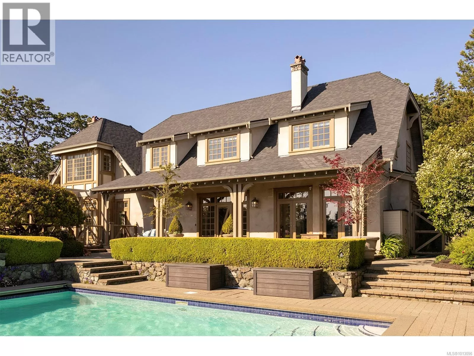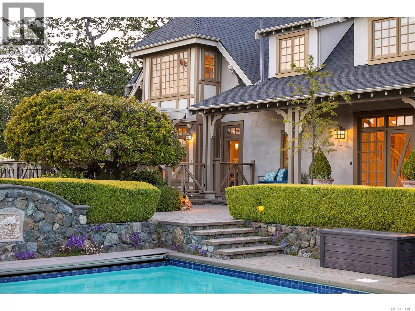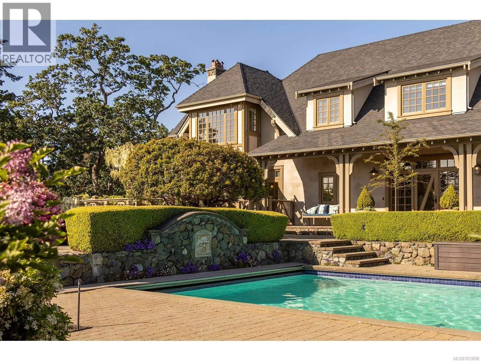 Situated in the heart of Ten Mile Point, this captivating custom residence blends timeless elegance with architectural mastery and the finest materials. Positioned high with views of Cadboro Bay, this .50-acre south-facing estate is the perfect setting for the 5,000+ sq. ft. home, complete with manicured gardens, stone walls, water features and a custom in-ground pool. Designed for seamless indoorâoutdoor living, the main floor offers a refined yet relaxed lifestyle, enhanced by the areaâs unique microclimate of warmer days & sun-filled evenings. Principal rooms grace the main level, with 4 bedrooms and 3 baths above, and an additional bed & bath below. The sumptuous primary retreat spans its own wing with a spa-inspired bath, fireplace, private sitting area and breathtaking ocean views from your bedside. A grand gourmet kitchen anchors the home with dining-area fireplace, expansive island and direct access to a wisteria-covered heated deck, expansive terraces and tranquil fountains. (id:27476)