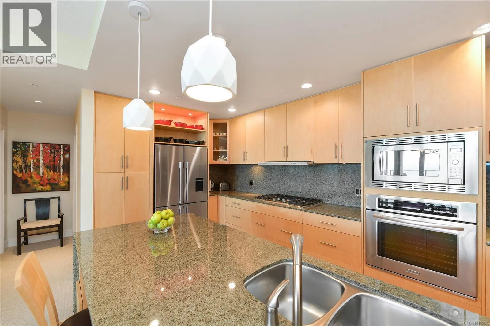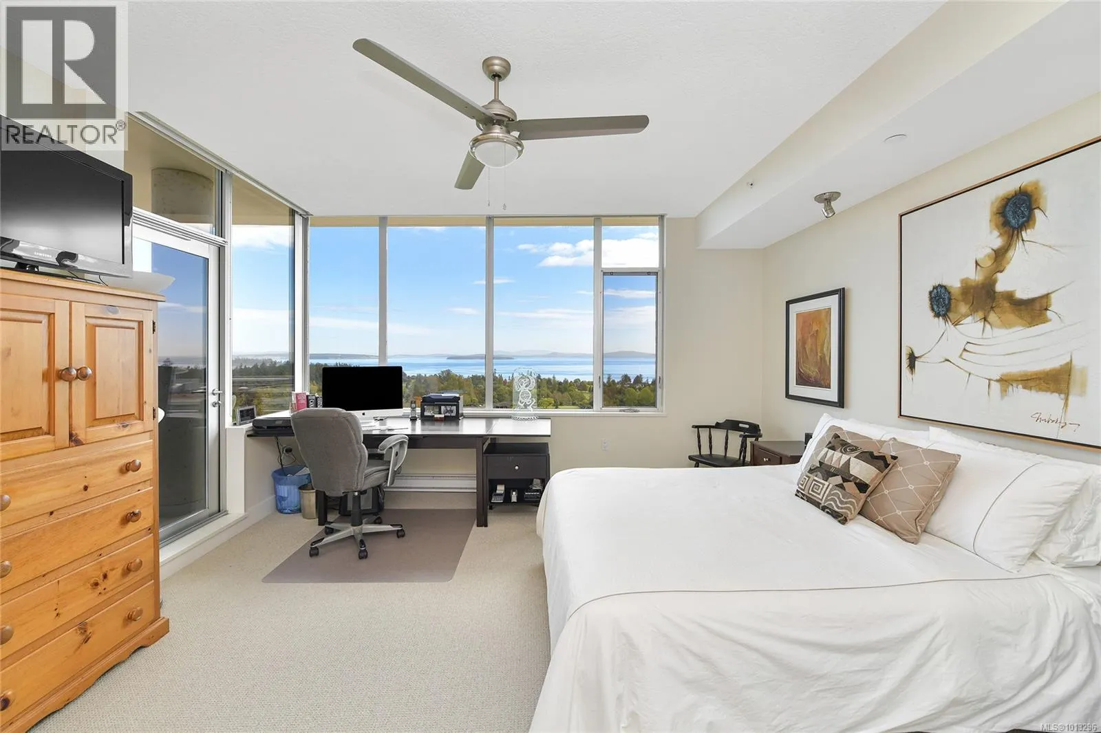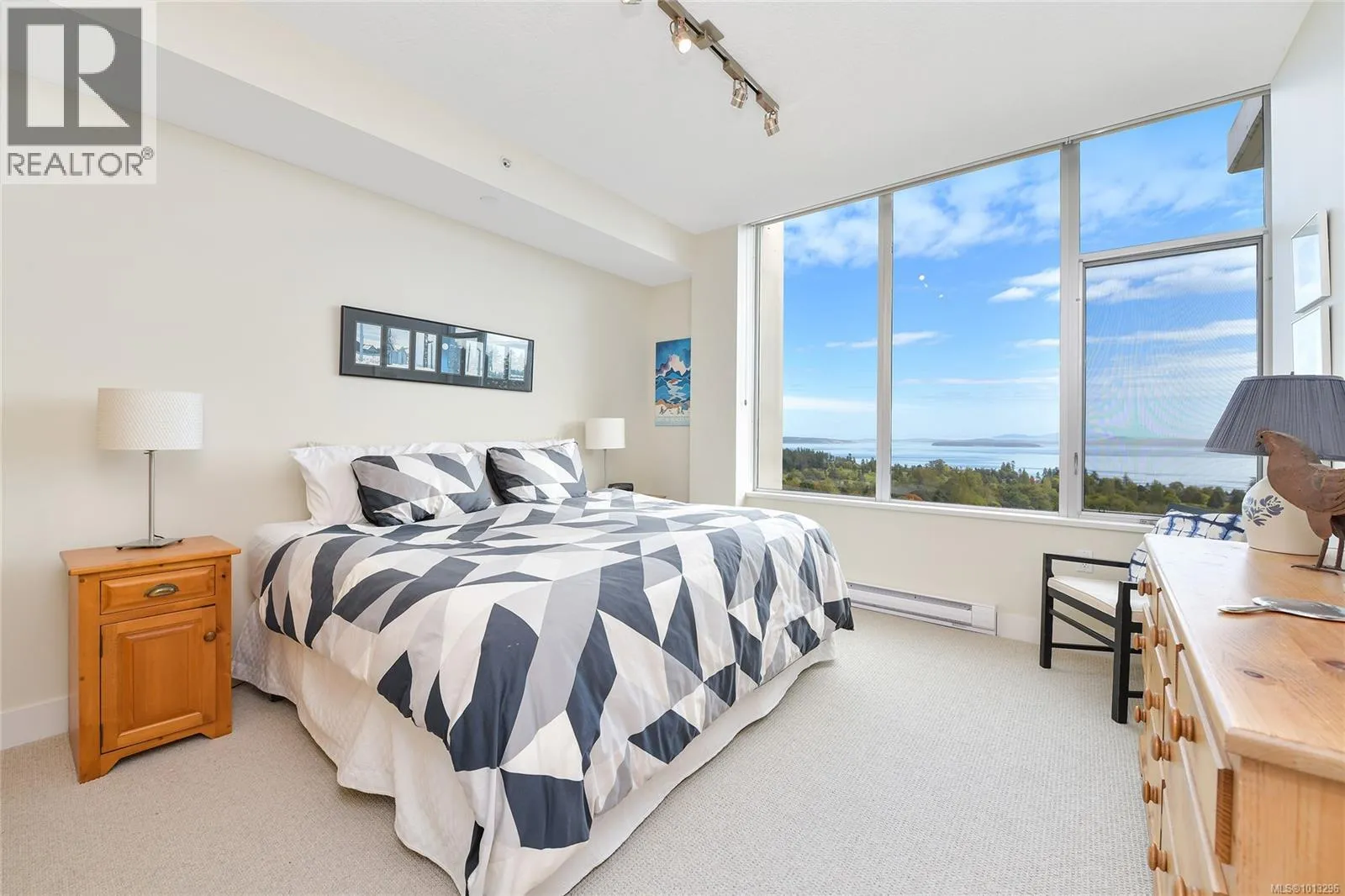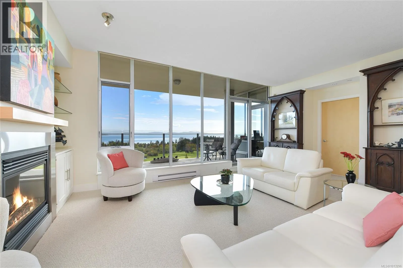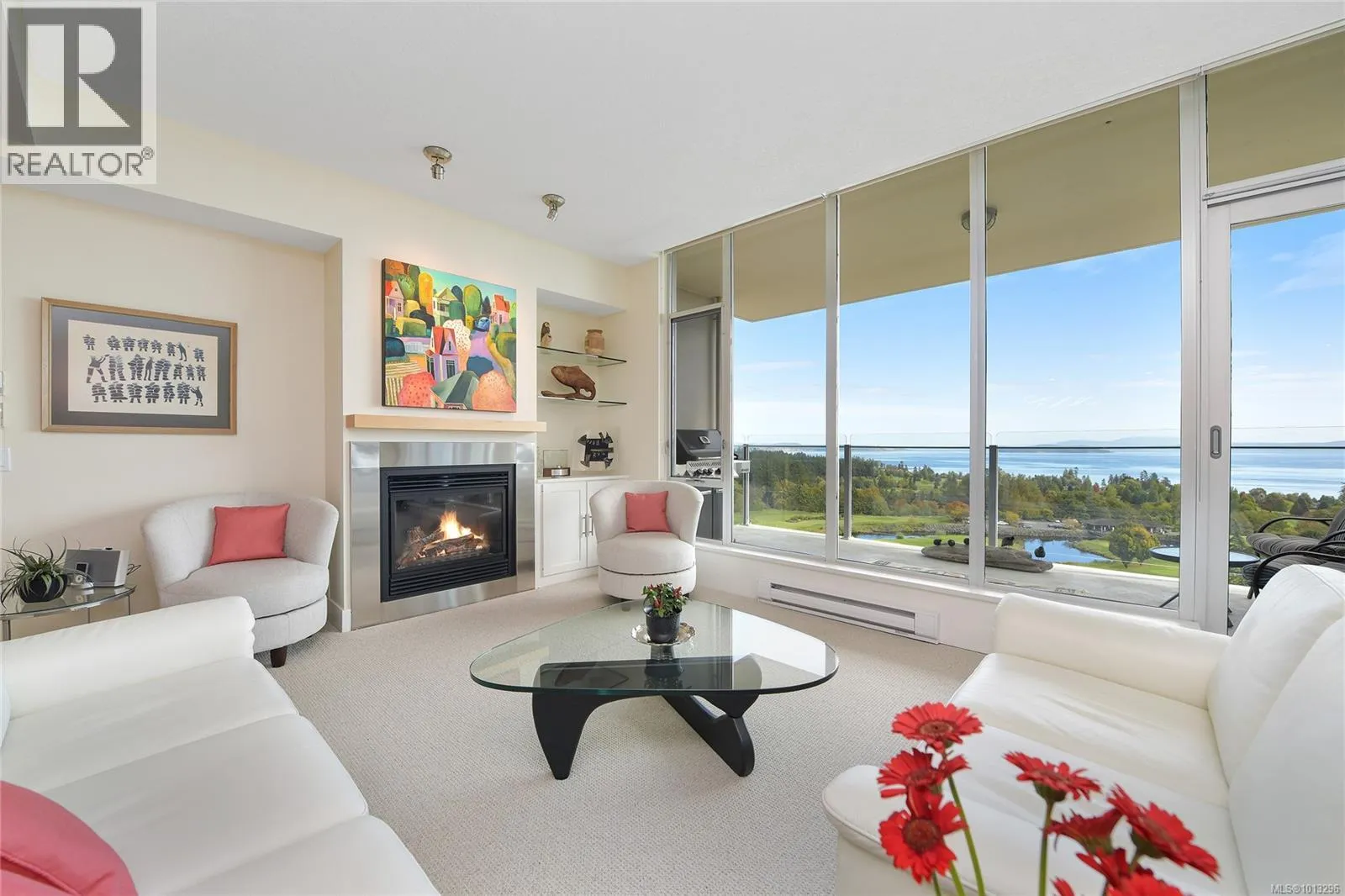 SAYWARD HILL offers Victoria's best VIEWS & LIFESTYLE, overlooking world-class golf at Cordova Bay, sandy beaches, walking/biking trails, shops at Mattick's Farm all nearby. This premiere, 2008 JAWL DEV. concrete/steel building is sought-after with its spectacular views, amazing layout, quality finishing and perfect positioning. An elegant home, meticulously maintained offering 2BD, 2BA, Media Room plus Home Office in 1,856sf, with designer inspired updates inc: paint, wool carpeting, lighting, motorized blinds, appliances, HWT and move-in ready! No compromising with the spacious kitchen, 11' granite island, gas cooktop, eating bar and gas BBQ outlet for alfresco dining on the covered balcony offering views of Mt. Baker, Hunt Valley, the islands and mountains beyond. Retreat in the luxurious primary bedroom with access to the balcony, inspiring views and elegant ensuite with soaker tub, separate shower, dual sinks and marble counter. Secure U/G parking with EV Charging & storage too! (id:27476)