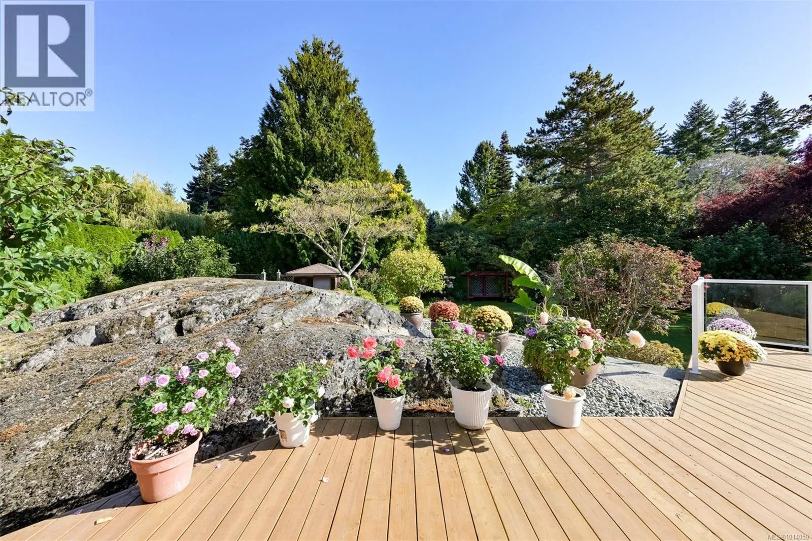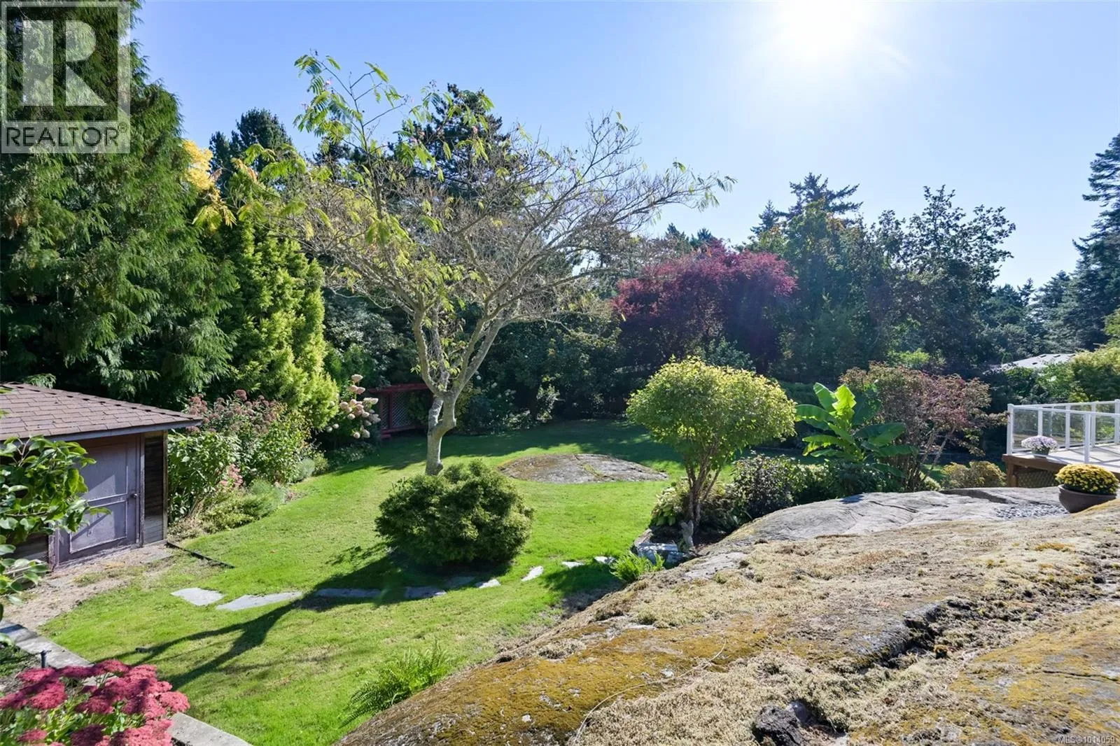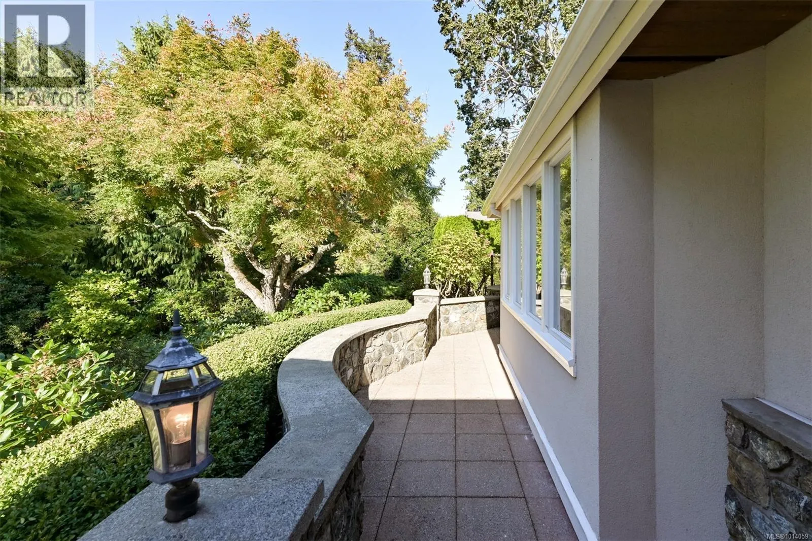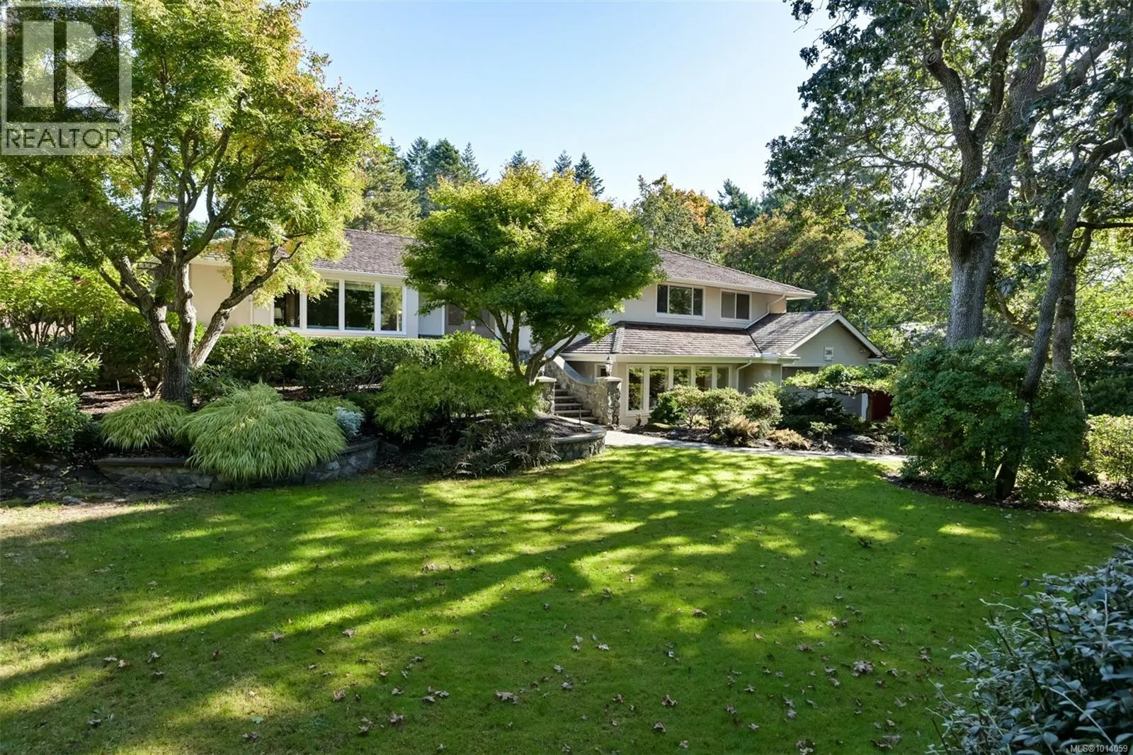 Situated in the desirable Ten Mile Point area, this well-maintained home rests on a half-acre of landscaped, terraced grounds. The upper level offers 4 bedrooms and 3 bathrooms, while the lower level includes a 5th bedroom, additional bathroom, and spacious family room. The property features manicured gardens, cedar gates, stone terraces, and a newer deck, creating a private and inviting outdoor setting. Mechanics include gas fired hot water heat w/9 zone controls, a 5000 watt emergency generator system, updated electrical & zoned irrigation system, ensuring comfort and peace of mind. A rare opportunity to enjoy a private, park-like retreat just minutes from beaches and the vibrant lifestyle of Cadboro Bay Village. (id:27476)