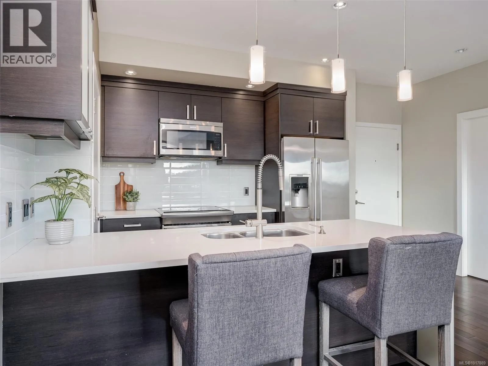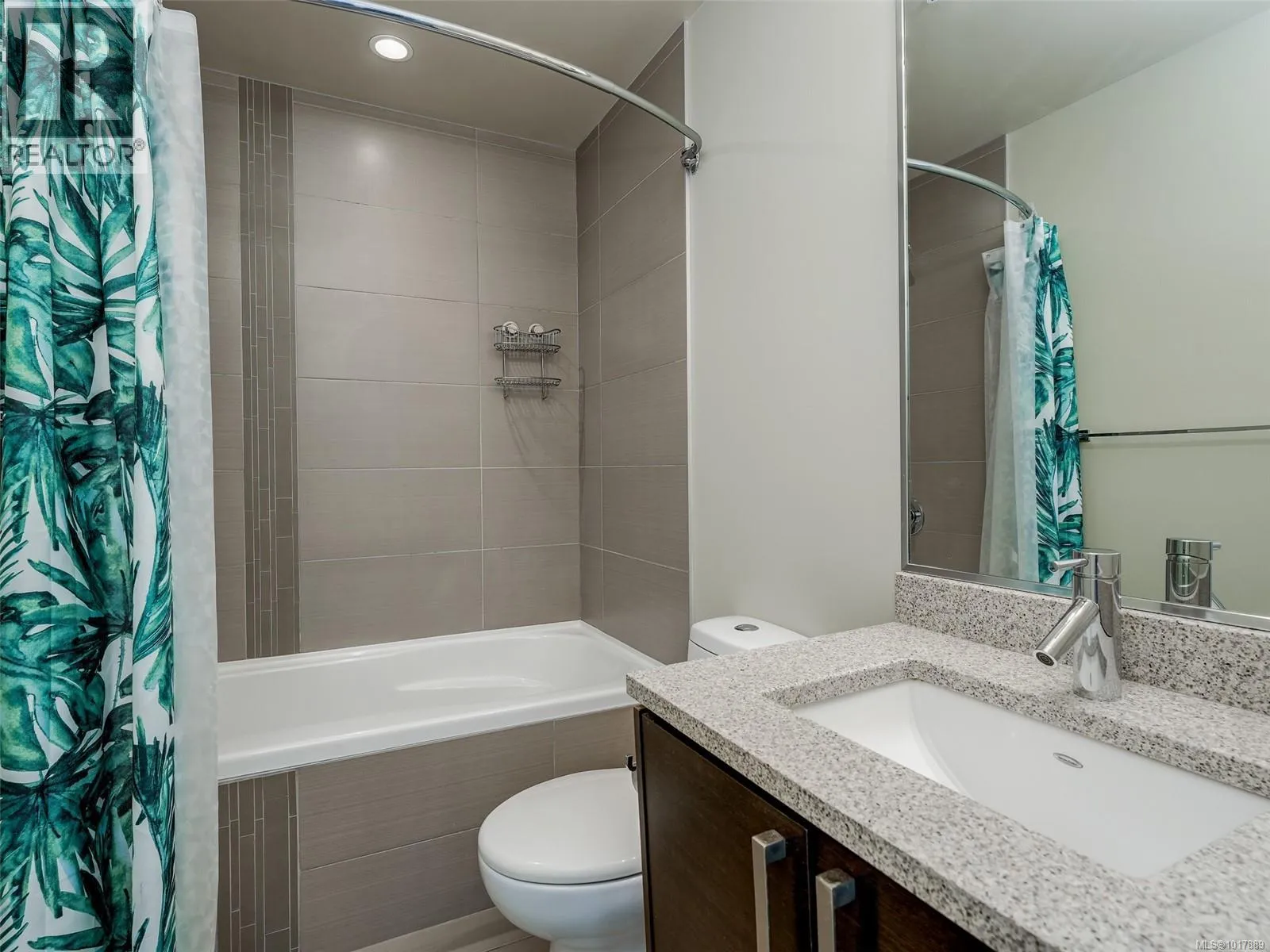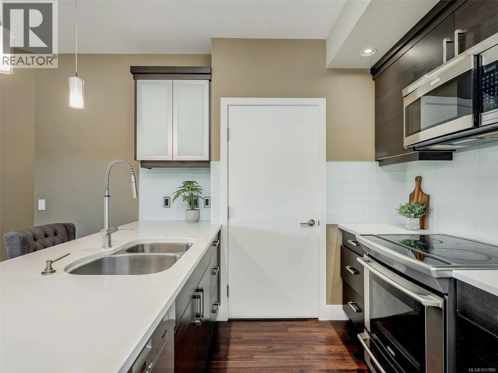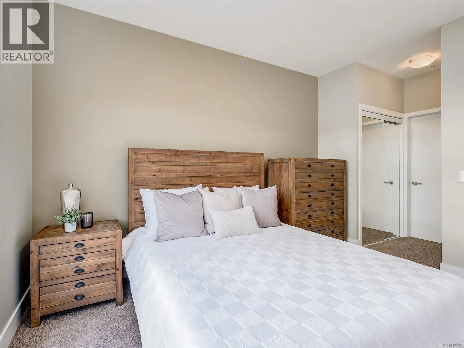 Direct and unobstructed OCEAN VIEWS from all principle rooms in this bight and modern 2 bed, 2 full bath condo. The ''Promenade'' is situated in the heart of the CADBORO BAY VILLAGE only a few steps from the sandy beach @ Gyro Park. In fact, you can watch kids playing on the Red Octopus from your South Facing Balcony. Inside you will find an amazing floor plan with the bedrooms on opposite sides of the open kitchen & living room. The features include hardwood flooring, quartz countertops, wood cabinets w/soft close doors, S/S appliances, in-suite laundry, 9' ceilings and heated tile floors in both bathrooms. A gorgeous ensuite off the master bedroom and convenient in-suite laundry make this a very comfortable place to live. Also, 1 covered parking stall and a secure storage locker are included. Walking distance to the University of Victoria and so many other amenities like Pepper's Foods, Smuggler's Cove Pub, and much more. Pets and rentals allowed. Book a viewing while you still can! (id:27476)