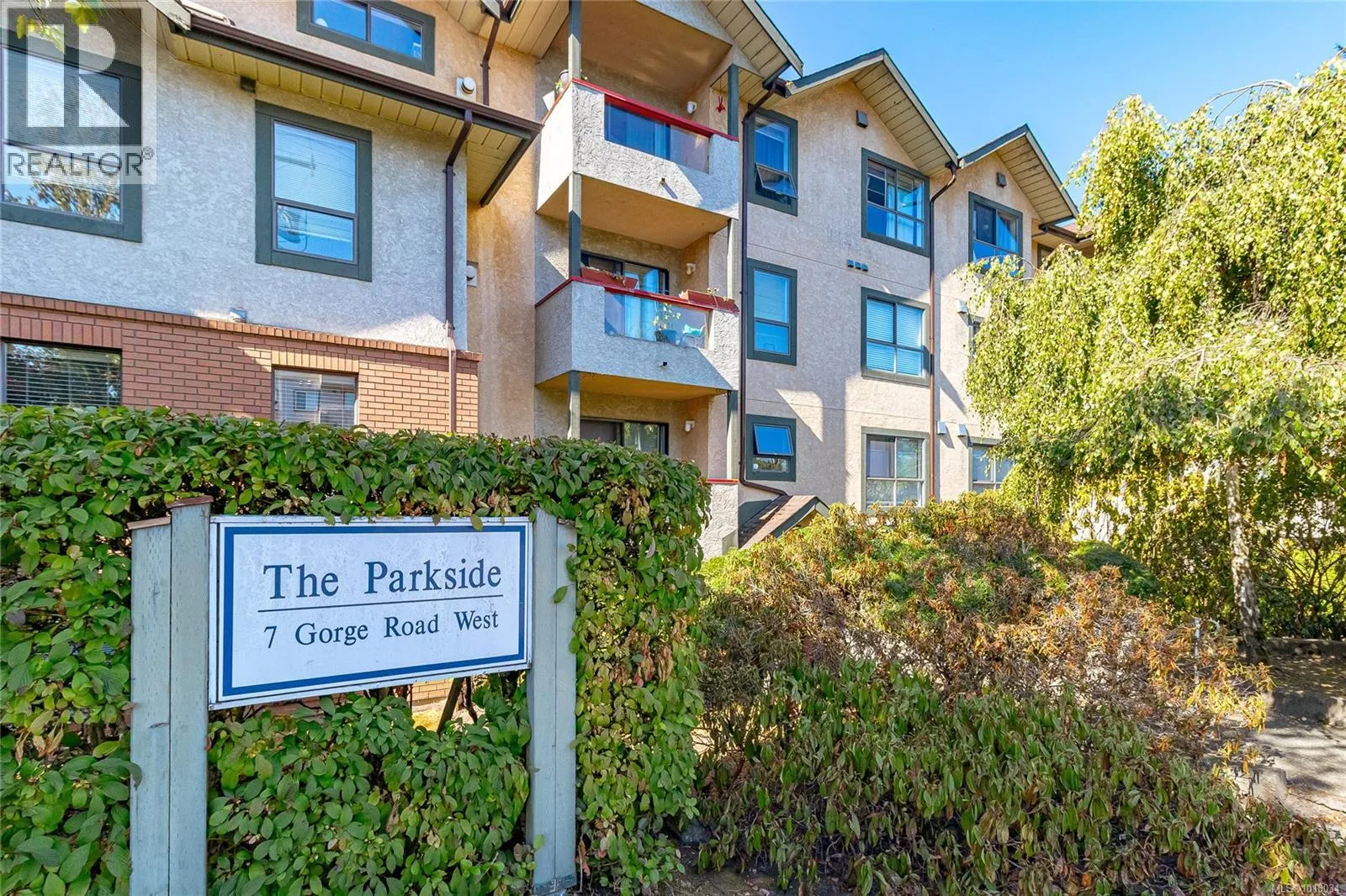 Welcome to 7 Gorge Rd. West, The Parkside. This very bright and very spacious one bedroom unit is a pure delight to show! This strata lot boasts over 800 sq. ft. with a great layout. Everything you need and want in your first home, including modern kitchen with eating space, inline living and dining area, cozy gas fireplace, plenty of storage, in-suite laundry, and a deck for barbequing. All this in a well-maintained building with more storage and underground secure parking. The well-run strata has a large contingency fund, one cat or dog up to 10 kg. allowed and no age restrictions. You'll love the area, close to downtown, parks, shopping, and restaurants. Don't delay, this residence offers a great value proposition in today's market! (id:27476)