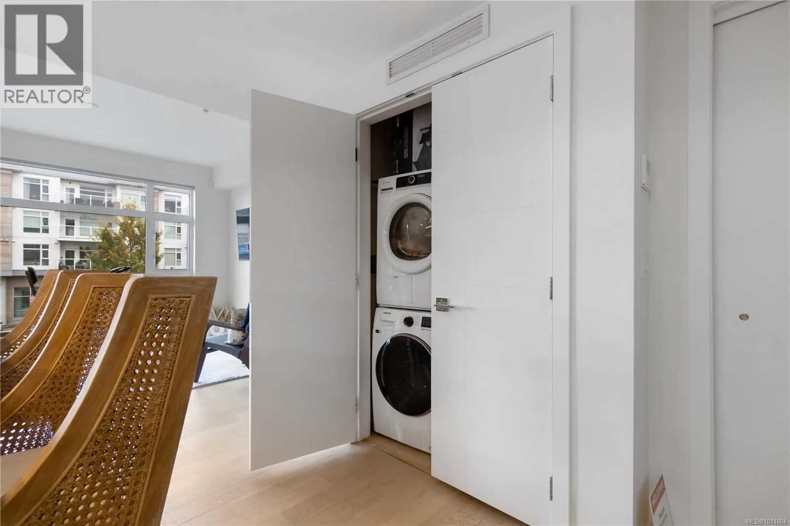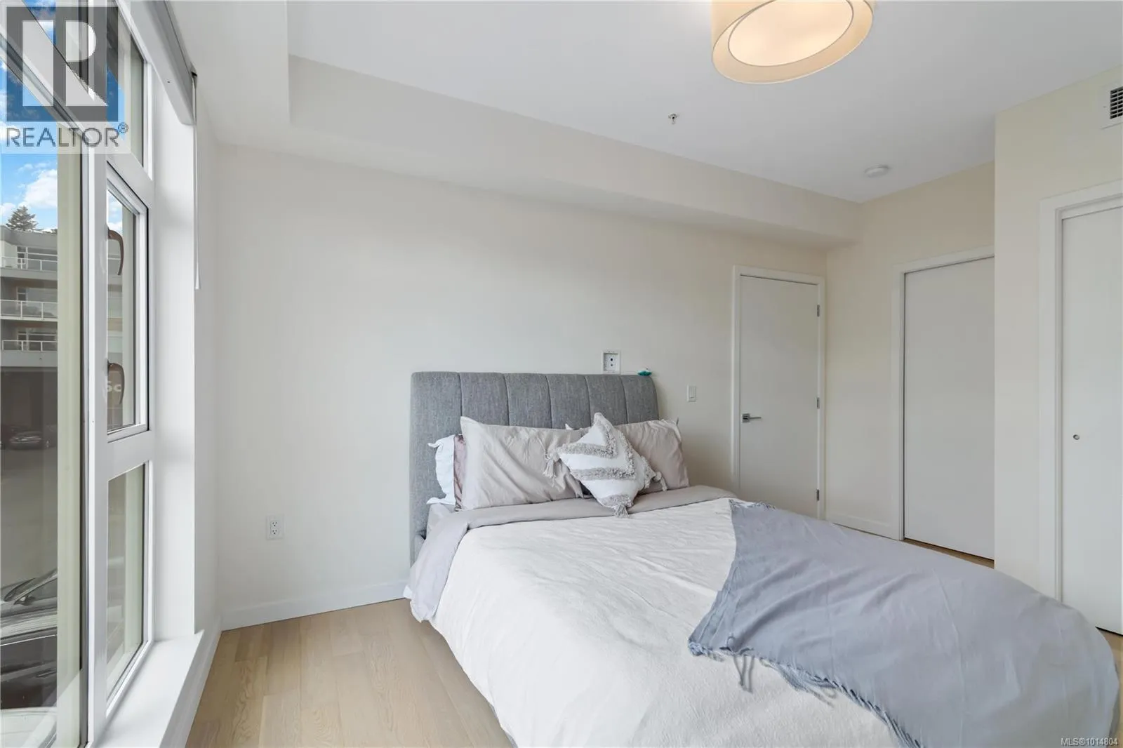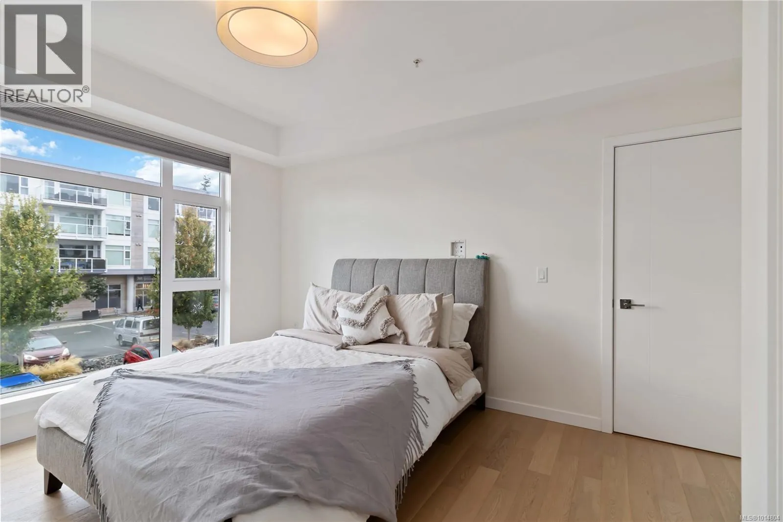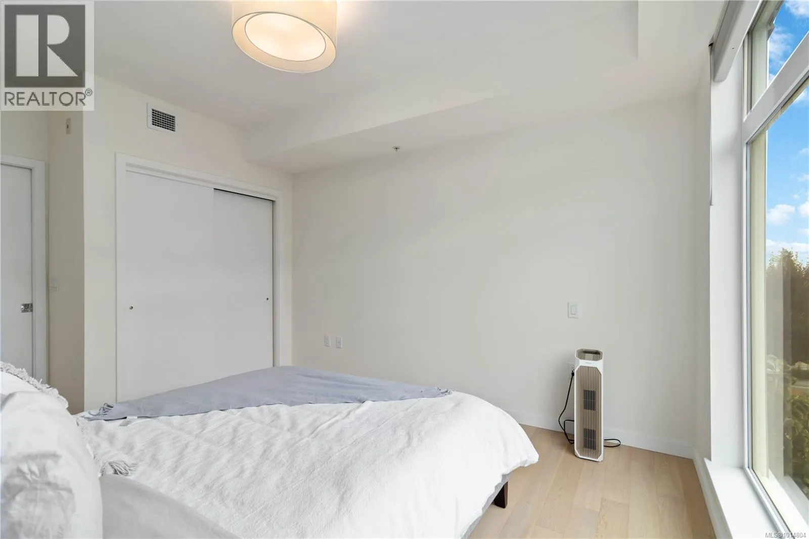 Seaside luxury living at the Haro in highly sought out Cordova Bay community. Generous accommodating floor plan offers a spacious living area & kitchen boasting quartz counter tops with a large island for entertaining, stainless appliances, built-in full height pantry, LED lighting and soft close cabinets. This 1 bed/1 bath 842 sqft unit is packed with tons of natural sunlight and 9 ft ceilings, engineered hardwood flooring and floor to ceiling windows.. Enjoy your south facing sun drenched balcony with ocean views. Walk into the ample sized bedroom with a beautiful spa like 6 piece ensuite with heated floors. Convenient in-suite washer & dryer, secure underground parking with secure storage included. Don't miss the rare chance to call this immaculate unit your new home! (id:27476)
