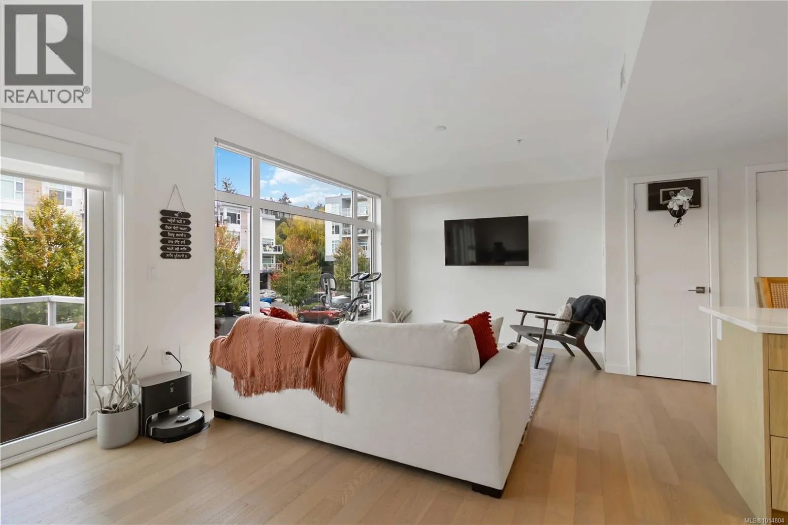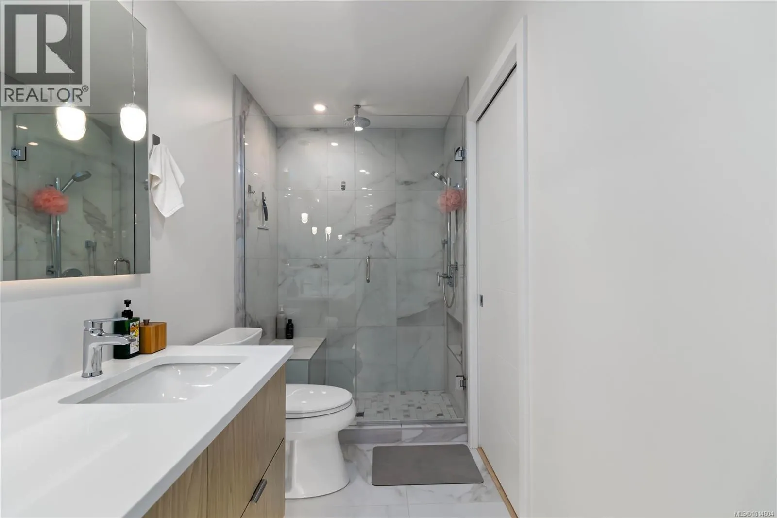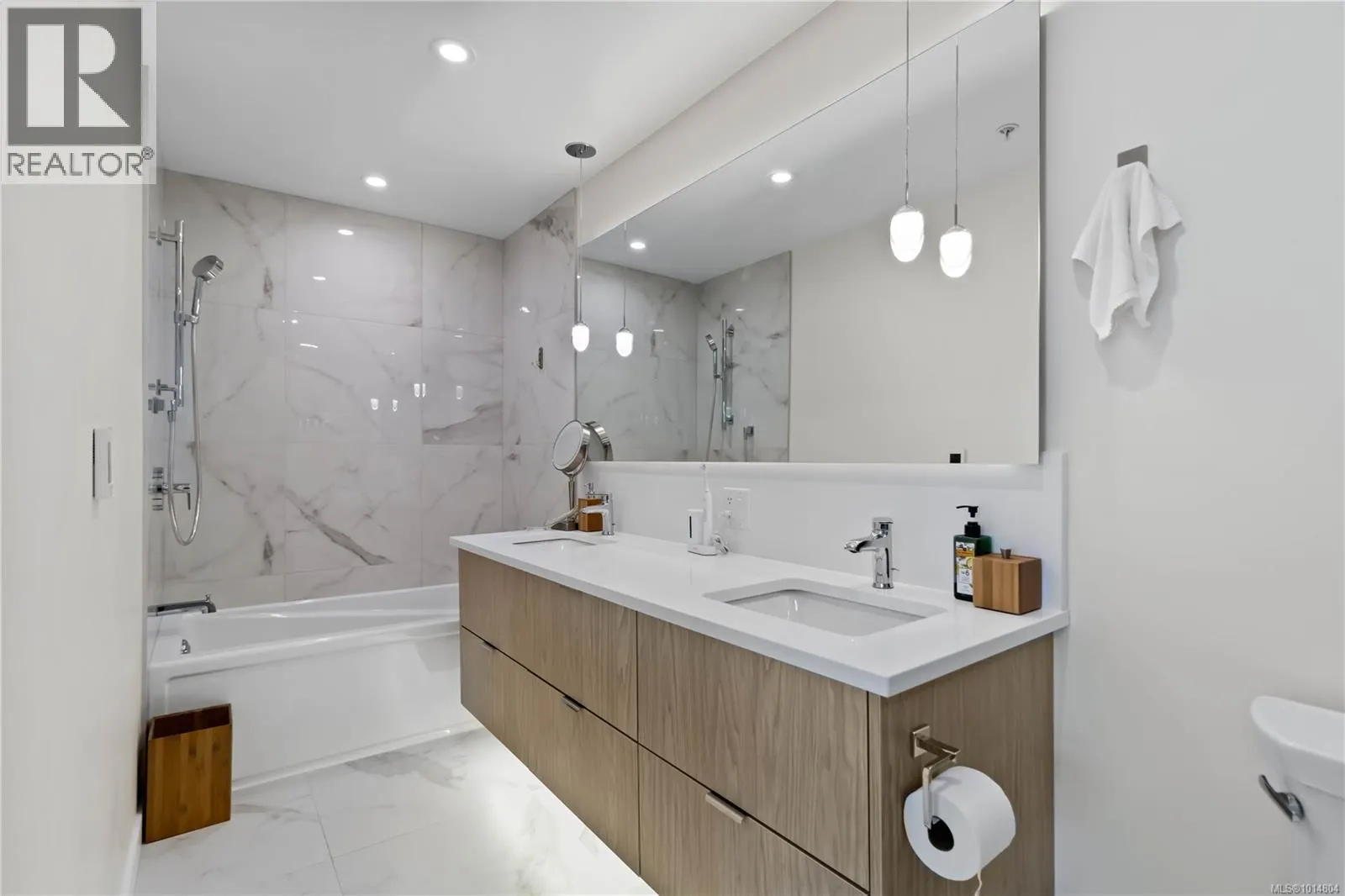 Seaside luxury living at the Haro in highly sought out Cordova Bay community. Generous accommodating floor plan offers a spacious living area & kitchen boasting quartz counter tops with a large island for entertaining, stainless appliances, built-in full height pantry, LED lighting and soft close cabinets. This 1 bed/1 bath 842 sqft unit is packed with tons of natural sunlight and 9 ft ceilings, engineered hardwood flooring and floor to ceiling windows.. Enjoy your south facing sun drenched balcony with ocean views. Walk into the ample sized bedroom with a beautiful spa like 6 piece ensuite with heated floors. Convenient in-suite washer & dryer, secure underground parking with secure storage included. Don't miss the rare chance to call this immaculate unit your new home! (id:27476)