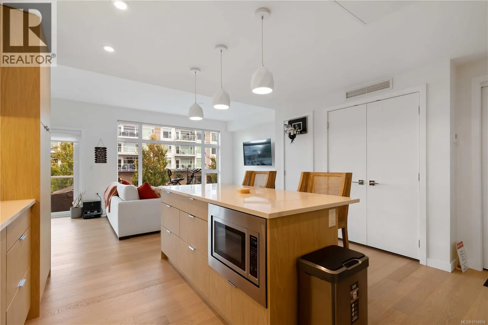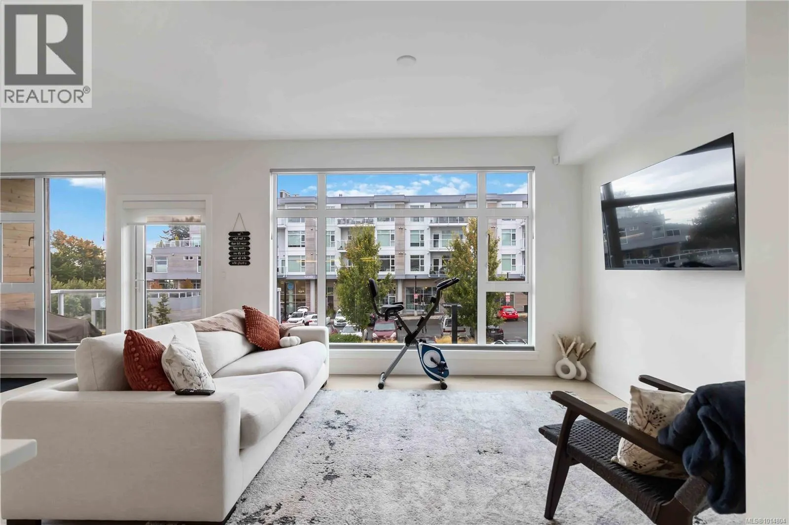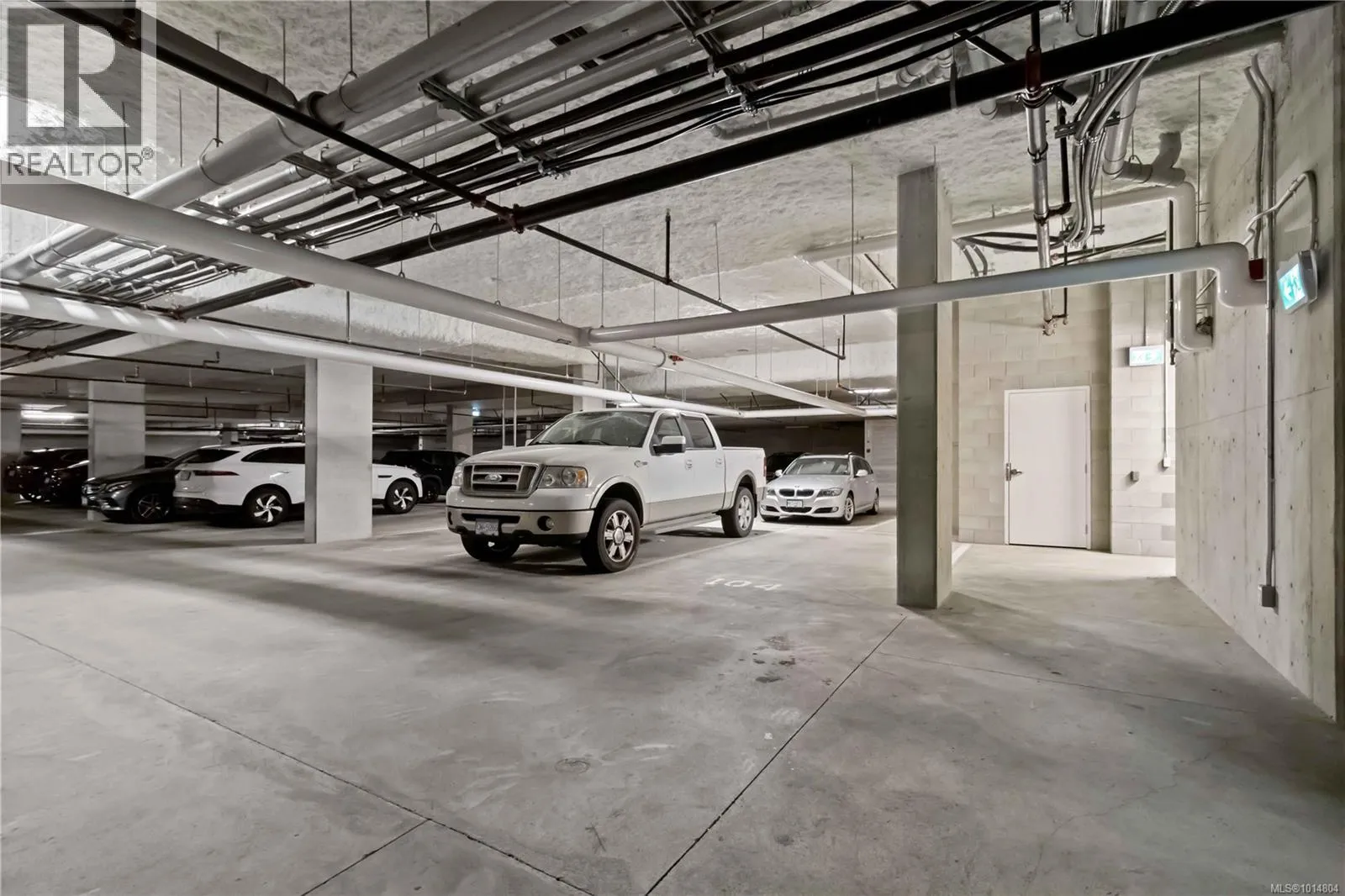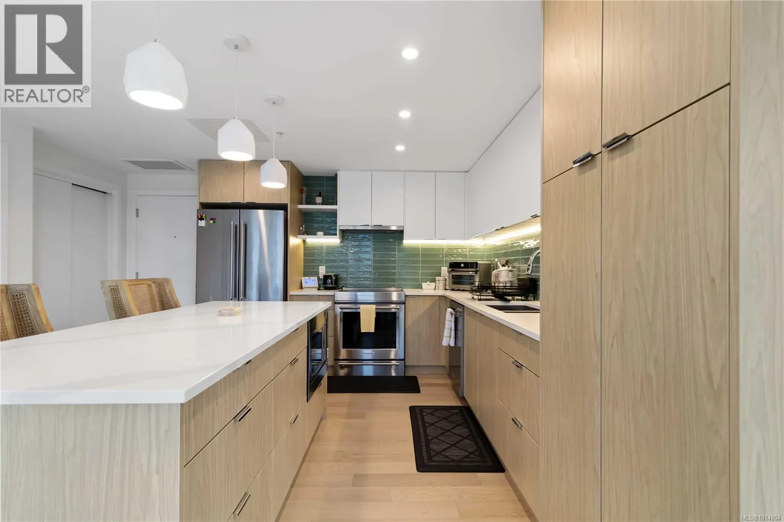 Seaside luxury living at the Haro in highly sought out Cordova Bay community. Generous accommodating floor plan offers a spacious living area & kitchen boasting quartz counter tops with a large island for entertaining, stainless appliances, built-in full height pantry, LED lighting and soft close cabinets. This 1 bed/1 bath 842 sqft unit is packed with tons of natural sunlight and 9 ft ceilings, engineered hardwood flooring and floor to ceiling windows.. Enjoy your south facing sun drenched balcony with ocean views. Walk into the ample sized bedroom with a beautiful spa like 6 piece ensuite with heated floors. Convenient in-suite washer & dryer, secure underground parking with secure storage included. Don't miss the rare chance to call this immaculate unit your new home! (id:27476)