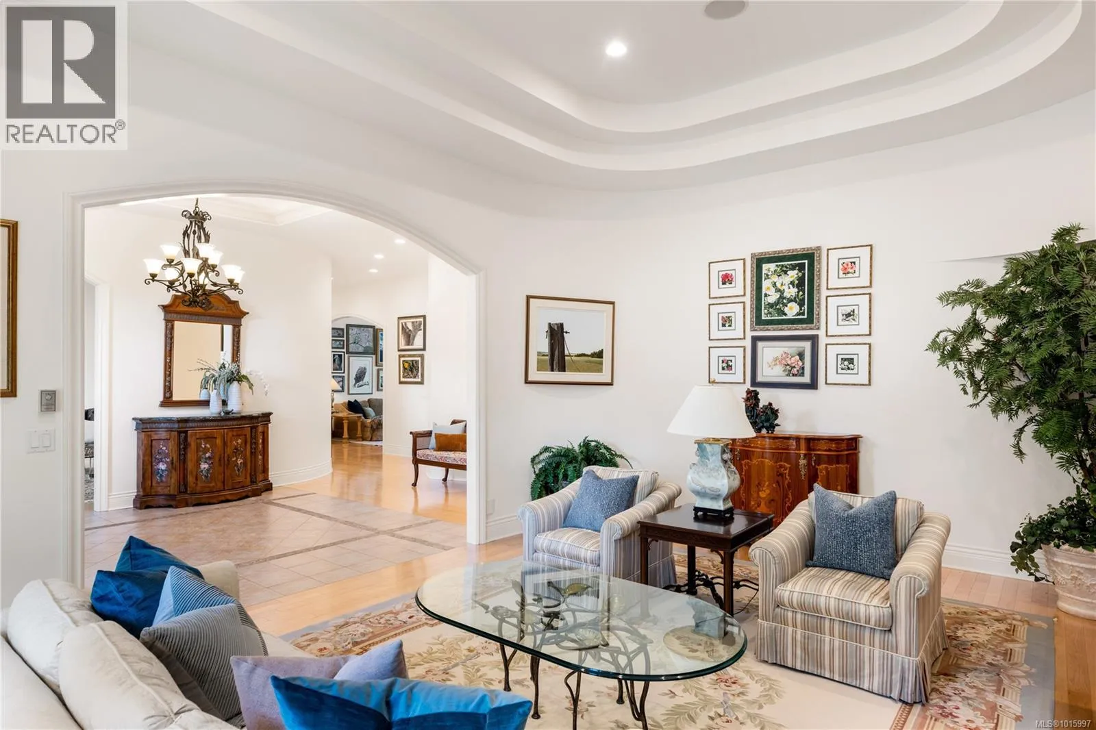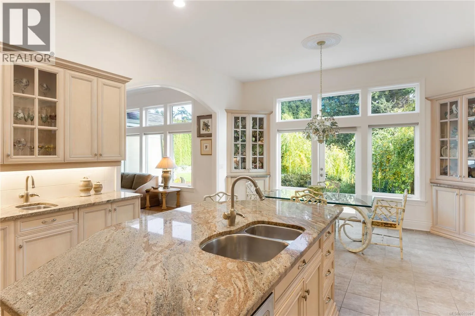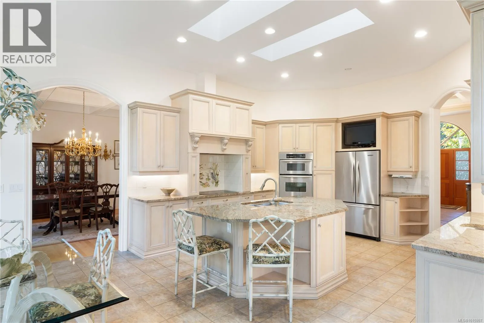 Elegant Custom-Built Rancher on Ten Mile Point! Tucked away on a gently sloping 0.44-acre lot surrounded by lush gardens, this exceptional custom-built home impresses at every turn. Inspired architectural details such as 12'4'' tray and coffered ceilings, graceful curves, and abundant skylights create a bright and welcoming sense of grandeur. With more than 4,200 sq. ft. on the main level, the home offers true single-level living, complemented by flexible bonus space downstairs â perfect for guests, extended family, or entertaining on a larger scale. At the heart of the home, the kitchen seamlessly connects to the family room, formal dining area, and a private patio ideal for morning coffee or evening gatherings. The spacious primary suite forms a peaceful retreat at the north end of the home, complete with a six-piece ensuite and walk-in closet, while two additional bedrooms on the opposite wing provide comfort and privacy for family or guests. Set on a quiet no-through street, this serene property is just steps from Ten Mile Pointâs pristine shoreline, parks, and walking trails â and only minutes from Cadboro Bay Village, UVIC, and the Royal Victoria Yacht Club. A rare combination of elegance, comfort, and location. (id:27476)