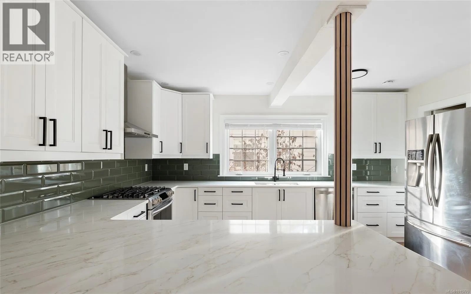 Exceptional character home boasting a luxurious modern renovation while still embodying its true character. Situated in the heart of Cordova Bay & privately nestled on an 11,081 sq/ft lot; this 4,000 sq/ft residence offers 4Beds+Den & 3Baths w/a flexible layout for any lifestyle. The main features an exquisite remodeled kitchen & walk-in pantry seamlessly flowing to a beautiful built-in wet bar & DR. From there step into your opened up character LR accented w/beams, HW flrs, built-ins & FP. Or on those long summer nights, easily transition out to your large deck & fenced yard w/hot tub-perfect for entertaining. A home office, south-facing patio w/ocean views & spacious FR w/gas FP complete the main. Up find an executive primary w/11â vaulted ceilings, dual walk-ins & luxury ensuite, 3 additional BRs & full bath. The lower offers a large rec room & flex space. Updates: flooring, paint, fixtures, newer windows, drains & 2 heat pumps. A perfect blend of timeless charm & modern elegance! (id:27476)