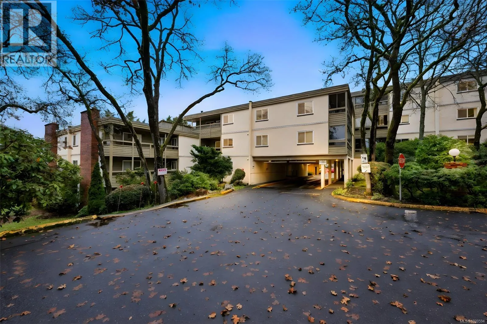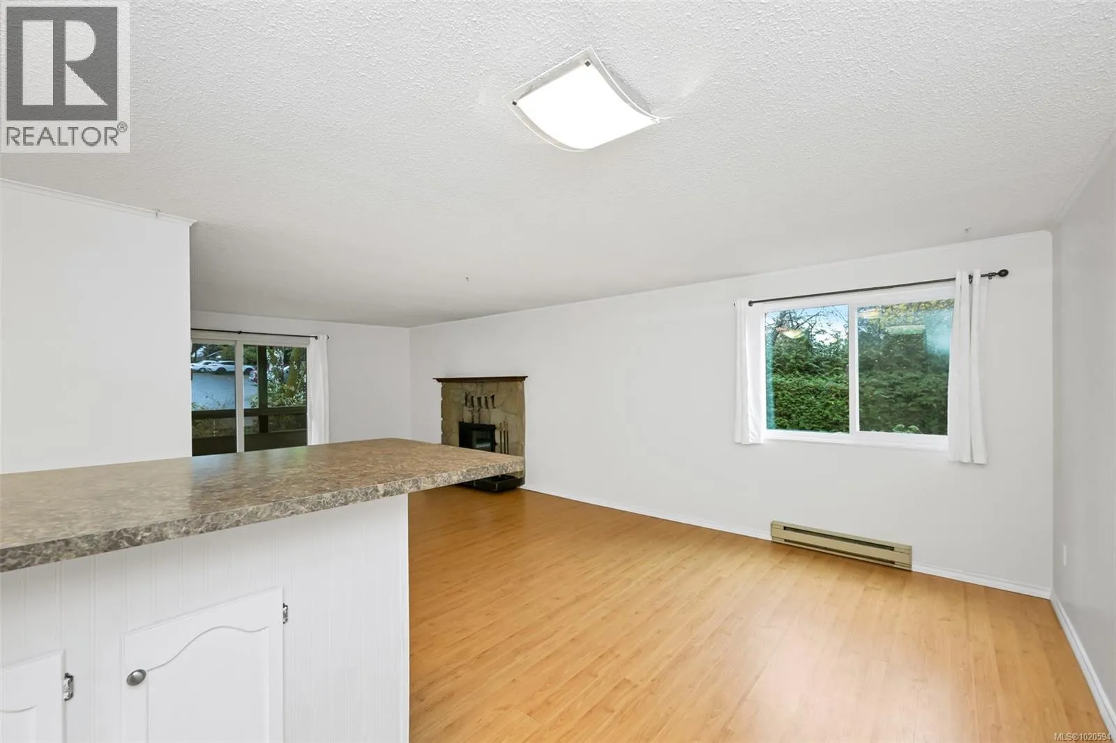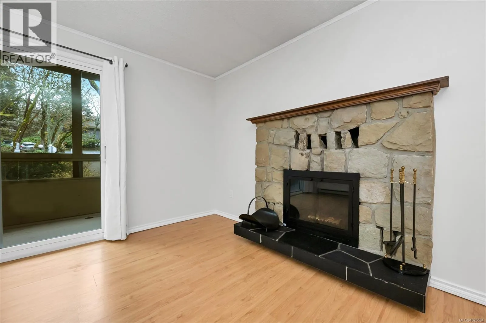 Surrounded by a Garry Oak forest and nestled in a quiet, secluded setting away from busy streets, this private 2-bedroom, 1-bathroom southwest corner suite offers peaceful living. It features a wood-burning fireplace, new LED lighting, laminate flooring, in-suite laundry, newer windows, newer washer and dryer, fresh paint, and a new hot water tank. The open kitchen includes a coffee bar, and sliding doors from the living room and primary bedroom lead to a spacious south-facing balcony. The dining area enjoys a west-facing window looking out over the grounds. Set on 2.8 acres of park-like grounds with mature plantings, this pet-friendly, home is minutes from Uptown, Saanich Centre, Swan Lake, and the Galloping Goose Trail. Includes one parking spot with potential to rent extra parking. This unit enjoys the security of elevated living but the convenience of main floor accessibility. Immediate possession available. A wonderful blend of comfort, nature, and convenience! (id:27476)