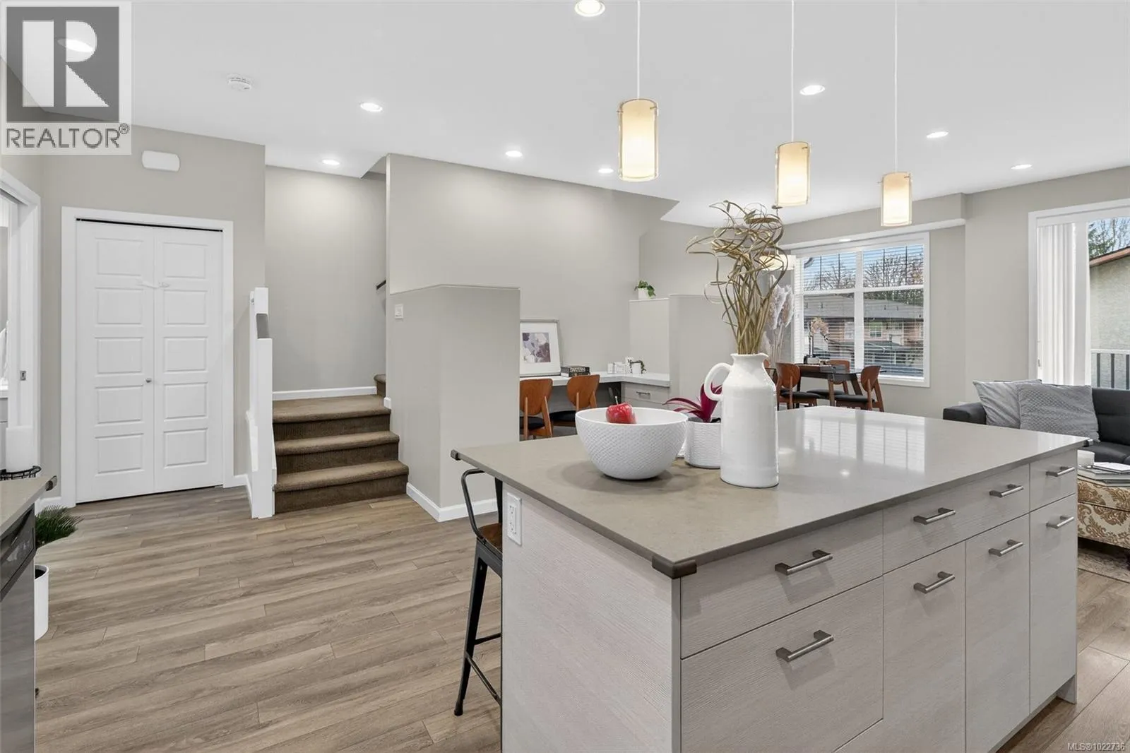 NEW LISTING | Rare Abstract-built townhome offering exceptional flexibility, space, and income-earning potential in a highly central location. Over 1,800 square feet of well-designed living with a brilliant, versatile floor plan. A LEGAL bachelor suite on the entry level includes a private entrance, full kitchen, bathroom, laundry, and direct backyard accessâideal as a mortgage helper, guest suite, or easily converted back into a true four-bedroom home with an entry-level bedroom, full bathroom, second laundry, and kitchen. Main level features bright open-concept living with high ceilings, oversized windows, and recessed lighting throughout. The chefâs kitchen offers stainless steel appliances, quartz countertops, an oversized island with seating, pendant lighting, and extensive millwork. The living and dining areas are anchored by a custom millwork feature wall with fireplace, a built-in office nook, and a privately tucked-away powder room. The upper level offers a generous primary bedroom with ensuite, two additional bedrooms, a full bathroom with tub, and upper-level laundry. Notable features include an attached garage with remote, fenced yard, two kitchens, two laundry areas, a common door between the suite and main home, and a quiet position within the complex. Recent updates include a hot water tank in 2025, two new dishwashers in 2025, three newer toilets, a refrigerator approximately three years old, and fresh interior paint. A long-term tenant occupies the suite. Walk to Uptown, the Galloping Goose Trail, parks, and everyday amenities. Quiet area, small well-run complex, close to transit, and minutes to highway access. A rare opportunity offering long-term value, flexibility, and lifestyle convenience with luxury living options. 90+ Walk & Bike Score! Contact Zoi for more information 250-588-4259. (id:27476)