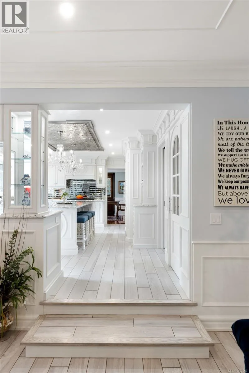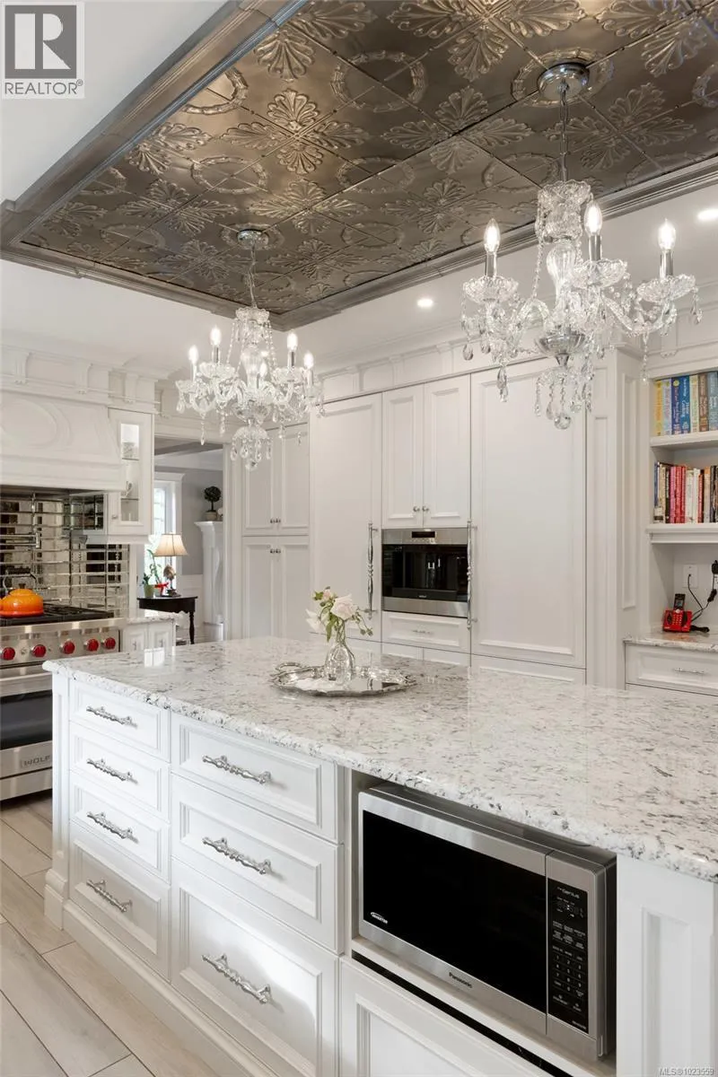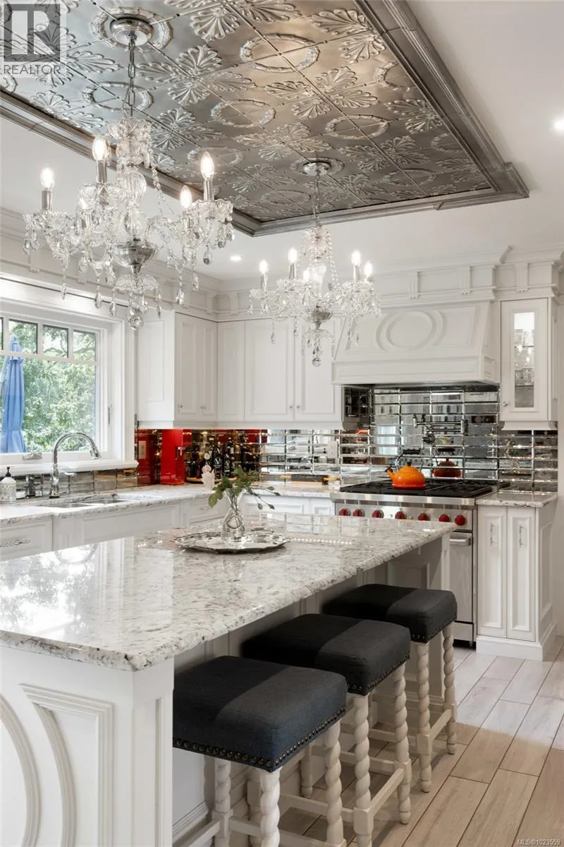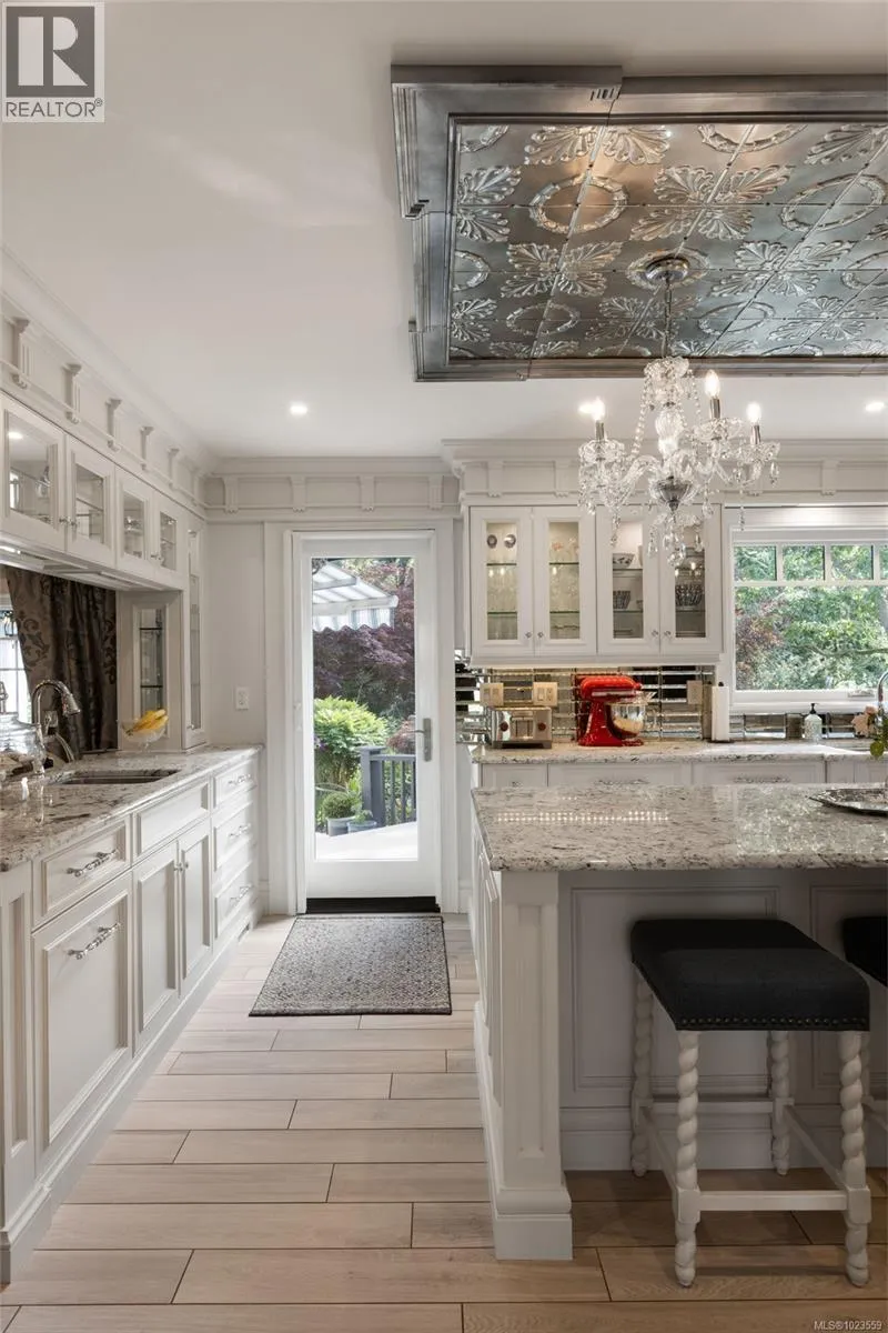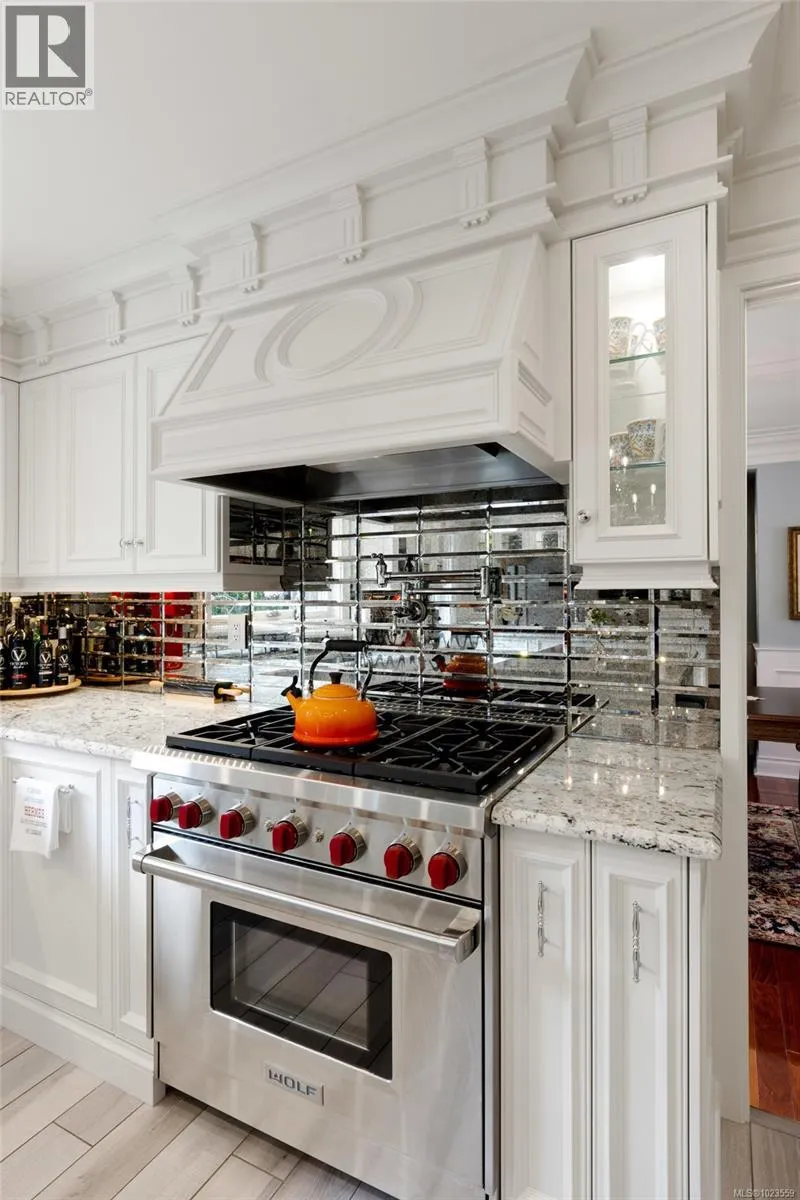 A stately stone exterior French Country Manor in prestigious Wedgewood Point on Ten Mile Point. This luxurious home features a unique blend of timeless design, functional craftsmanship and the comforts of modern living. Backing onto Benson Park, come home to peace, privacy and nature all around on this 1/3 acre of lush landscaped grounds complete with stone pathways, raised and irrigated vegetable and fruit gardens, sun deck, covered patio and hot tub, bathed in South-West light. Inside, architectural interest abounds with elevated bespoke cabinetry throughout; find coffered ceilings, wainscotting and many distinctive functional features. The kitchen is a statement of glamour rooted in tradition; bespoke cabinetry, Wolf & Sub-Zero, built-in coffee station & stone counters. Vaulted Great Room impresses with dramatic floor to ceiling library wall with rolling ladder. Upstairs, a primary suite offers a Juliet balcony, dual walk-in closets, spa-like ensuite with soaker tub & steam shower. Two additional bedrooms, main bath and laundry room complete the upstairs. Double garage, detached single garage with 400+ sq ft loft studio with bathroom offer flexible living or workspace options. (id:27476)