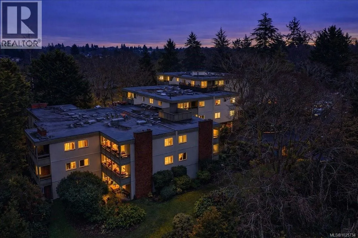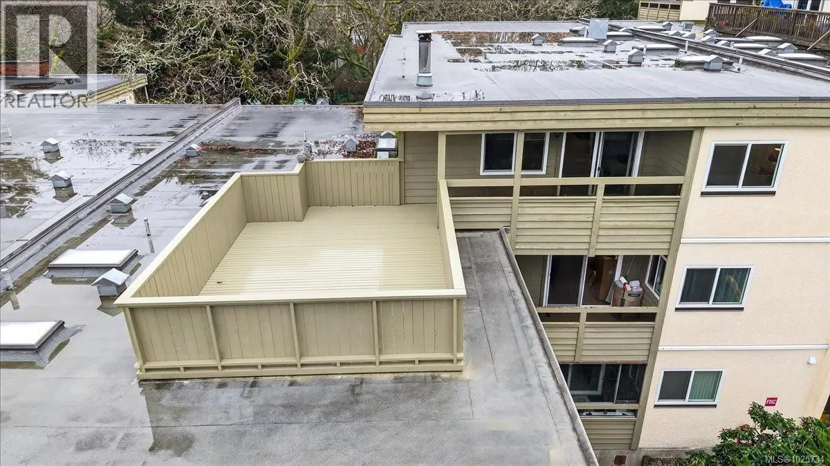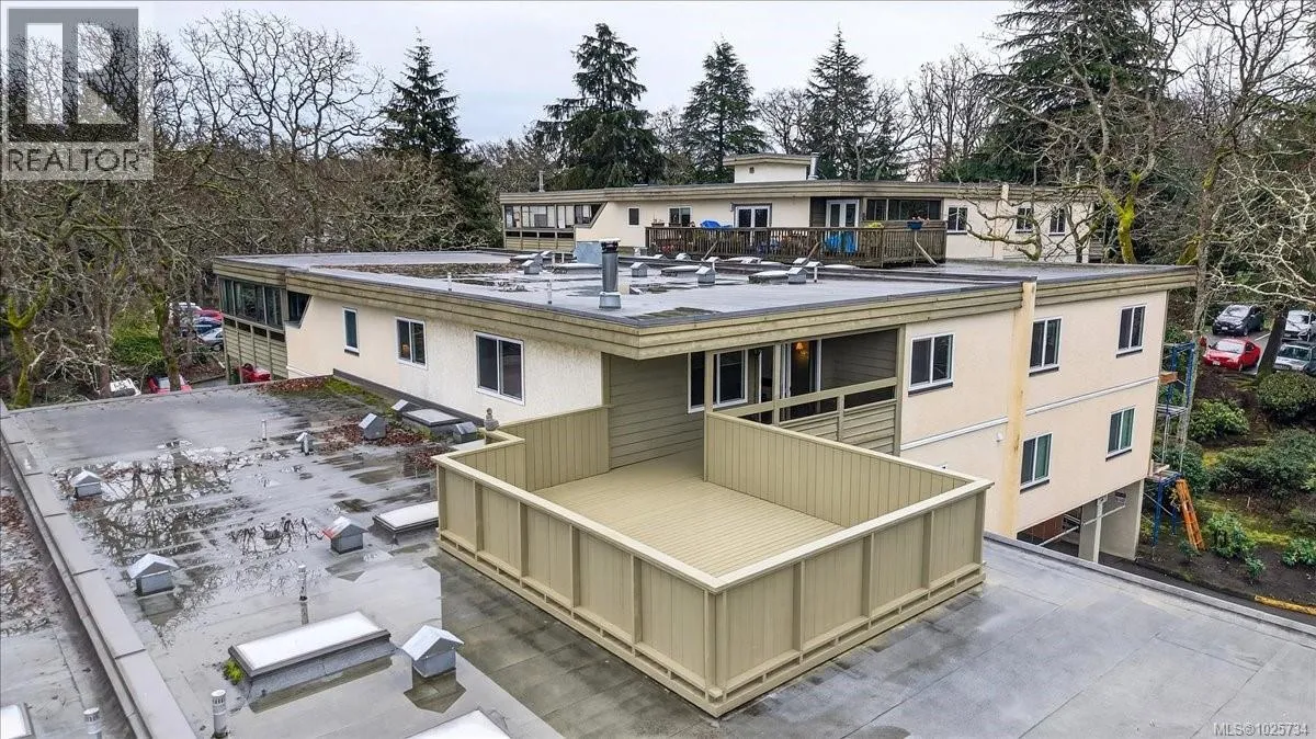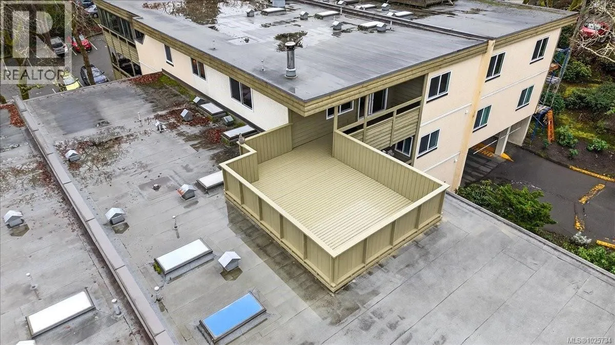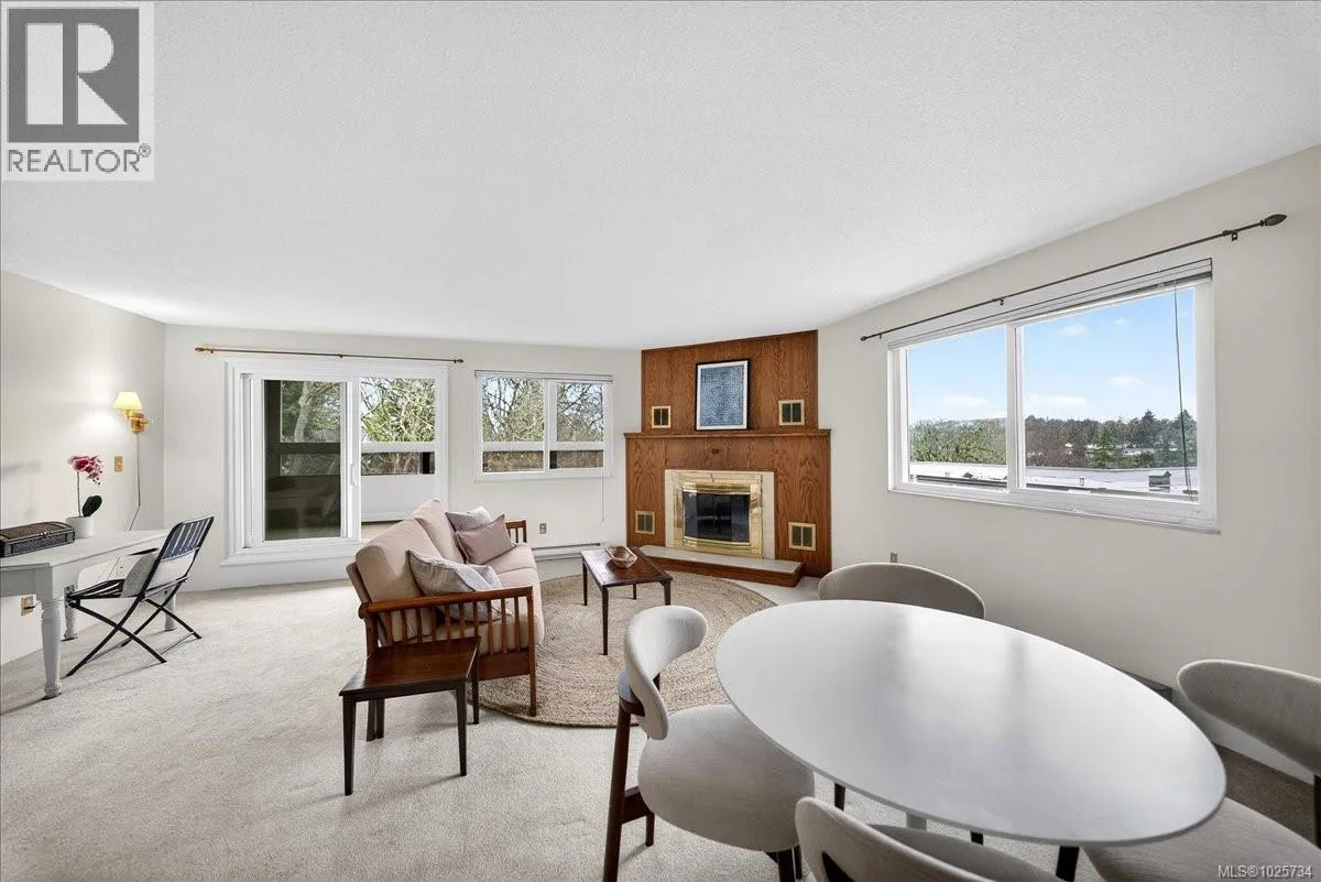 Immediate possession! Bright and private west-facing corner suite offering nearly 1,100 sq ft of well-designed living space, plus a deluxe private rooftop patio perfect for outdoor entertaining or quiet relaxation. This spacious 2-bedroom, 1-bathroom home features two generously sized bedrooms thoughtfully positioned at opposite ends of the unit for added privacy. Surrounded by a tranquil Garry Oak forest and tucked away from busy streets, this peaceful space offers the best of nature and convenience. Kitchen with large skylight welcoming the natural light into the space while a cozy wood-burning fireplace anchors the living room. Laundry area is on the 4th floor, not far from the unit. Set on 2.8 acres of park-like property, this pet-friendly community also offers secure, dry bike storage, additional individual storage, and one parking stall with potential to rent additional parking. Ideally located just minutes from Uptown, Saanich Centre, Swan Lake, and the Galloping Goose Trail. A must see property offering an exceptional blend of comfort, privacy, nature, and central location. (id:27476)