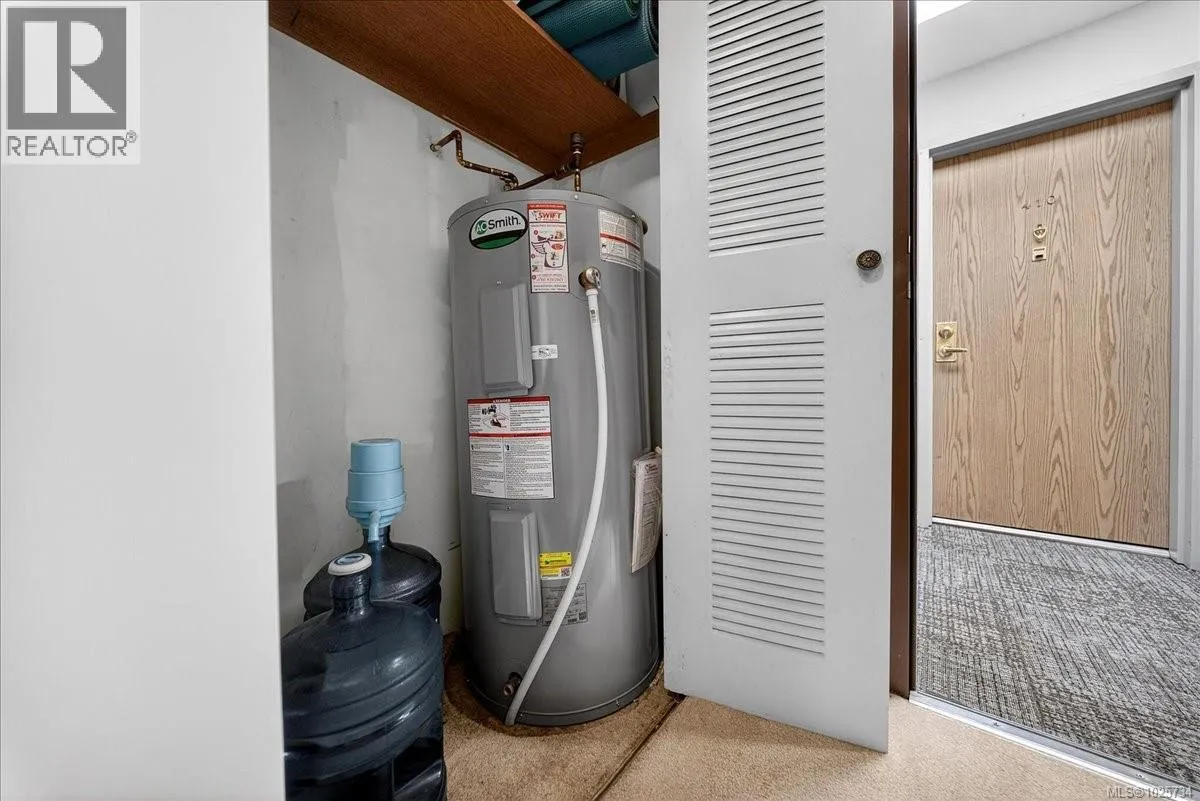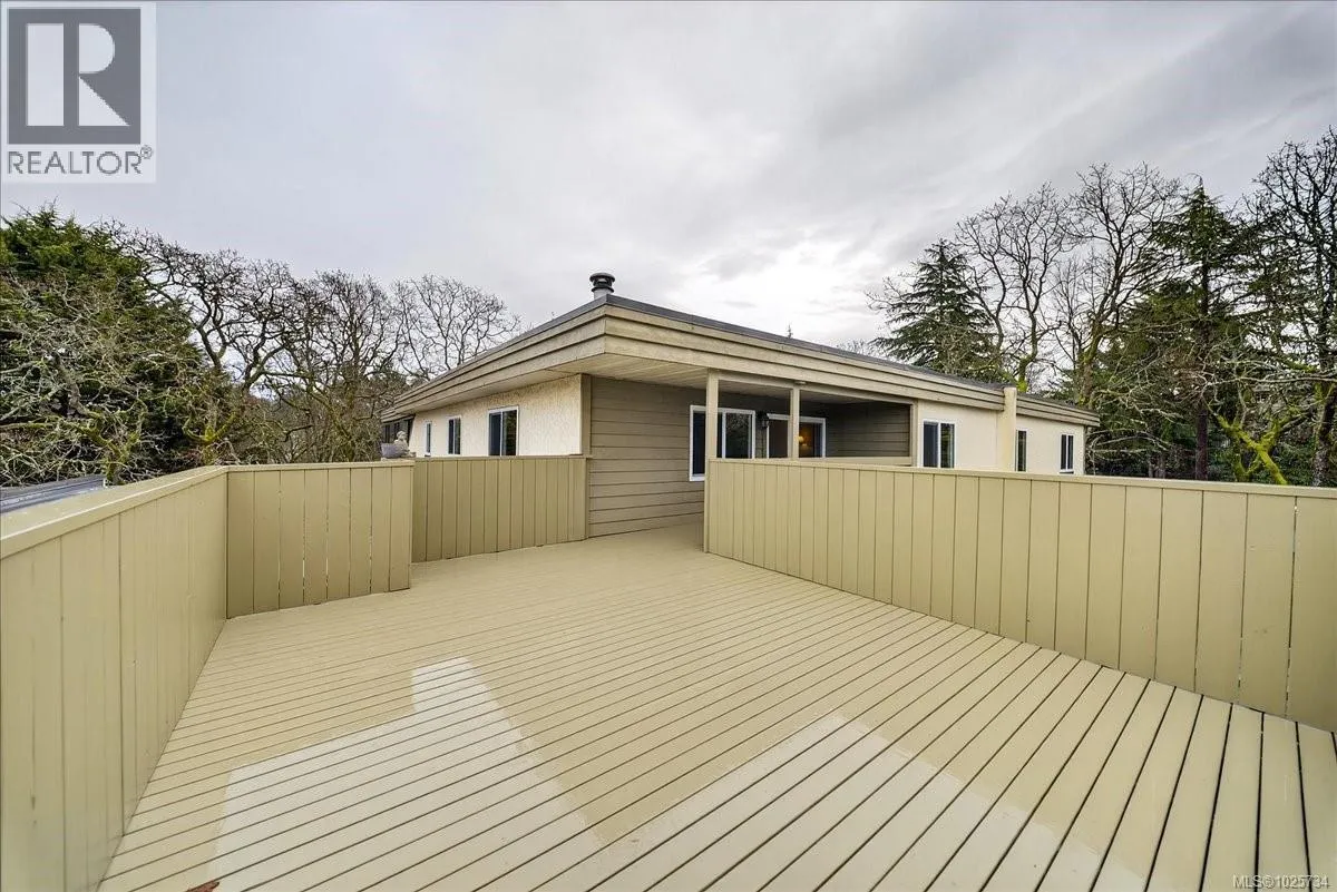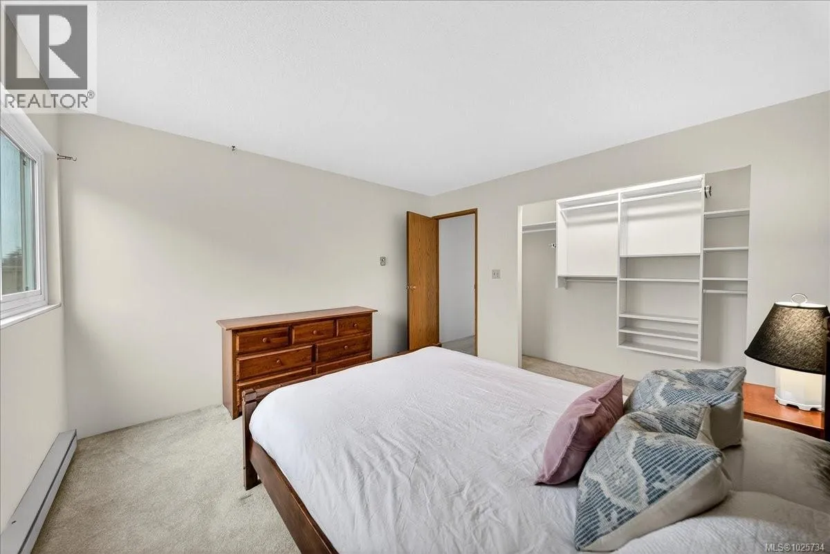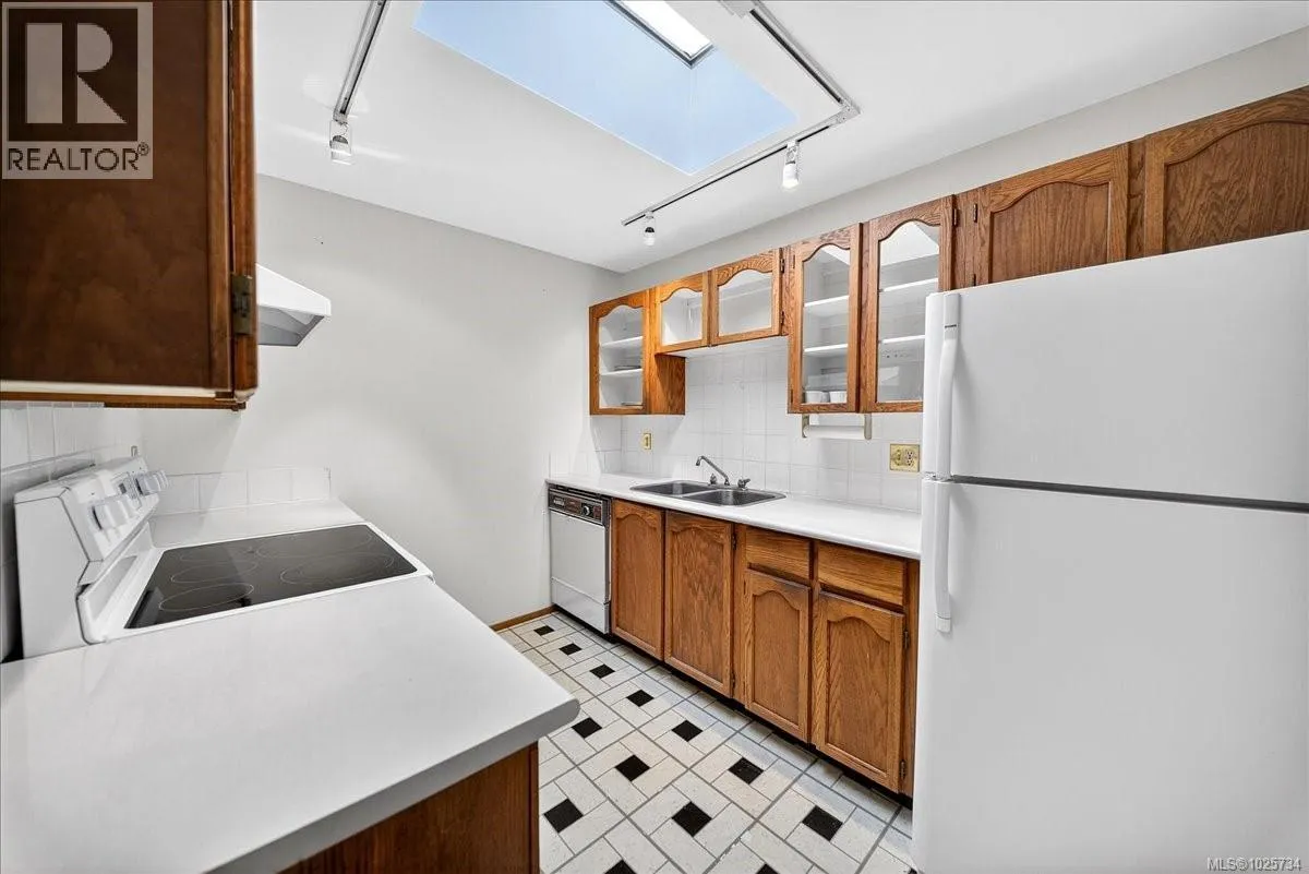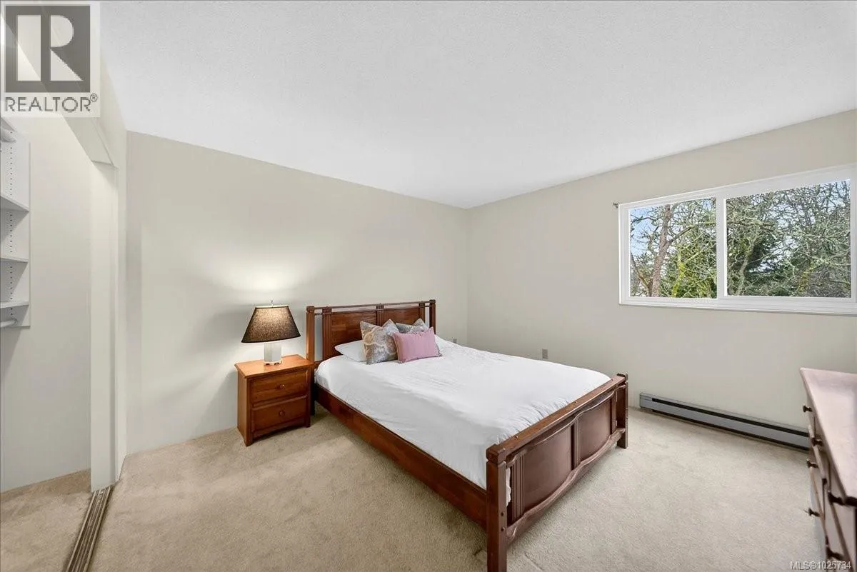 Immediate possession! Bright and private west-facing corner suite offering nearly 1,100 sq ft of well-designed living space, plus a deluxe private rooftop patio perfect for outdoor entertaining or quiet relaxation. This spacious 2-bedroom, 1-bathroom home features two generously sized bedrooms thoughtfully positioned at opposite ends of the unit for added privacy. Surrounded by a tranquil Garry Oak forest and tucked away from busy streets, this peaceful space offers the best of nature and convenience. Kitchen with large skylight welcoming the natural light into the space while a cozy wood-burning fireplace anchors the living room. Laundry area is on the 4th floor, not far from the unit. Set on 2.8 acres of park-like property, this pet-friendly community also offers secure, dry bike storage, additional individual storage, and one parking stall with potential to rent additional parking. Ideally located just minutes from Uptown, Saanich Centre, Swan Lake, and the Galloping Goose Trail. A must see property offering an exceptional blend of comfort, privacy, nature, and central location. (id:27476)