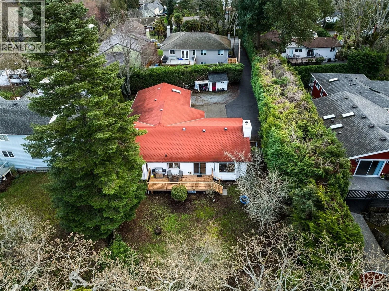 Updated rancher in a walkable location! Tucked away on a quiet cul de sac, this 3 bed + den / 2 bath home offers exceptional privacy on a secluded 12,000+ sqft lot, steps from the newly updated University Heights Mall and everyday amenities. Inside, youâll find a spacious open concept living space and a large primary bedroom complete with 3-pce ensuite. Numerous upgrades include ductless heat pumps, updated plumbing, lighting, flooring, HW tank (2022), ensuite shower insert, toilets, and bathroom countertops. A new back deck extends the living space outdoors for relaxing or entertaining in the fenced yard. There is ample off street parking for multiple vehicles and plenty of space for storing an RV or boat. Walk to shopping, coffee shops, restaurants, schools, and nearby trails, with easy access to hiking paths at popular PKOLS (Mt Doug Park). A rare opportunity to enjoy privacy, convenience, and single level living in one of Saanichâs most desirable locations. (id:27476)