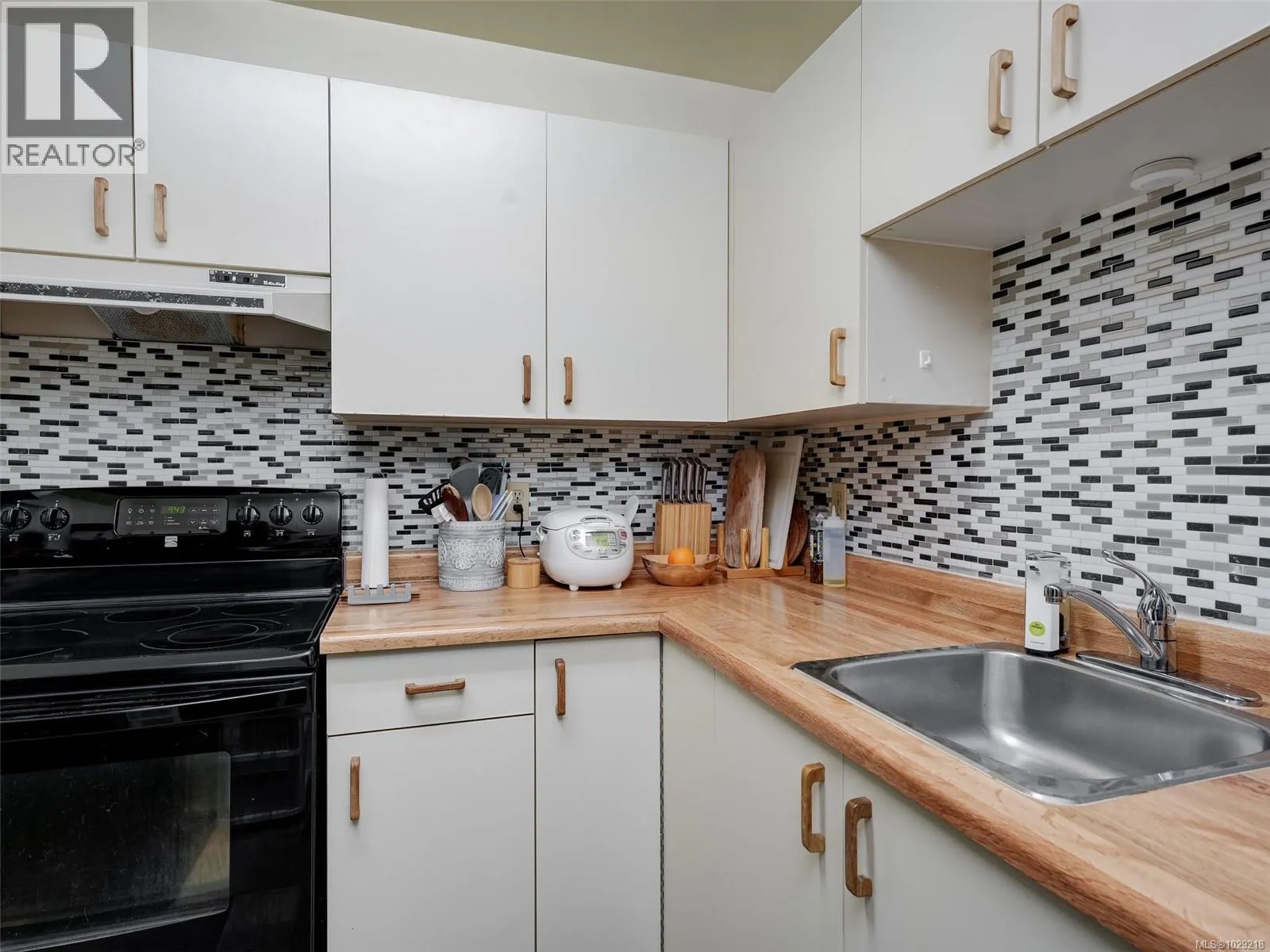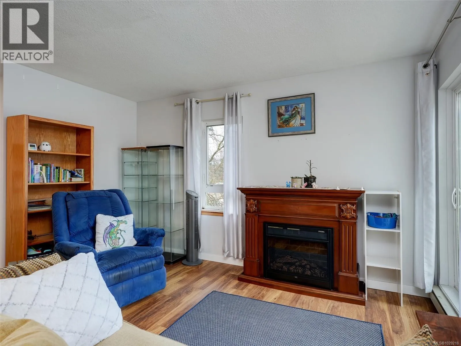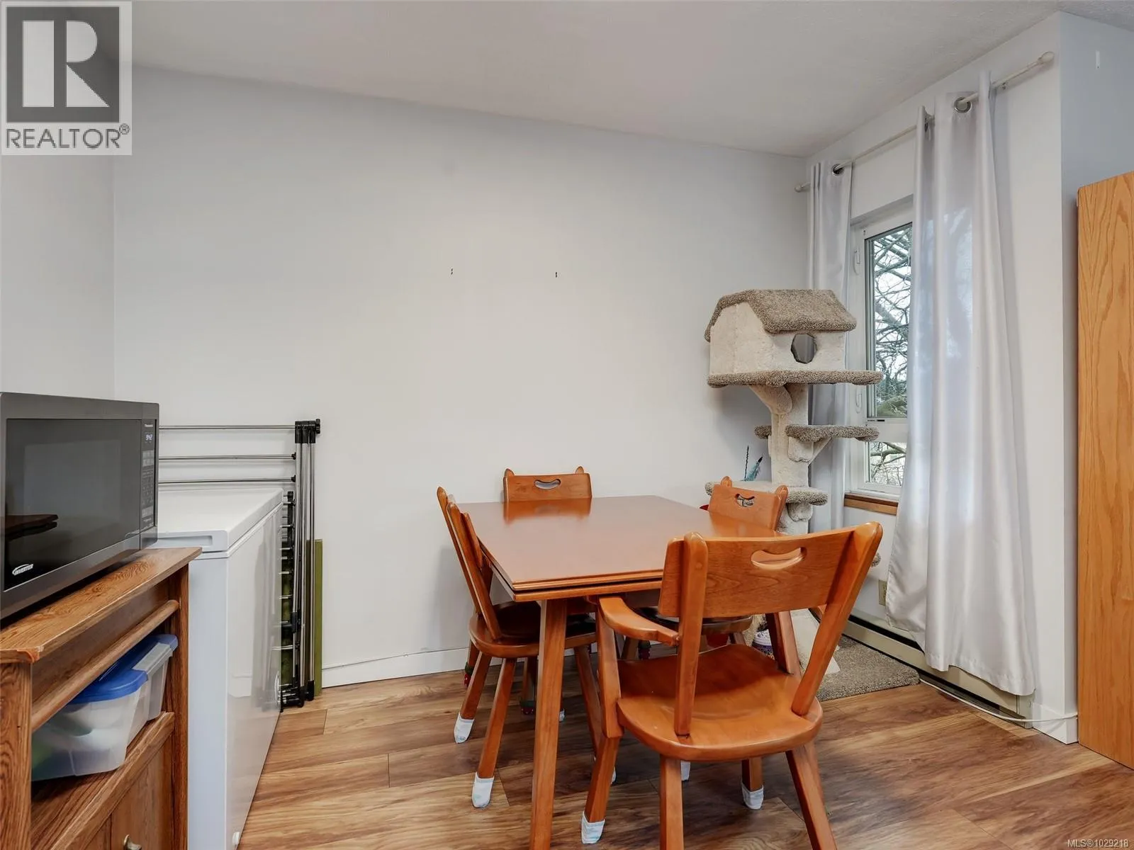 TOP FLOOR CORNER UNIT in Alder Manor! Bright and well-maintained 2 bed, 1 bath condo offering 860 sqft of comfortable living on quiet side and in a prime Saanich East location. Features include wide plank vinyl flooring through the main living areas, updated bathroom vanity, and excellent in-unit storage. Enjoy a spacious living/dining area with balcony overlooking a peaceful neighbourhood. Walking distance to Mayfair Mall, Uptown, restaurants, transit and Rutledge Park just steps away. The professionally managed building has seen key updates including vinyl windows, patio doors, balconies and boilers. No age restrictions, BBQ's allowed, and pet friendlyâ1 dog (no size restriction) & 1 cat or 2 cats permitted. Shared laundry on main floor and 1 parking stall included. Move-in ready and a great opportunity in todayâs market! (id:27476)