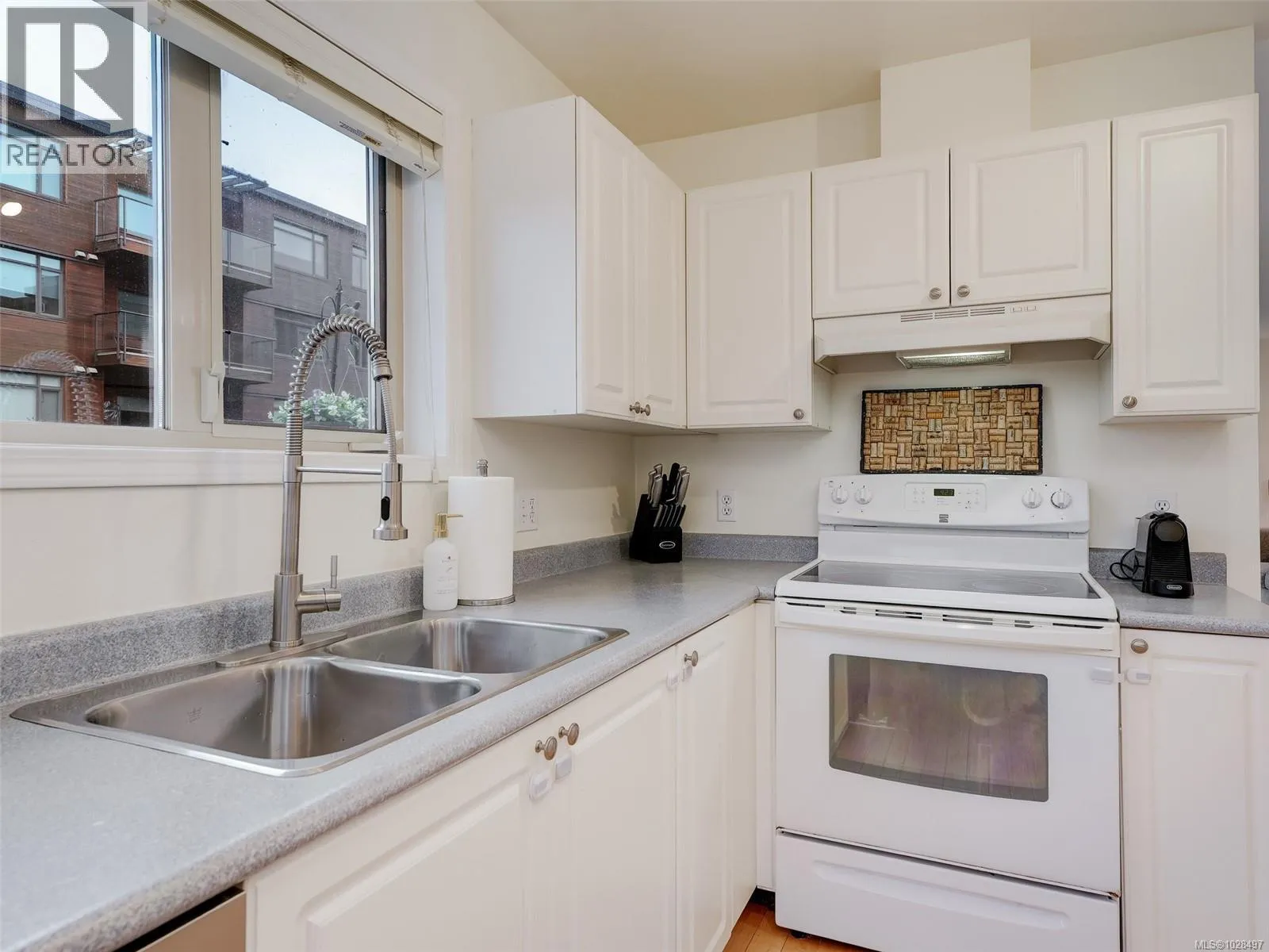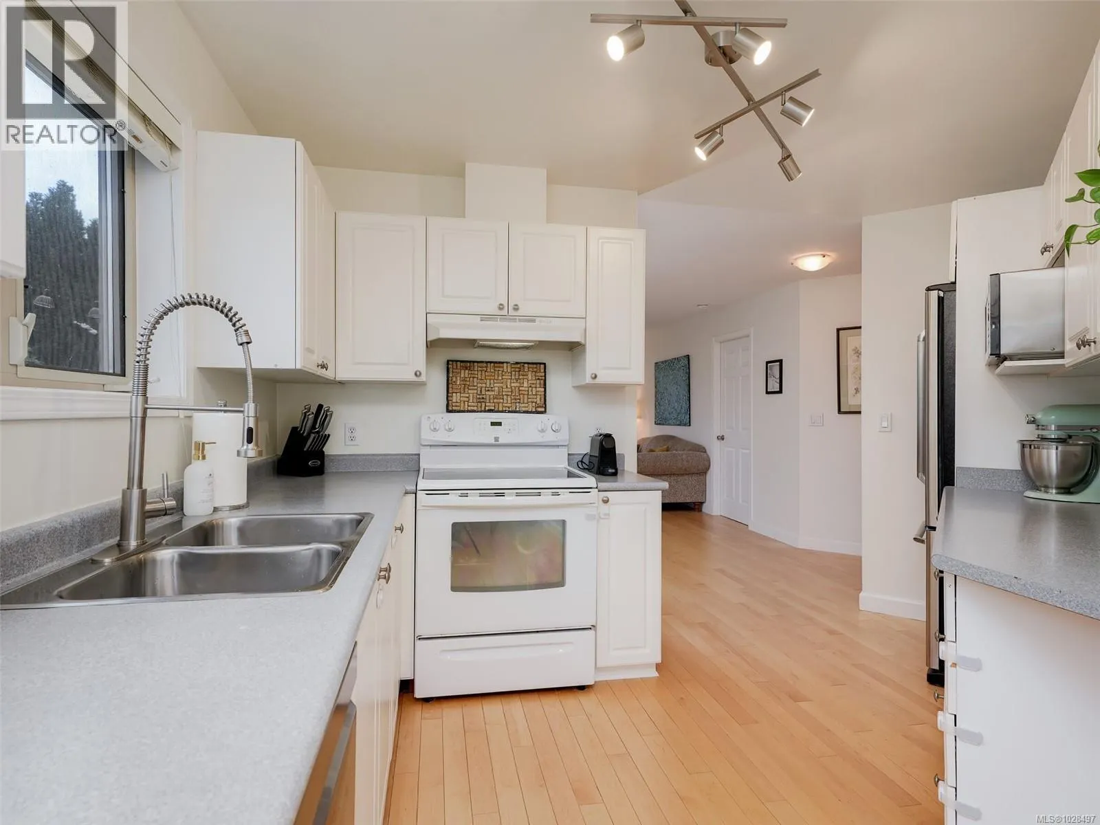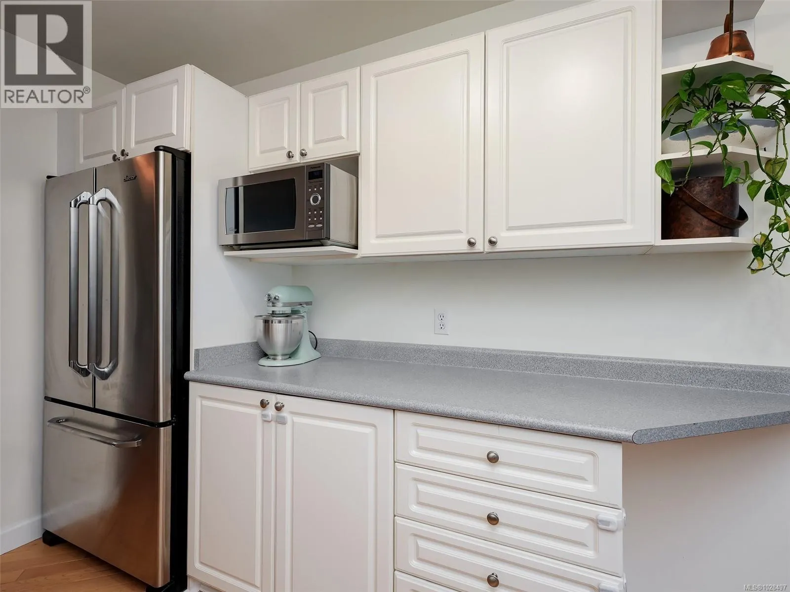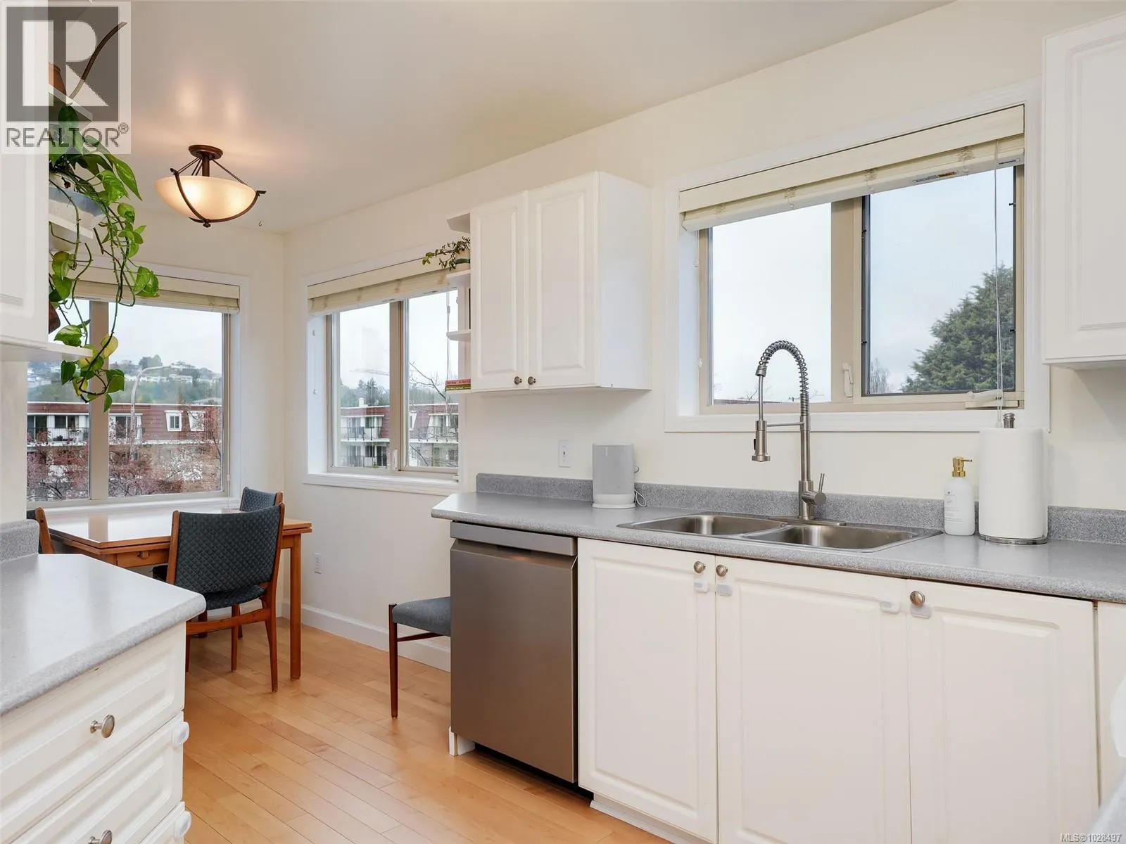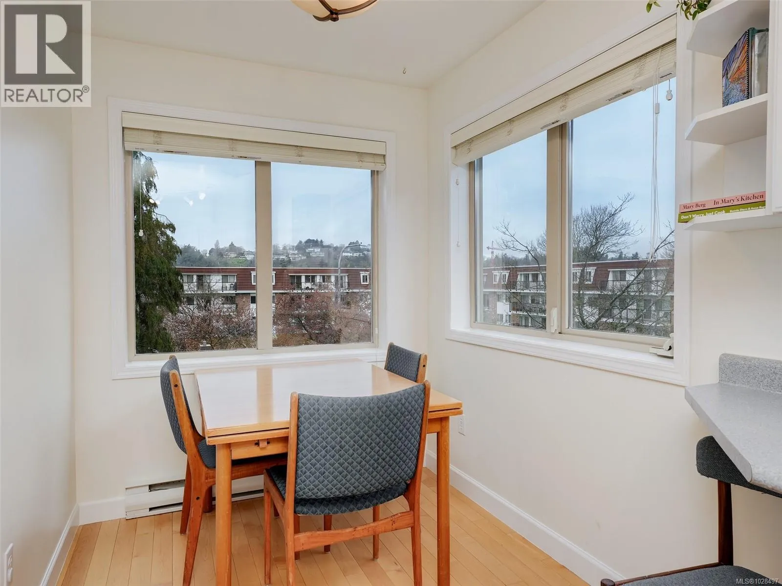 Open House Sat 2-4. Location, location, location! Welcome to this bright and spacious 3rd-floor end unit in the highly sought-after Mt Tolmie neighbourhood, just steps from UVic & Camosun College. Offering 1,088 sq ft of thoughtfully designed living space, this home is filled with natural light thanks to its large windows and light finishes. The open-concept living and dining area features a cozy gas fireplace and opens to a spacious balconyâperfect for relaxing or summer BBQs. The kitchen offers ample space with a bonus eating nook with windows. You'll love the hardwood floors throughout and the well-planned layout provides excellent separation between the two bedrooms, ideal for privacy. The generous primary suite includes a large walk-in closet and a 3-piece ensuite with glass shower. In-suite laundry behind modern barn doors, secure underground parking and separate storage included. Set in a well-maintained building close to parks, trails, shopping, and amenities. (id:27476)