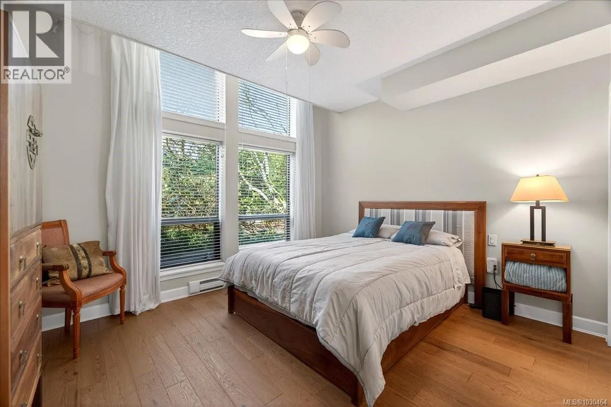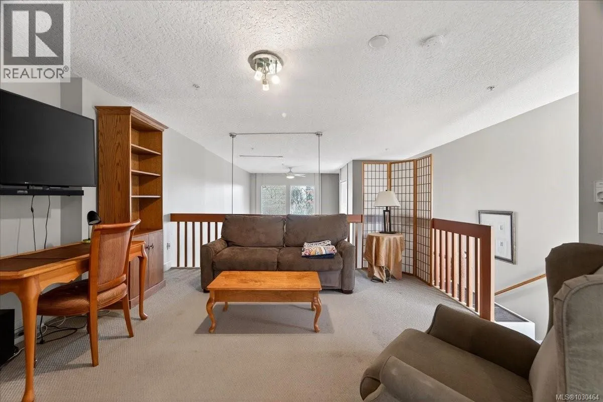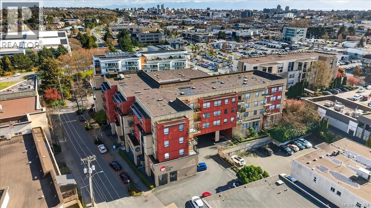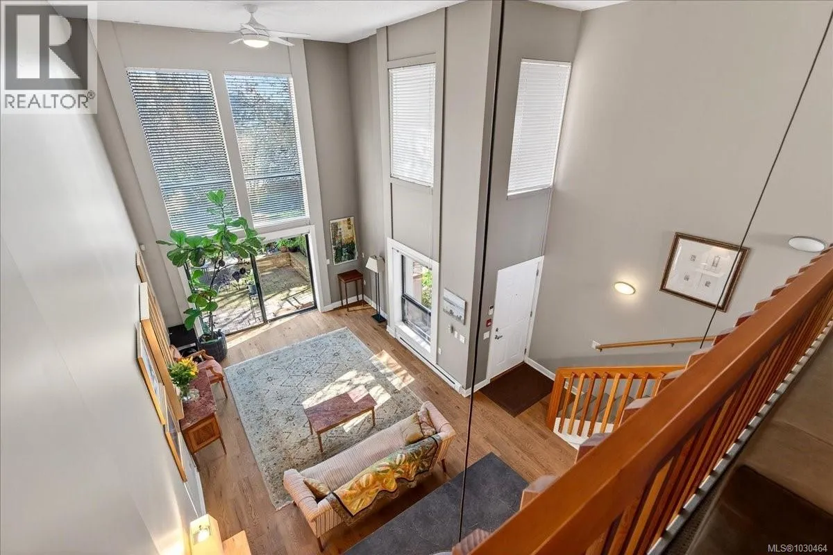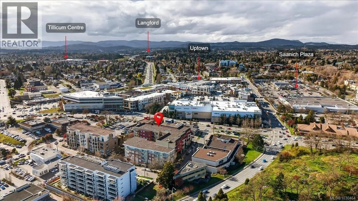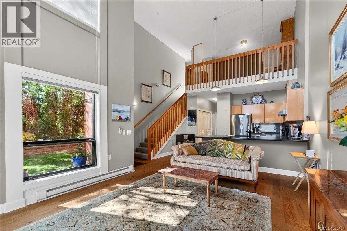 Uptown Shopping Centre. Built in 2005, this unique two-storey residence offers over 1,074 sq. ft. of thoughtfully designed living space with your own private entrance and patio. Soaring 17+ ft floor-to-ceiling windows flood the home with natural light. The open-concept living area features vaulted ceilings, rich wood floors, the functional kitchen is equipped with custom cabinetry, a pantry, quality appliances, and a dedicated eating area. The main level also offers a generously sized bedroom with large windows and extra-large closets, along with a full 4-piece tiled bathroom. Upstairs, the spacious loft-style primary retreat includes an office area, abundant closet space, and an additional 4-piece bathroom, ideal for flexible living or working from home. A large laundry and storage room adds to the homeâs practicality. Complete with in-suite laundry, underground parking, and a storage locker, this pet-friendly home checks all the boxes. Step outside and enjoy immediate access to shopping, dining, transit, and the Galloping Goose Trail. Easy routes to UVic and just minutes to downtown make this location truly unbeatable. (id:27476)