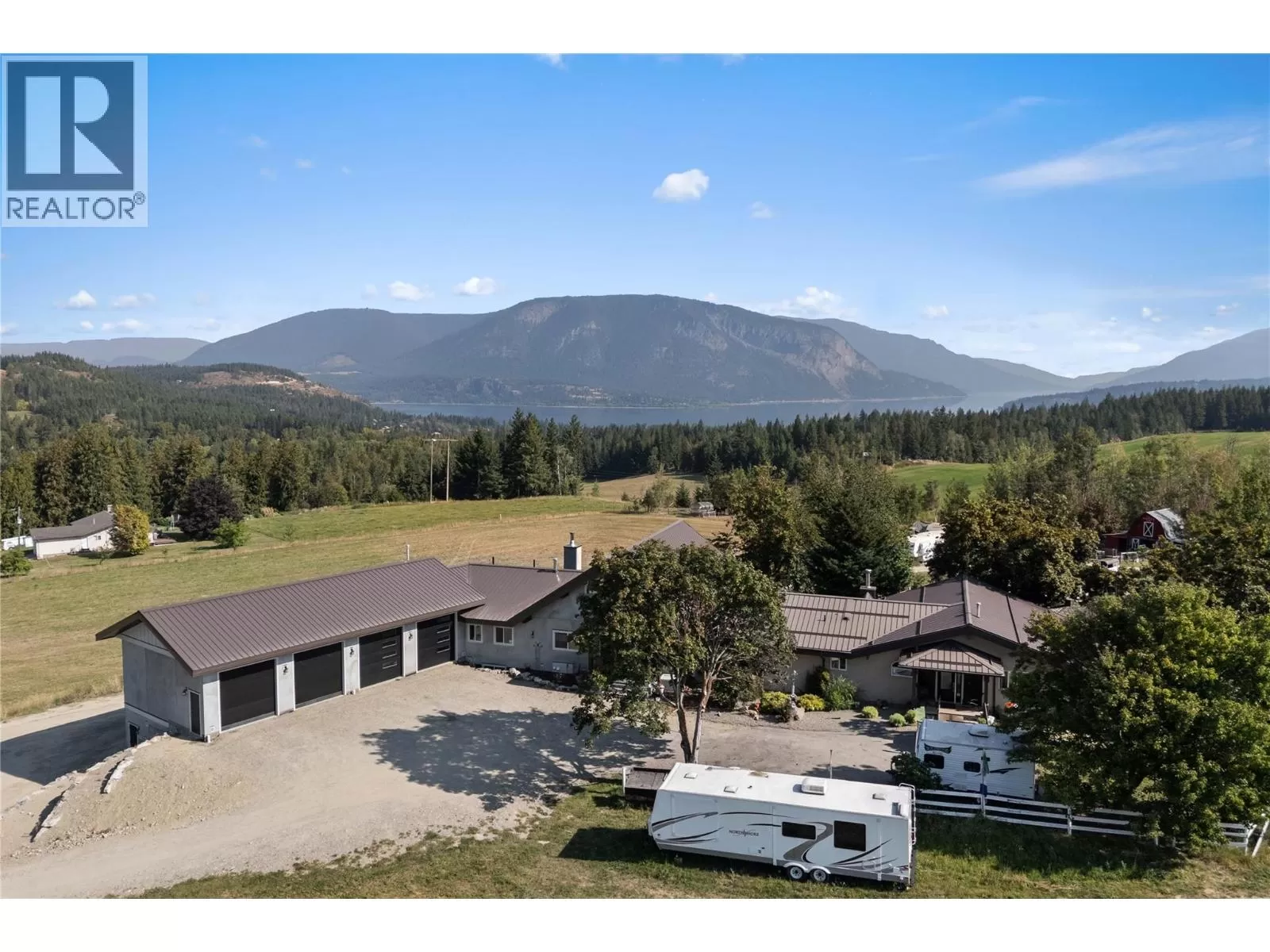 Looking for home that has it allâ¦.look no further. This 1st time ever on the market acreage is perfect for that family that is looking for multi-generations living or rental income or the horse/garden enthusiast, this home has it. This property sits on 15 acres of flat rolling fields with amazing lake views and surrounding mountains. This home has over 6500sq feet of finished living space with 1500sq feet 8 car garage and over 1000sq ft of wrap around deck space over looking Shuswap lake all the way to Sicamous. The surrounding property has a 2021 2 bed, plus den, 2 bath modular home on its own services. Large Quonset building, garden sheds, large barn with multiple shelters. Property is completely fenced for large animals with multiple beautiful raised gardens, hay fields and pasture. The original home is 2200 sq feet rancher with 3 bedrooms and 2 baths with a newly built 4500sq foot addition that has 4 bedrooms, den and office, 4 bathrooms and attached finished 8 car suspended slab multi level garage. The property is on city water and has 2 brand new septic systems and hydro/gas systems. Some of the amazing features include, 21 ft timber frame vaulted ceilings, spacious rooms all with walk in closets, top of the line appliances, bright open concept living spaces, dual A/C zones and HRV systems, 2 cozy built in wood fireplaces, oversized custom kitchen with quartz counter tops, over 10-foot island, 400 amp service, separate NG in garage and so much more. This property is truly one of kind and irreplaceable at this value. Call me today to have a look. (id:27476)
