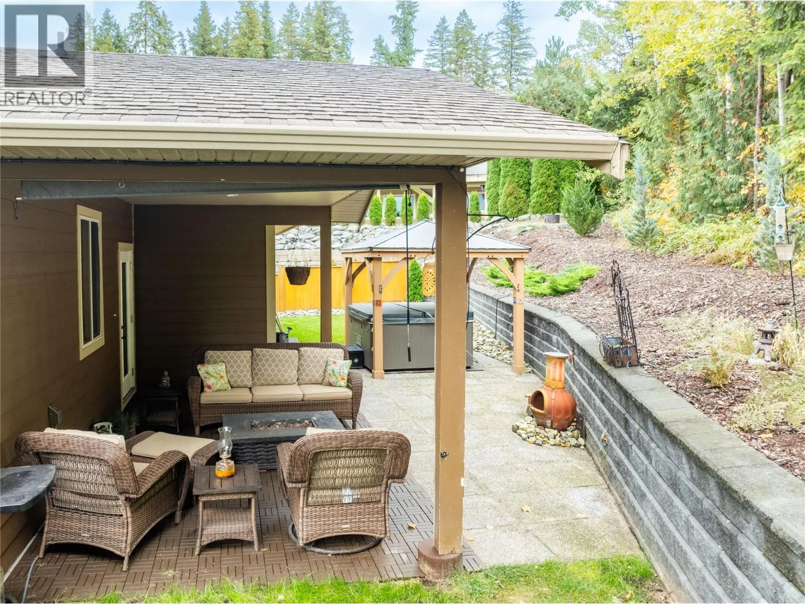 Just minutes from Shuswap Lake, and tucked within one of Salmon Armâs most peaceful and picturesque neighbourhoods, this beautifully appointed 2,800+ sq. ft. home is ideally situated on a quiet cul-de-sac, backing onto a private green space in the heart of Willow Cove â a serene, family-friendly community close to schools, walking trails, the hospital, and all essential amenities. This elegant and inviting 4-bedroom plus den home features rich acacia hardwood flooring, Caledonian granite countertops, modern stainless-steel appliances with a gas range, fresh paint throughout, a natural gas fireplace, a 60-gallon hot water tank, and a spacious double garage. Outside you'll findyour private, meticulously maintained outdoor retreat with in-ground irrigation, a drip system, covered patio, gazebo, and five-person hot tub â perfect for relaxing or entertaining year-round. All this with low strata fees in one of Salmon Armâs most desirable communities. (id:27476)