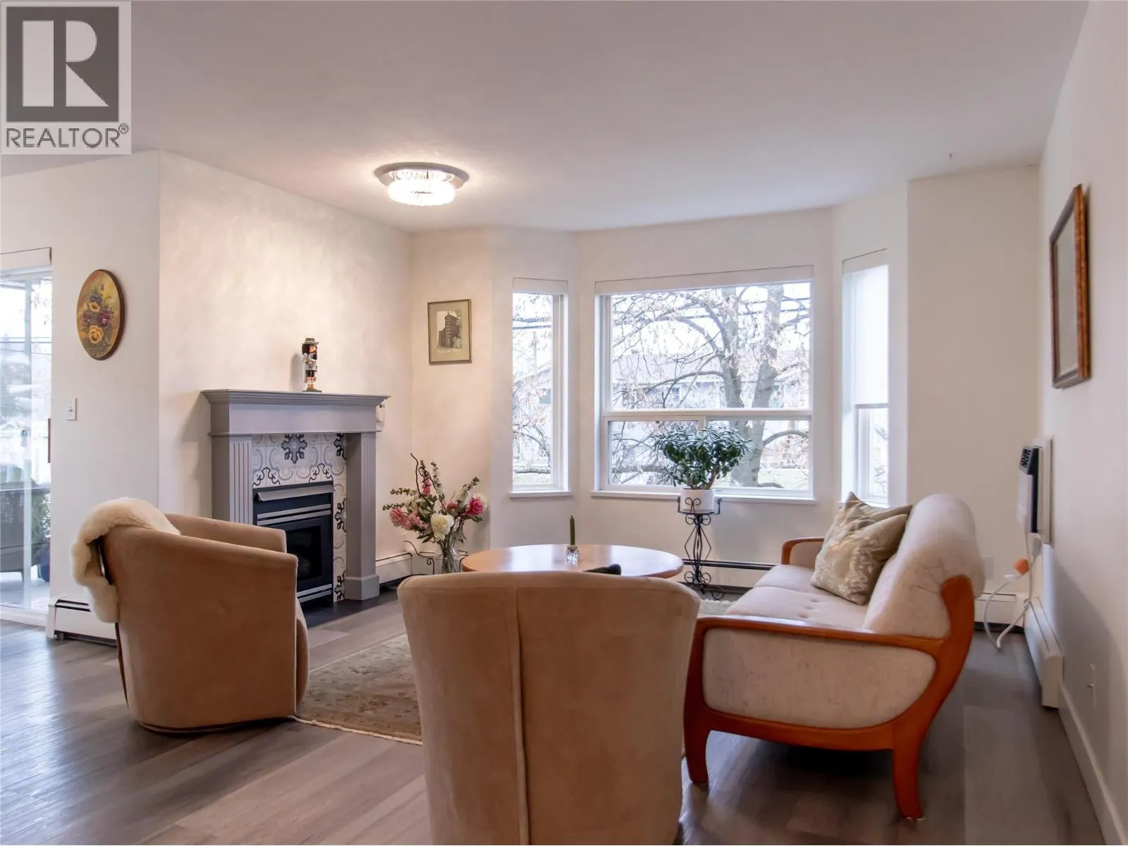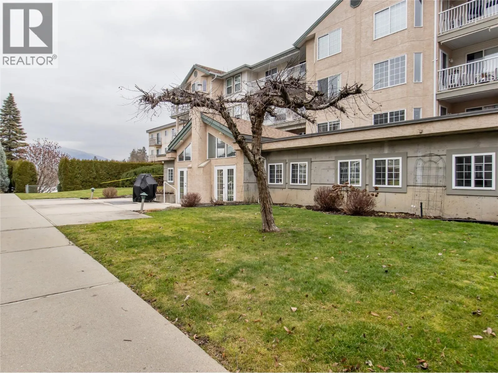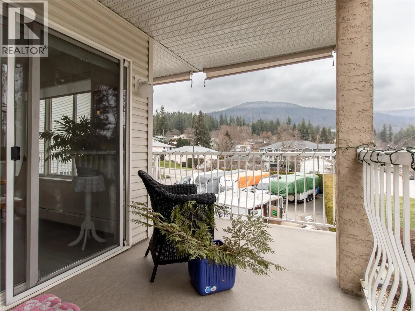 Tastefully renovated corner unit in the desirable 55+ MacIntosh Grove, offering easy, low-maintenance living just steps from downtown. This bright and spacious home features just under 1,300 sq. ft. with 2 bedrooms and 2 bathrooms, and has been recently updated with new flooring, a renovated kitchen with new appliances and countertops, fresh paint, and updated bathrooms. The inviting living room includes a newer AC unit, cozy gas fireplace (included in the strata fee) and flows seamlessly into the formal dining area and eat-in kitchen with access to a wrap-around, covered balcony featuring mountain views. The well-designed layout offers generous room sizes, a primary bedroom with walk-in closet and full ensuite (dual vanities). The kitchen provides ample cabinetry, tile backsplash, stainless appliances. A separate laundry room includes extra storage and room for a freezer. Convenient elevator access ensures effortless entry to this unitâsimply move in and enjoy. MacIntosh Grove amenities include underground parking, RV parking, a common gathering room with kitchen, craft room, exercise room, and workshop. Public transit, shopping, restaurants, and downtown are all within walking distance. Quick possession available. (id:27476)