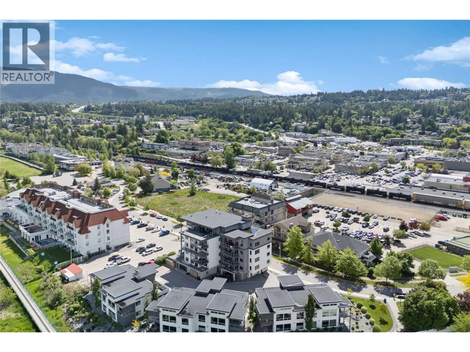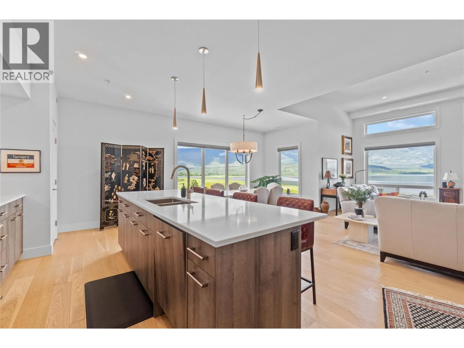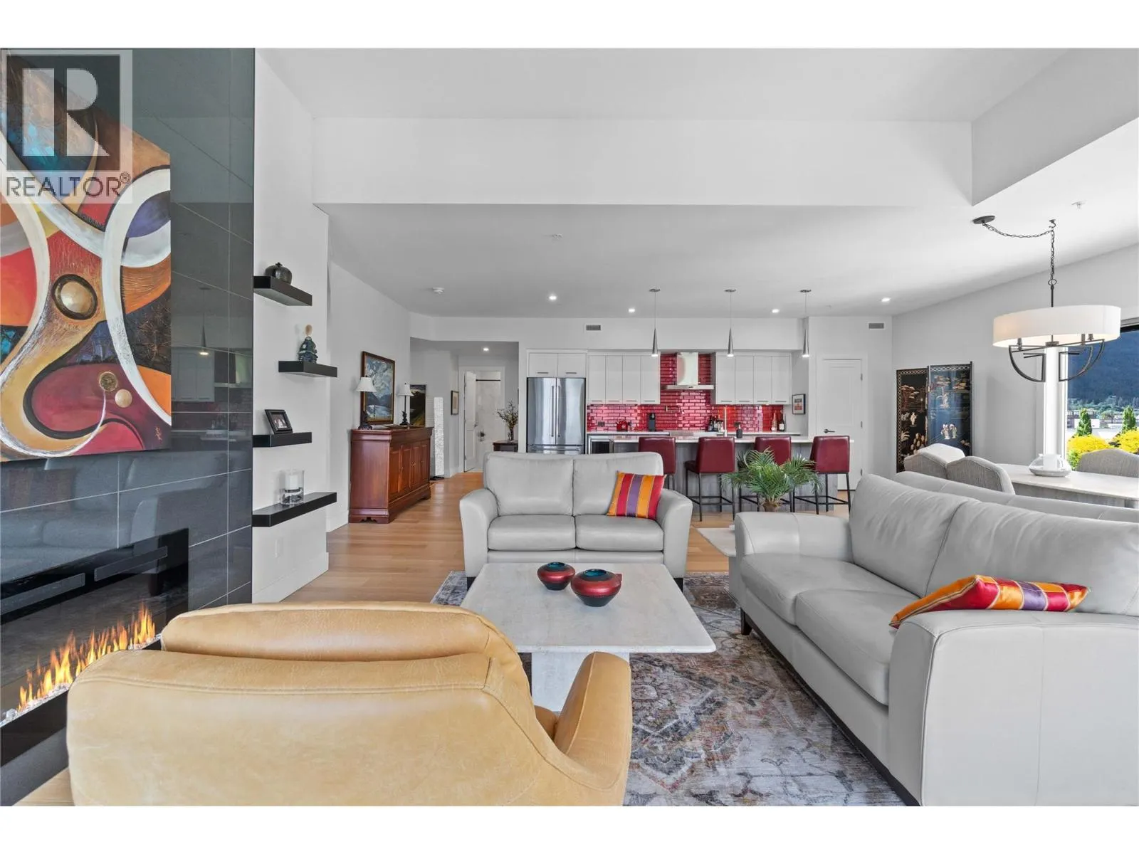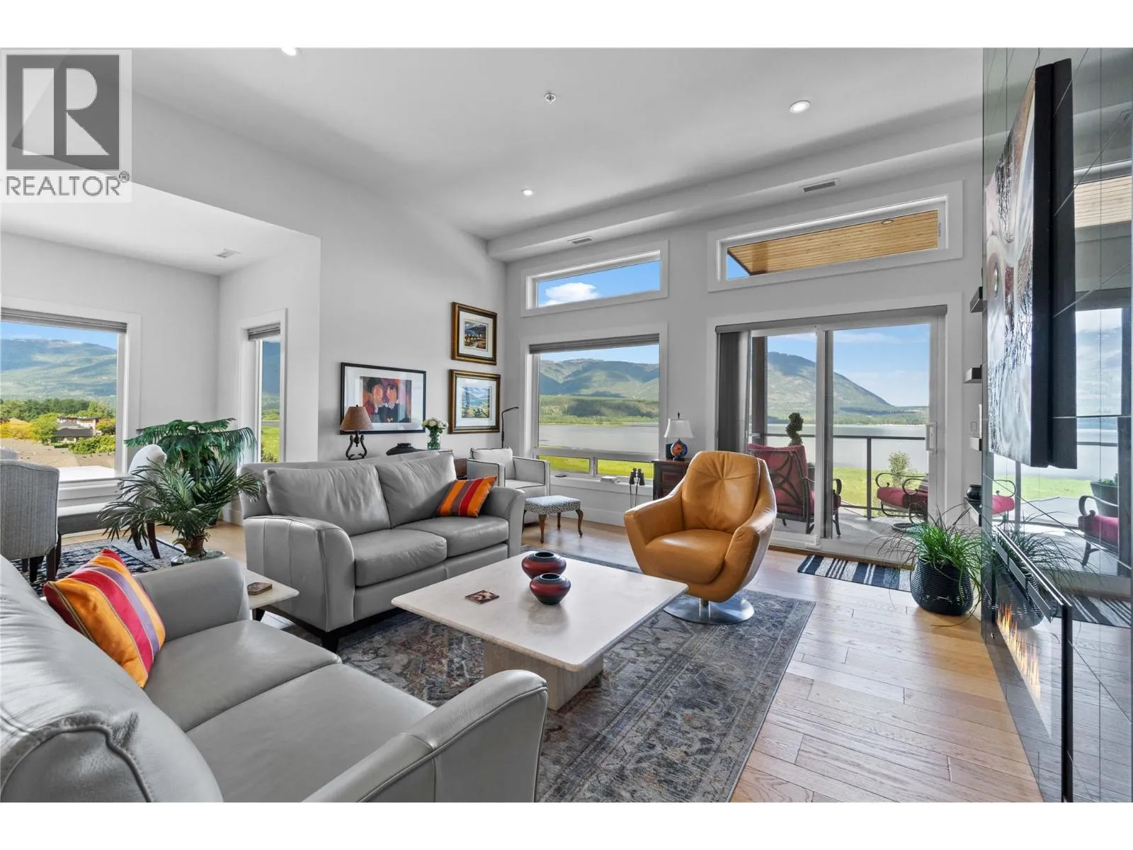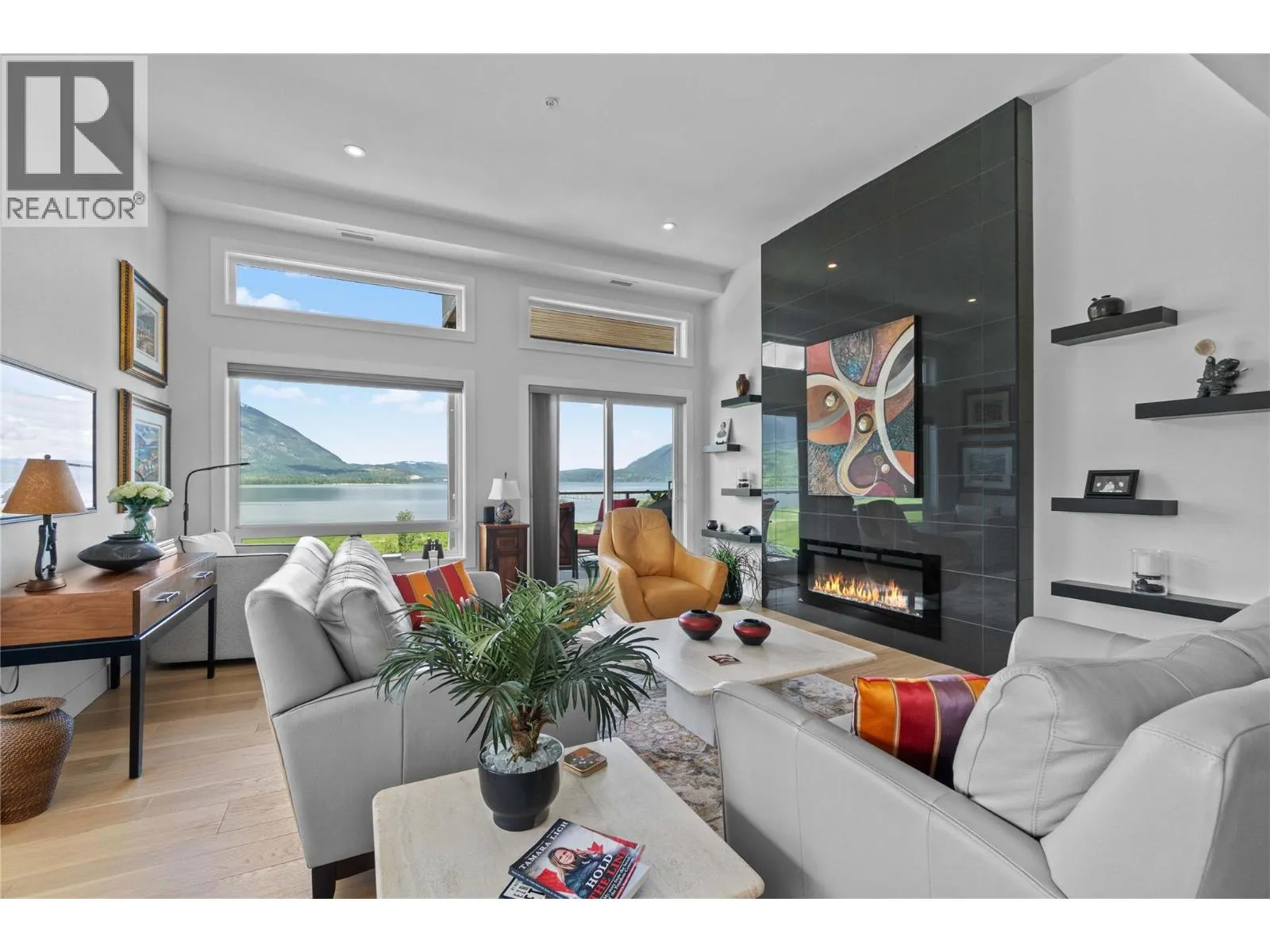 Experience the best of lakeside living in this stunning top-floor condo overlooking the sparkling waters of Shuswap Lake. Built in 2020, this beautifully designed 1,493 sq. ft. home offers two bedrooms, two bathrooms, and an open-concept layout filled with natural light. High ceilings and expansive windows frame breathtaking panoramic views, creating a bright and airy atmosphere throughout. The modern kitchen is both stylish and functional, featuring stainless steel appliances, a large island ideal for entertaining, and a walk-in pantry for added storage. The spacious living area is anchored by a striking floor-to-ceiling electric fireplace, adding warmth, style, and a cozy focal point to the room. The living and dining areas flow seamlessly onto a covered deck, perfect for relaxing while taking in the incredible scenery year-round. The primary suite is a private retreat with direct access to the deck, a generous walk-in closet, and a contemporary ensuite bathroom complete with a walk-in tiled shower. The second bedroom includes custom built-in cabinetry and a desk, offering a flexible space for guests, a home office, or creative use. Additional features include secure underground parking, beautiful modern finishings, and an unbeatable location in downtown Salmon Arm, just steps from restaurants, shops, and the waterfront. This top-floor unit offers the perfect blend of comfort, style, and convenience. (id:27476)