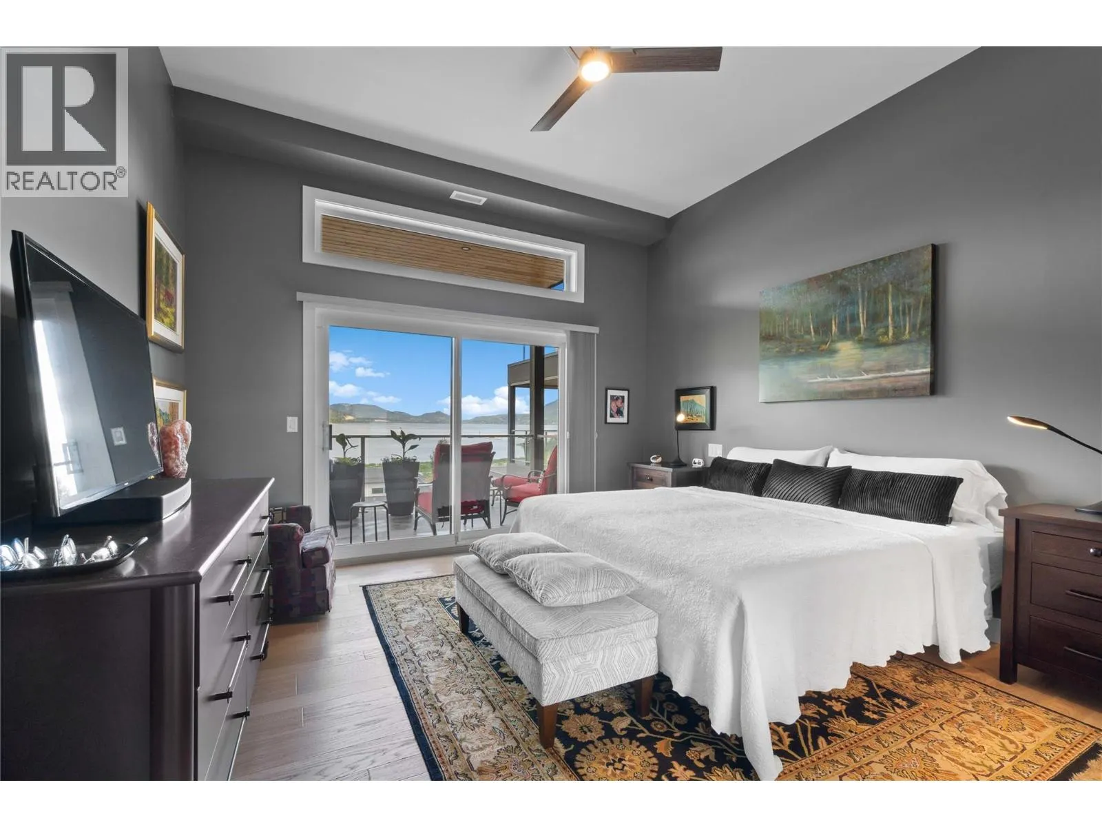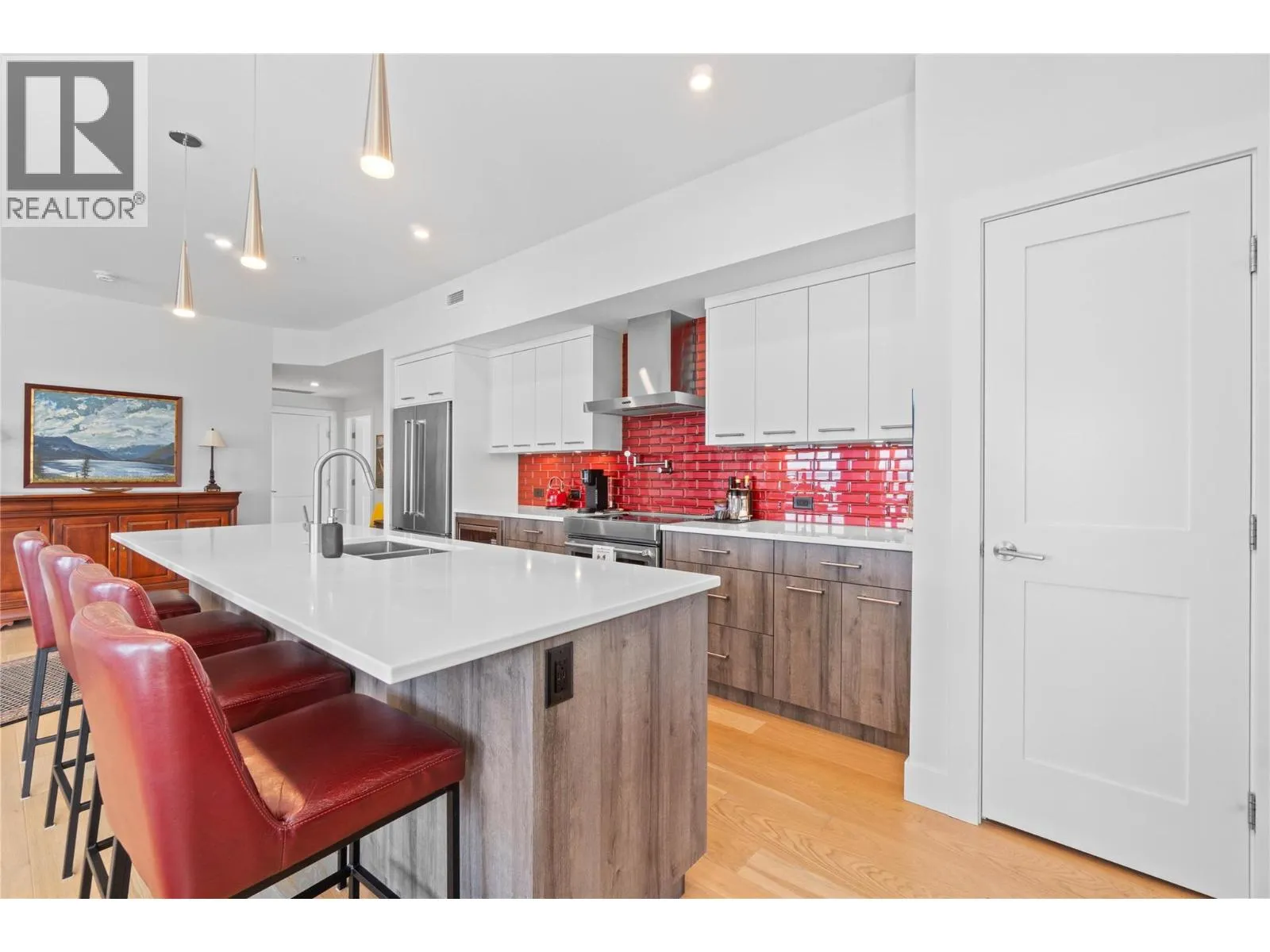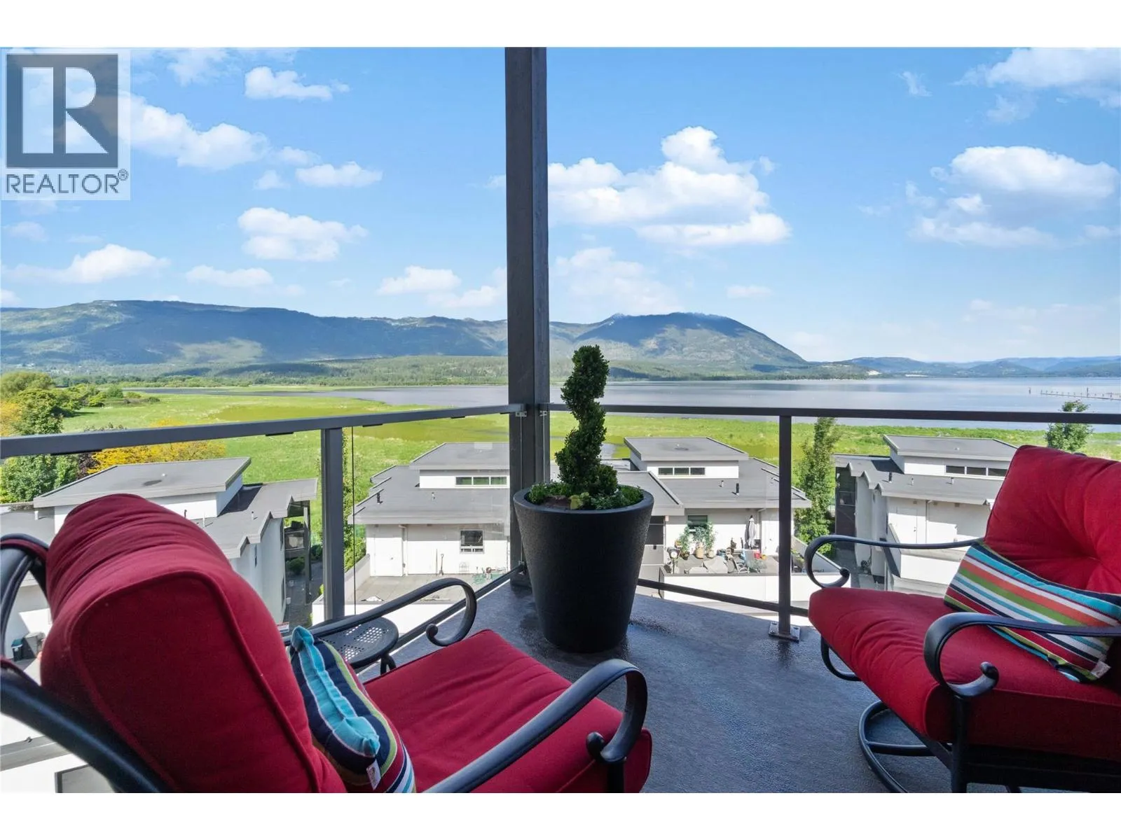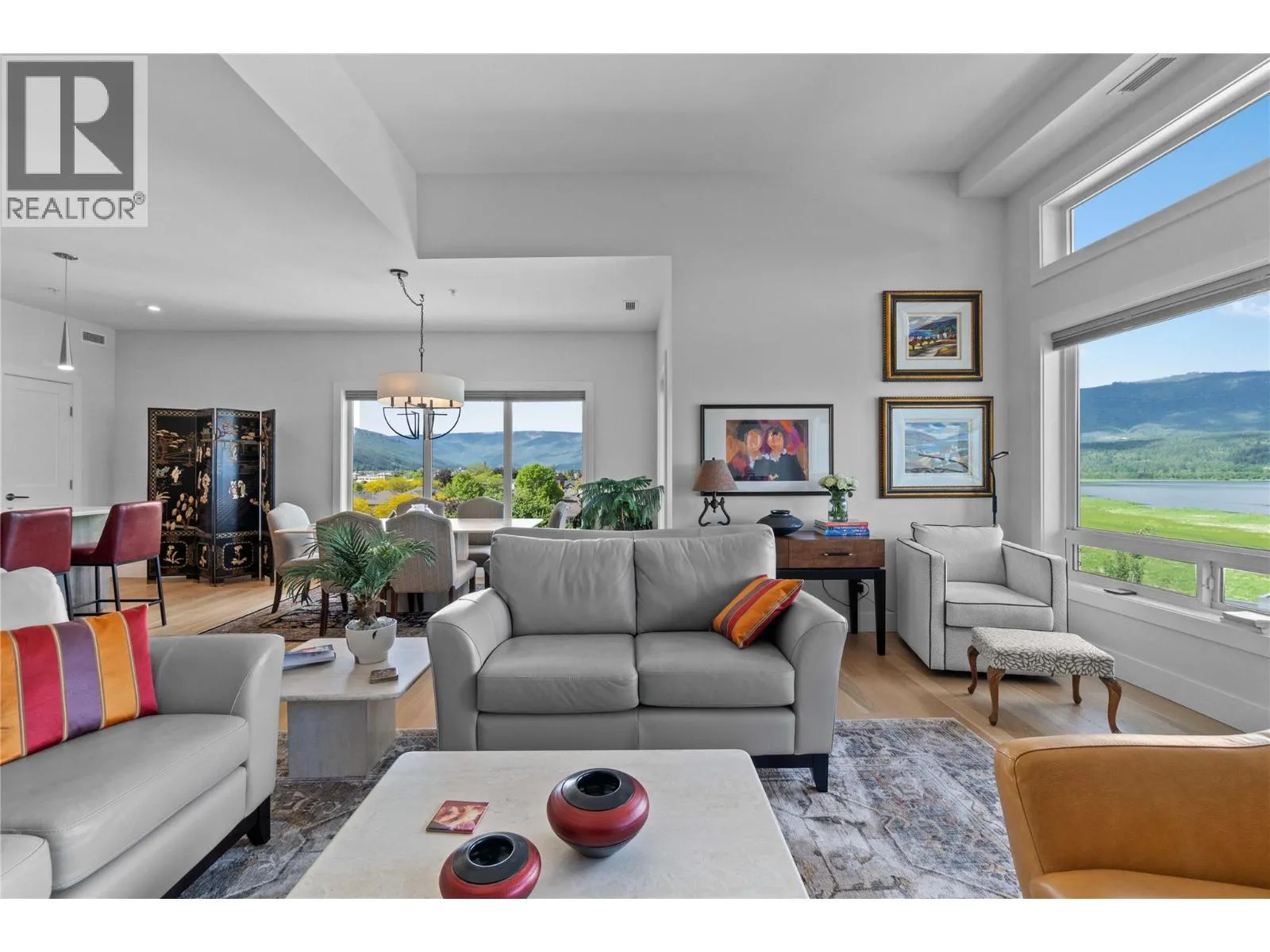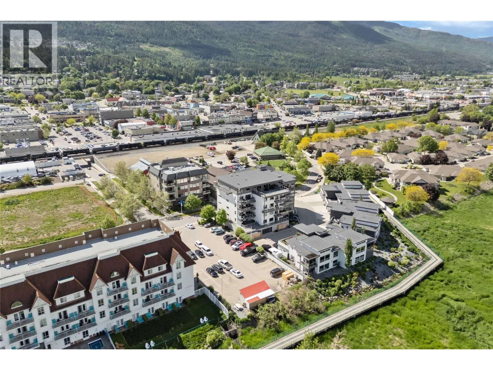 Experience the best of lakeside living in this stunning top-floor condo overlooking the sparkling waters of Shuswap Lake. Built in 2020, this beautifully designed 1,493 sq. ft. home offers two bedrooms, two bathrooms, and an open-concept layout filled with natural light. High ceilings and expansive windows frame breathtaking panoramic views, creating a bright and airy atmosphere throughout. The modern kitchen is both stylish and functional, featuring stainless steel appliances, a large island ideal for entertaining, and a walk-in pantry for added storage. The spacious living area is anchored by a striking floor-to-ceiling electric fireplace, adding warmth, style, and a cozy focal point to the room. The living and dining areas flow seamlessly onto a covered deck, perfect for relaxing while taking in the incredible scenery year-round. The primary suite is a private retreat with direct access to the deck, a generous walk-in closet, and a contemporary ensuite bathroom complete with a walk-in tiled shower. The second bedroom includes custom built-in cabinetry and a desk, offering a flexible space for guests, a home office, or creative use. Additional features include secure underground parking, beautiful modern finishings, and an unbeatable location in downtown Salmon Arm, just steps from restaurants, shops, and the waterfront. This top-floor unit offers the perfect blend of comfort, style, and convenience. (id:27476)