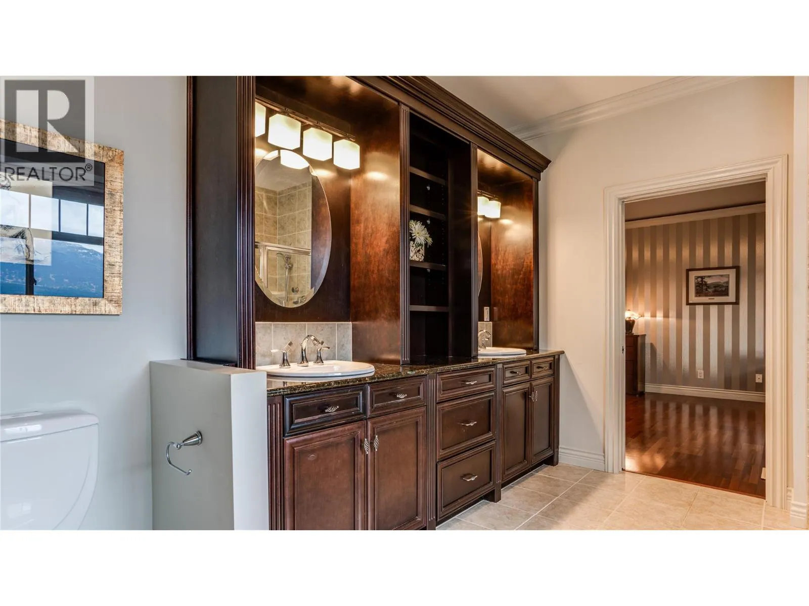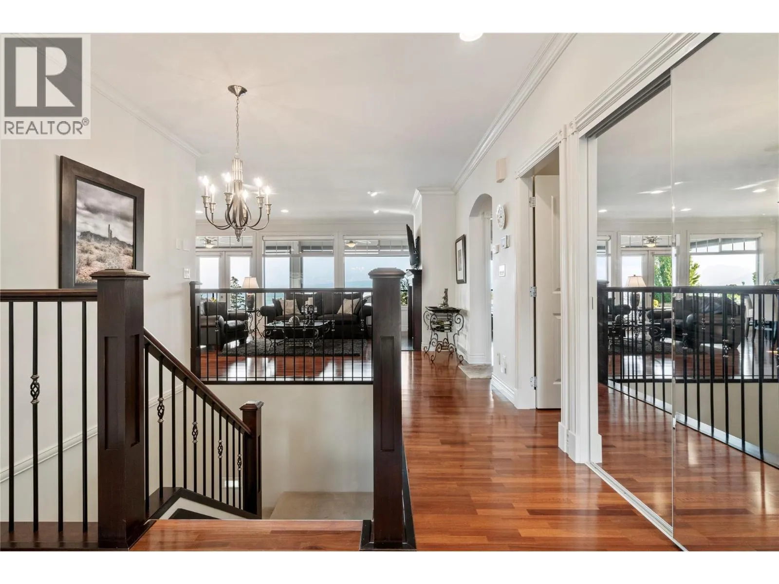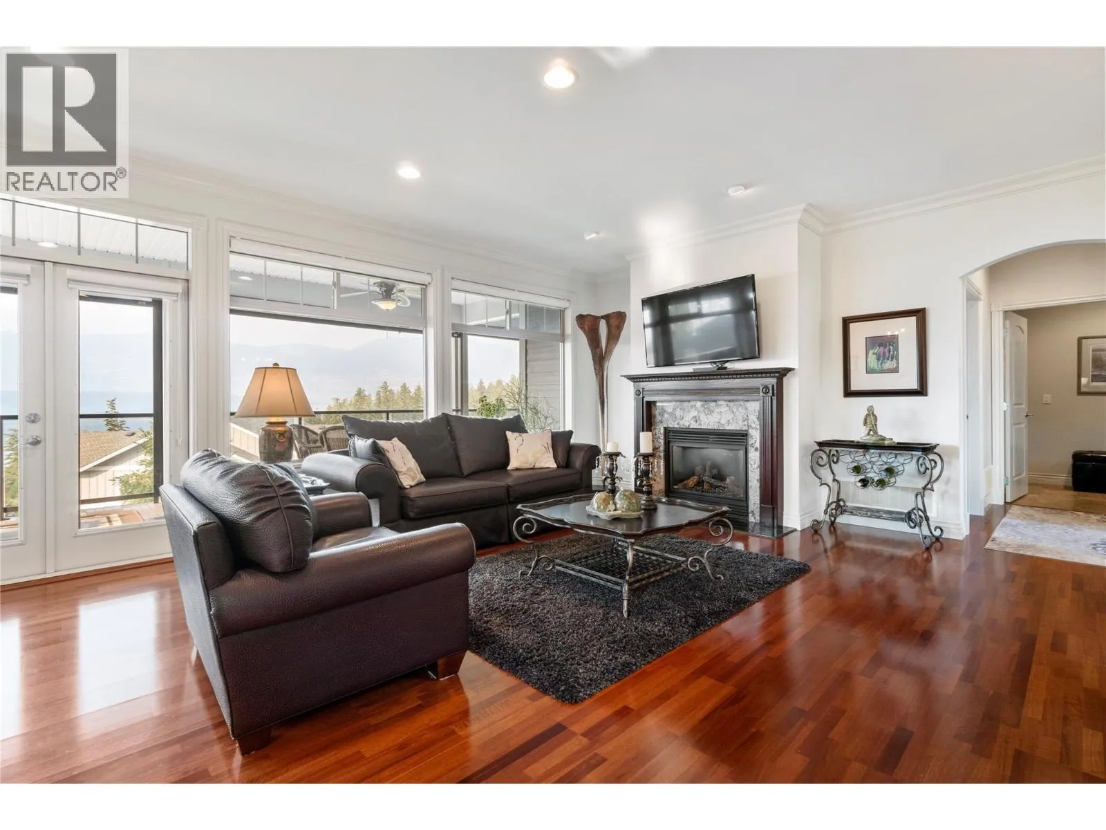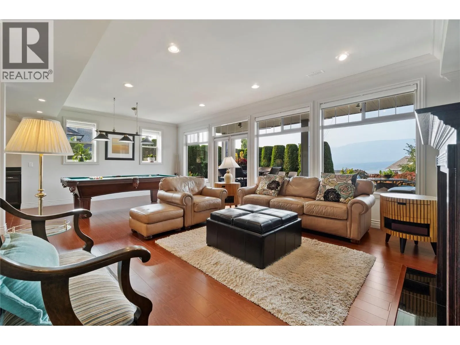 Thoughtfully designed for premium living, this majestic property features all-new professional landscaping, including a recently constructed Japanese-style trellis. Extensive upgrades, to name only a few, include a flex room/gymnasium, interior and exterior paint, new carpet, lighting, plumbing, and an EV charger. Details such as 9â ceilings, crown mouldings, gas fireplaces, and hardwood and laminate flooring are present throughout the main and lower levels. A stunning low-maintenance front entrance offers great curb appeal. The foyer is a pocket of calm. We are drawn to a focal point in the Great Room, showcasing sweeping lake and mountain views. An inviting gourmet kitchen, an open dining and living room, a private barbecue deck, new appliances, new granite countertops, a pantry, and updated lighting greet the eye. French doors lead to a full-width covered terrace with glass railings, re-surfaced flooring, and automatic privacy shades. The impressive vaulted primary bedroom, opening to the terrace, offers a spa-inspired ensuite room and a newly designed walk-in closet. A wide corridor connects the main entrance to an impressive vaulted executive office, a convenient powder room, and a large laundry room, which exits to the extra-large double garage. The lower-level entertainment room becomes a cozy lounge for socializing in a statement bar and games room. The guest area includes a full bathroom, a library, three large bedrooms, and a gym/flex room (with its own full bath, private exit, and storage). (id:27476)