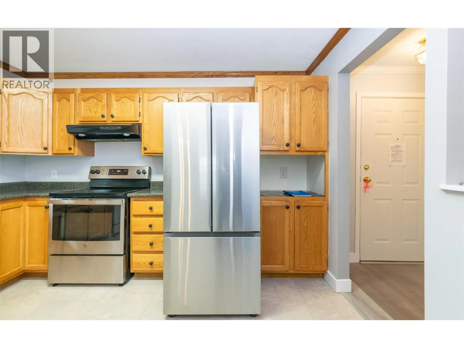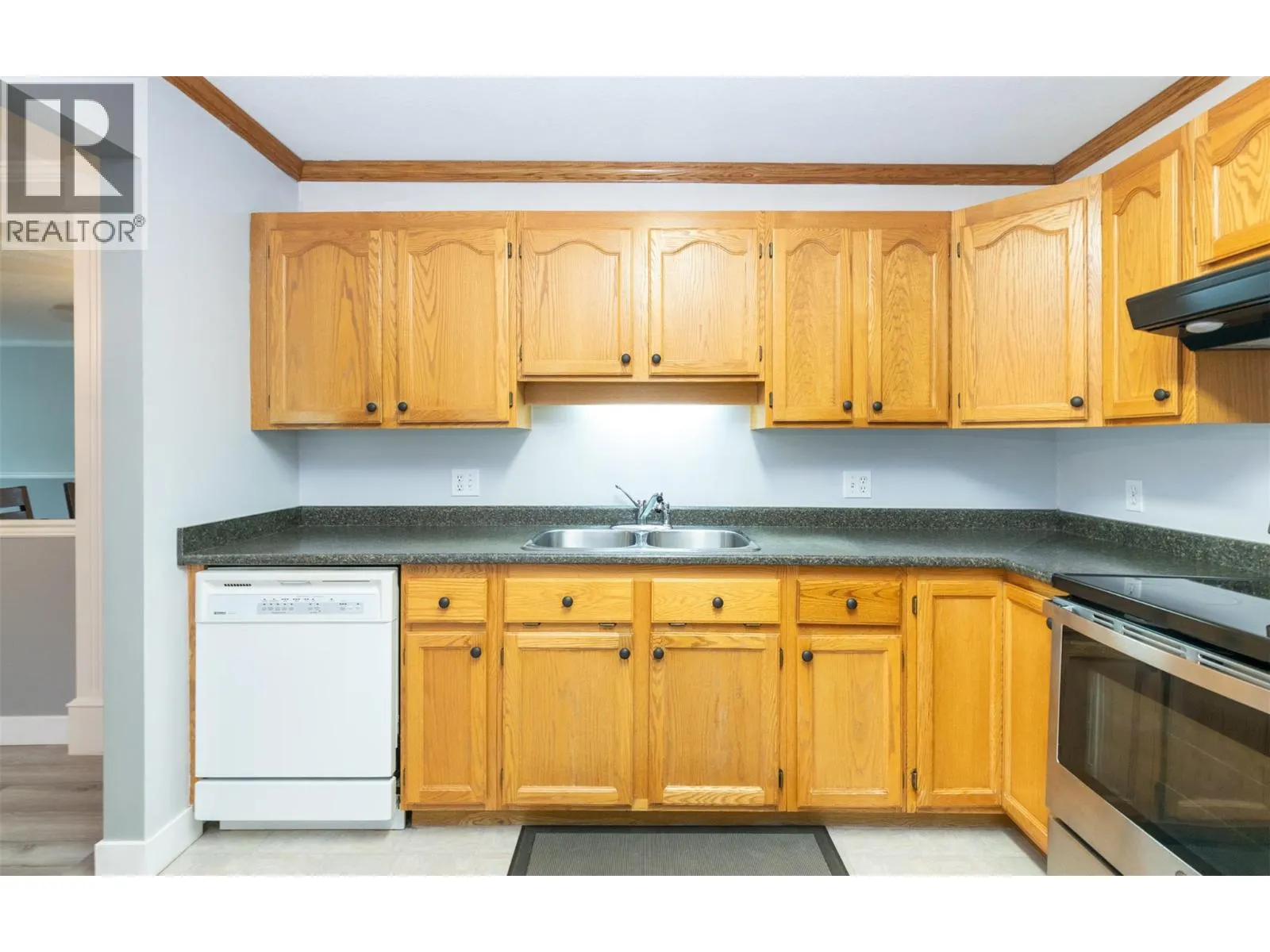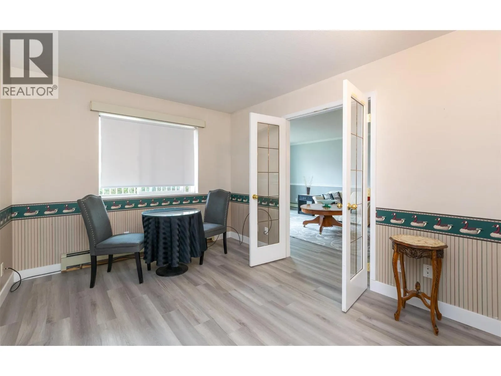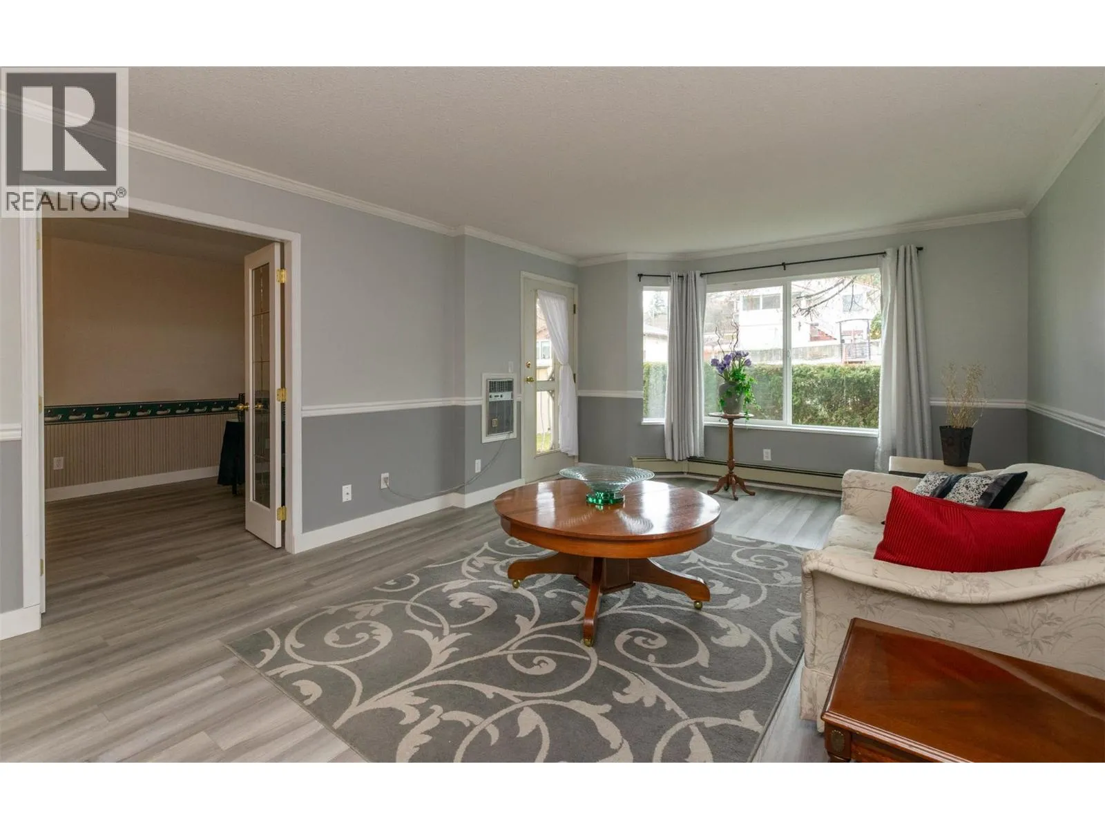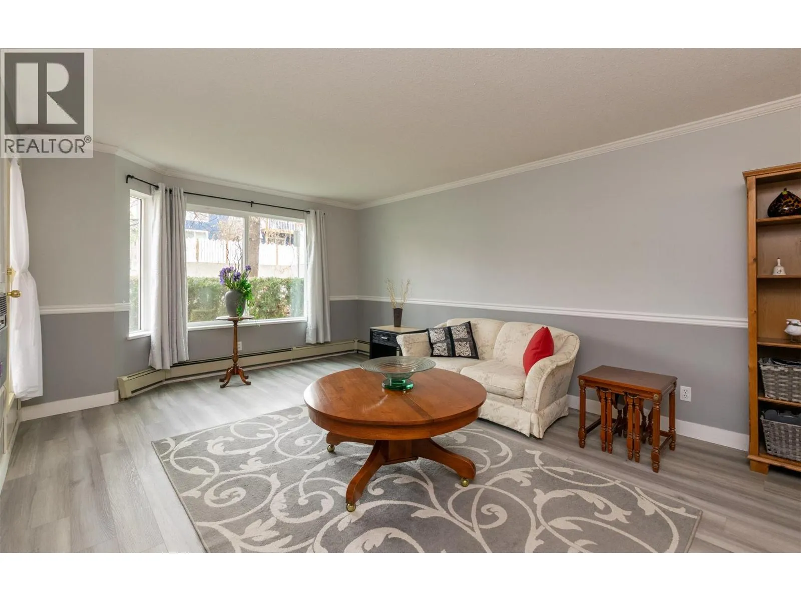 Move in ready ground floor unit in popular McIntosh Grove. Recent updates of some flooring and trim have freshened this 2 bedroom, 2 bathroom home. Spacious kitchen with eating bar, open living areas with french doors leading to your second bedroom/den. The primary suite features a spacious walk-in closet and 4 piece ensuite. Off the living area is a covered patio space that looks over the grounds. Amenities include secure underground parking, a common room with library, kitchen and games, exercise room and workshop. Located in a 55+ strata building where your monthly strata fees include hot water and heat. A short drive or walk to downtown amenities and shopping. (id:27476)