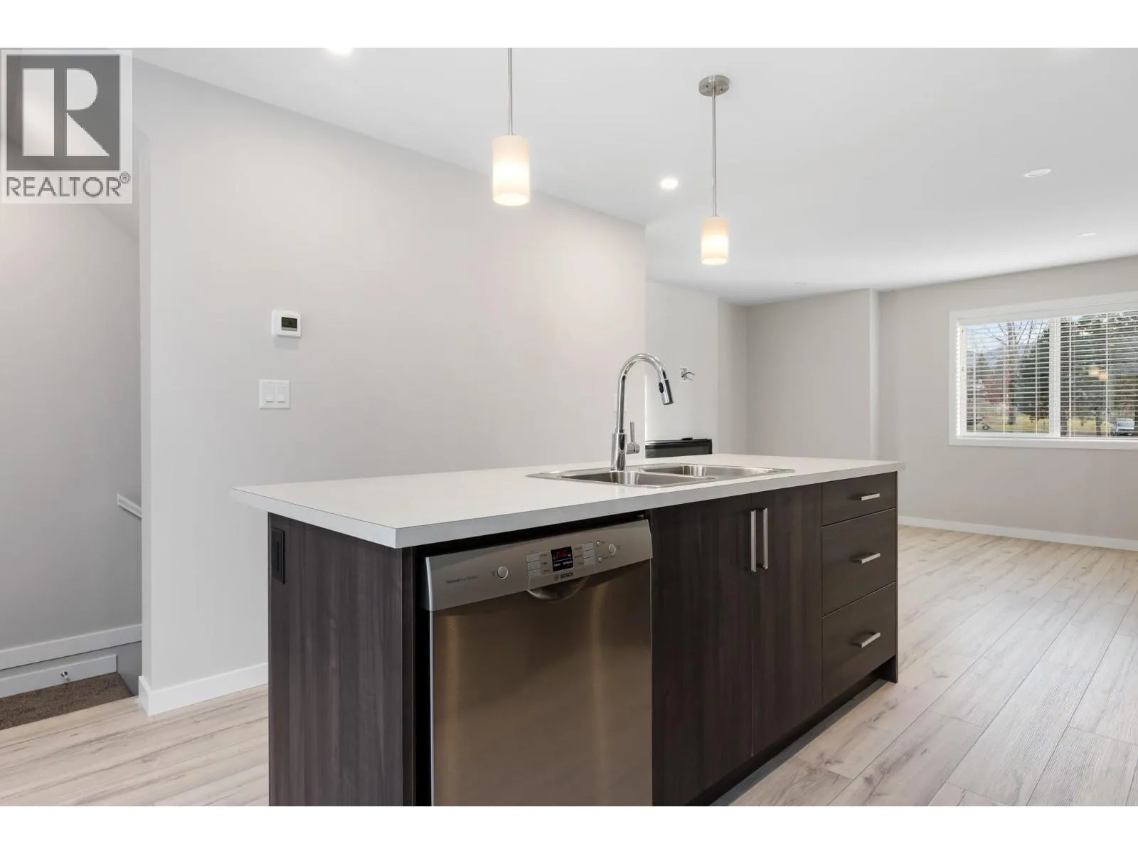 Welcome to this end-unit townhome ideally situated in a prime location within the complex, enjoy a great outlook and beautiful views of Mt. Ida right from home. Located in a sought-after uptown neighbourhood, all within walking distance to shopping, restaurants, and everyday amenities. Offering 3 bedrooms and 1.5 bathrooms, this home features a bright and functional open-concept main floor designed for modern living. The kitchen is the heart of the home with a large island, pantry storage, and plenty of prep spaceâperfect for both everyday meals and entertaining. The dining area provides direct access to the deck, creating a seamless indoor-outdoor flow, while the living room is warmed by a cozy electric fireplace. A convenient powder room completes the main level. Upstairs, youâll find three bedrooms, including a spacious primary suite with cheater ensuite access to the full bathroom. The laundry room is thoughtfully located on the upper floor for added convenience. The tandem double garage offers ample parking and extra storage space, making this home as practical as it is inviting. A fantastic opportunity to own a move-in ready home in a prime locationâperfect for first-time buyers, downsizers, or investors alike. (id:27476)