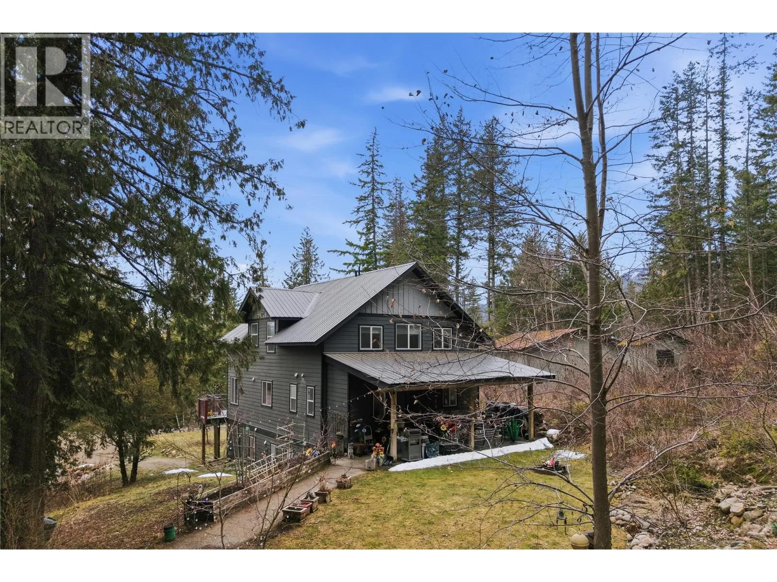 1.61 Acres! 3 bed, 3 baths with a 1 bedroom suite with a den and a detached Shop/Garage with a unfinished Carriage house waiting for YOU! Tucked away in a partially wooded small acreage with a creek flowing through the backyard, this one-of-a-kind owner-built home offers the perfect balance of privacy, craftsmanship, and flexibility. Just minutes from Salmon Arm and close to Larch Hills skiing and outdoor recreation, the setting alone is hard to beat. The main level entry floor features a 1 bedroom, full 4-piece bathroom and a bright, open-concept layout ideal for comfortable, accessible living. The kitchen shines with soft-close cabinetry, a marble island with breakfast bar, farmhouse sink, 5-burner gas range, and a convenient spice drawer. Sliding doors off the dining area lead to the deck for seamless indoor-outdoor living, while the living room is warmed by a cozy wood stove and opens to a bright reading room filled with windows and natural light, perfect for your morning coffee! Laundry on main as well. Upstairs, the spacious primary suite offers a ensuite with a soaker tub, while the second bedroom features its own private bathroom. The daylight walkout basement features a 1 bedroom + den suite, with a modern kitchen, a gas fireplace, and a full bathroomâideal for extended family or added income. Outside is a detached double garage/shop offers ample space, with an unfinished upper level ready for your ideas! Measurements are by IGUIDE are approximate (id:27476)
