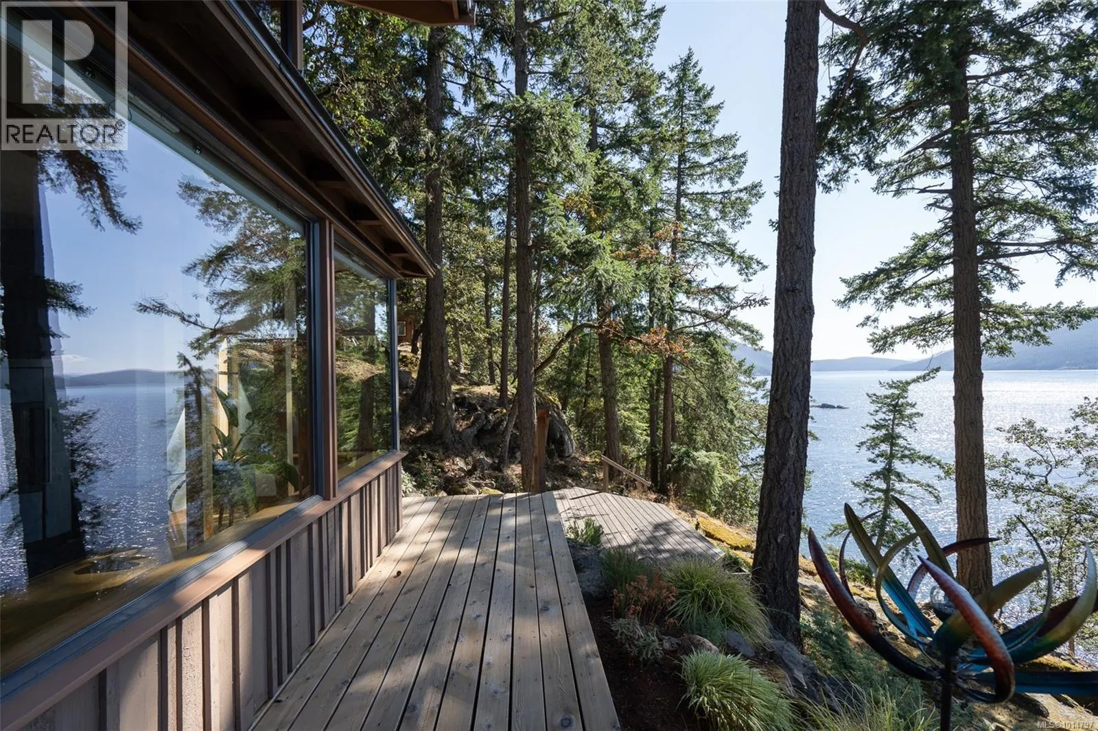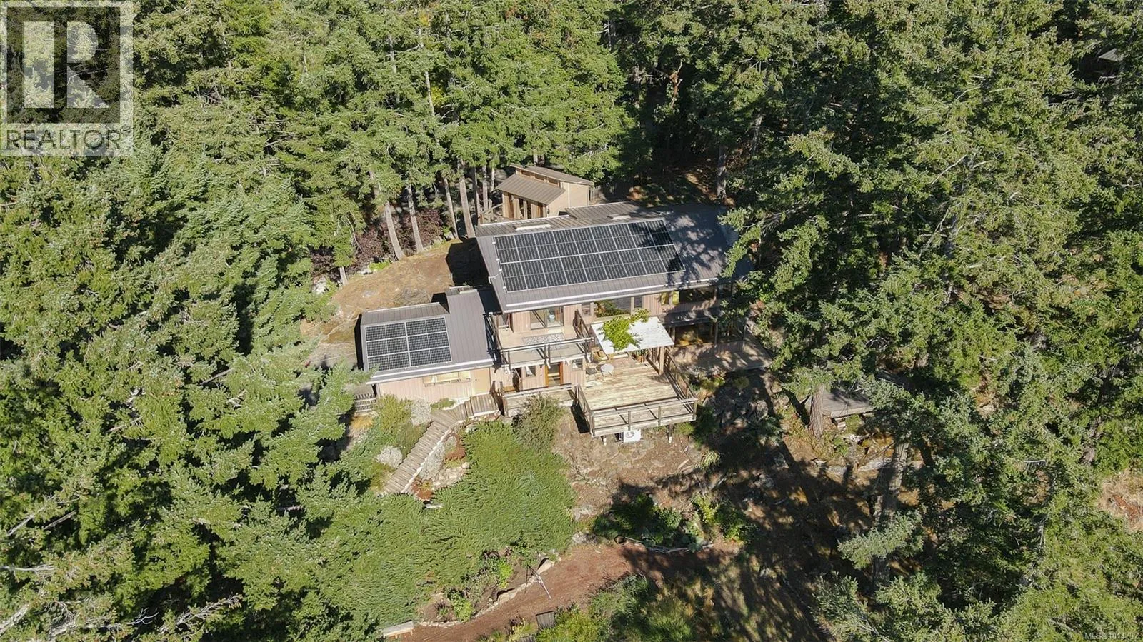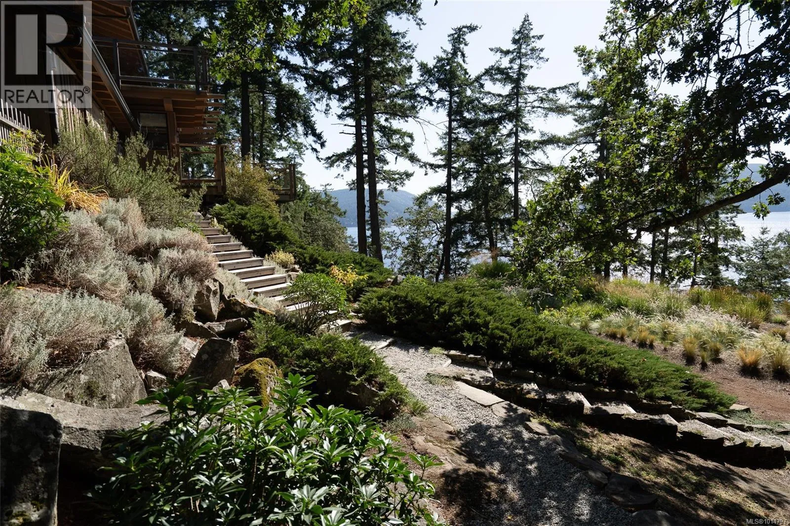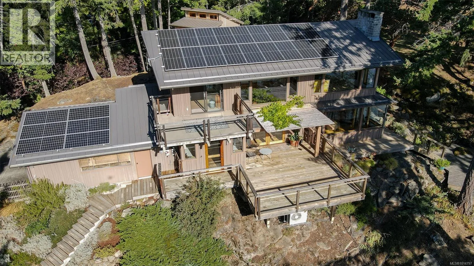 Architect-designed Hank Schubart waterfront retreat â sun-drenched, thoughtfully composed spaces with panoramic southwest views of Sansum Narrows and Vancouver Island. Move-in ready 3 bed, 2 bath plus serene studio (perfect for yoga, meditation or guests) with over 2,400 sq ft of finished living and an open, luminous main living area that flows to the water. Extensive upgrades include grid-tied solar with battery storage, metal roof, upgraded systems, and impeccably designed manicured landscaping with rainwater collection. A half-acre is deer-fenced containing a productive food garden that brims with annuals, perennials, shrubs and trees. Quiet, private yet easy access to ferries and area trails â a sustainable, restorative coastal haven where light, landscape and design harmonize. (id:27476)