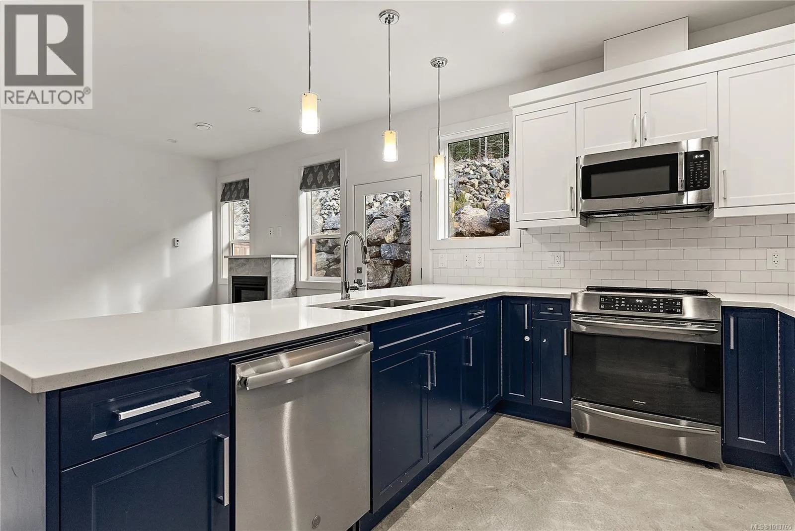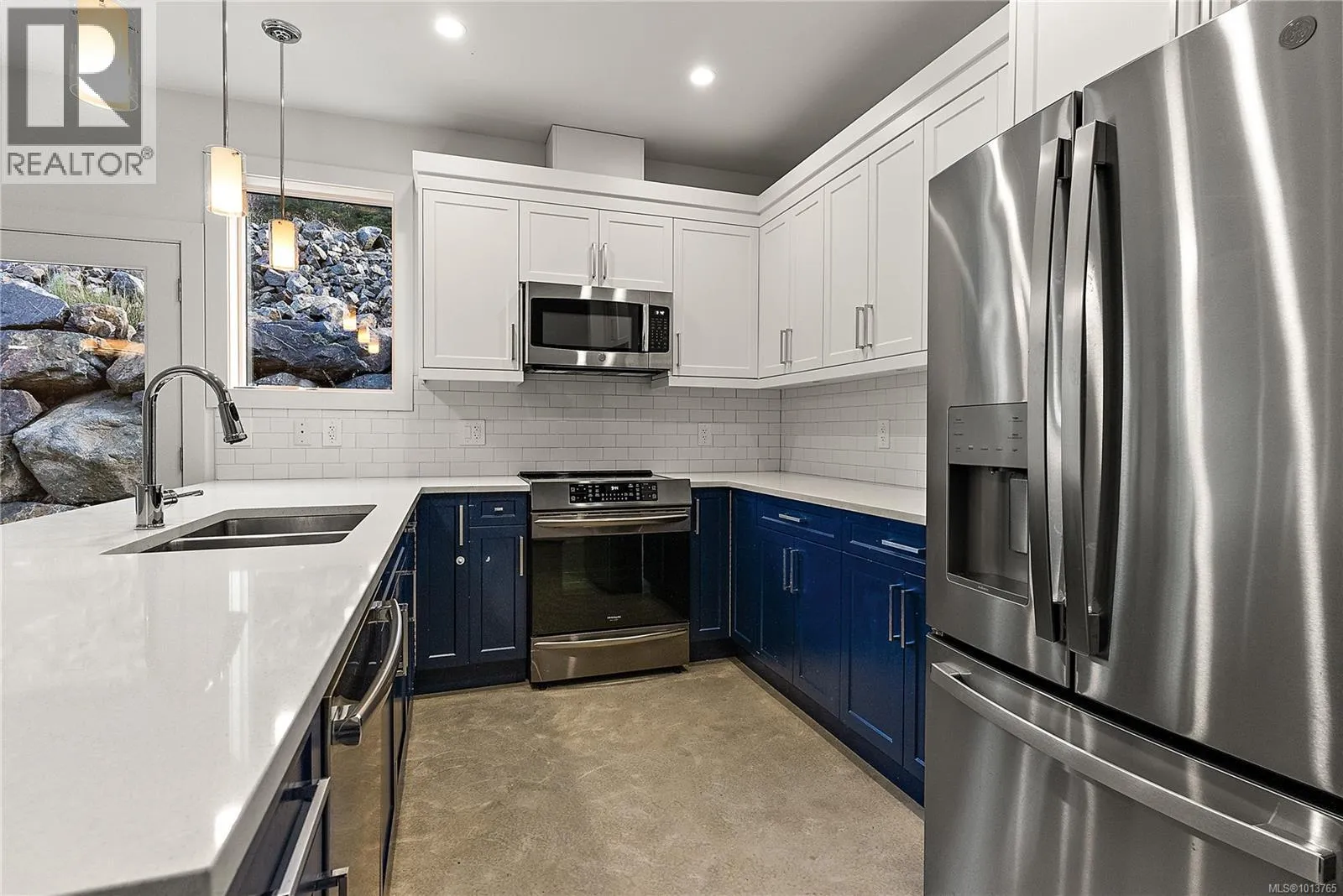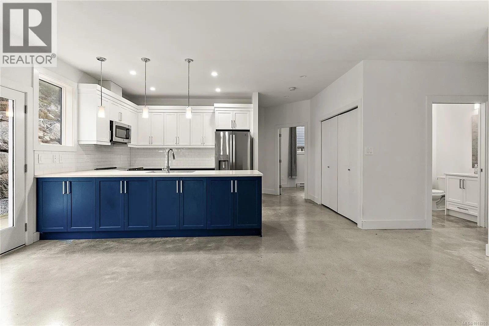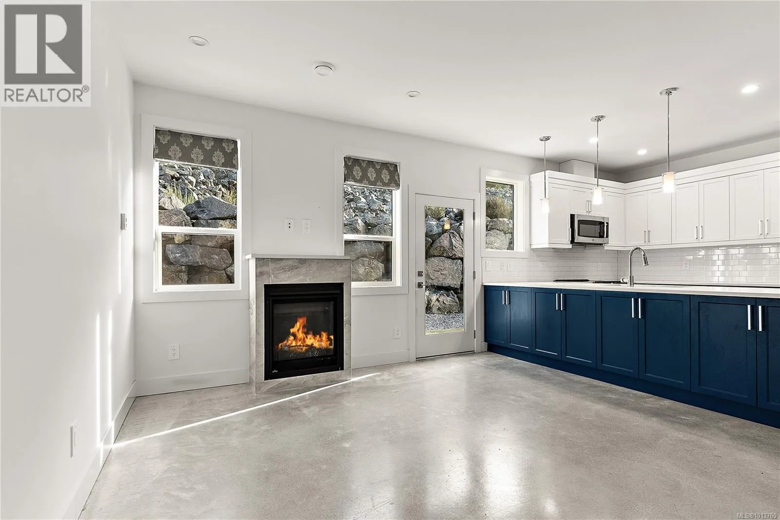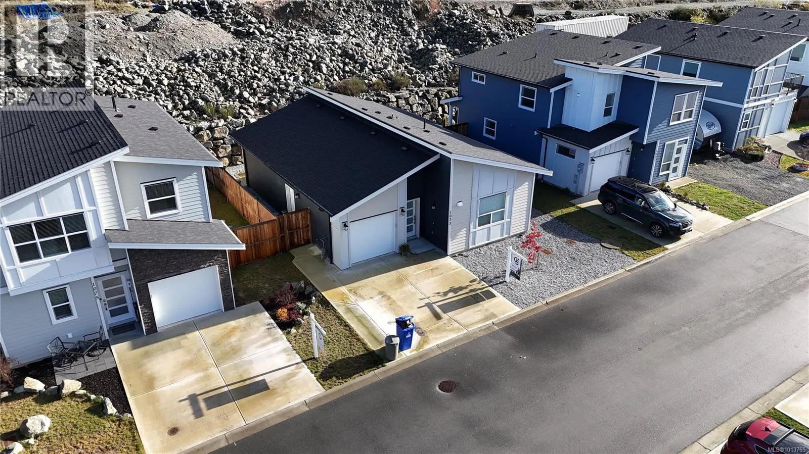 Introducing a stunning nearly new rancher for sale in the coveted Shawnigan Heights neighborhood. This modern home boasts a garage and double width driveway, offering ample parking and storage space. Enjoy the ease of single-level living and a thoughtfully designed layout that maximizes comfort and functionality. With high-quality finishes throughout, including quartz counters, stainless appliances, soft close cabinets and polished concrete floors, this home exudes contemporary elegance. You will love the open concept, no step living with soaring high ceilings and natural gas fireplace. Complete with 2 large bedrooms, 2 full bathrooms and a spacious den/office. Enjoy the benefits of having a new home warranty without paying the GST! Located in a sought-after area, residents can enjoy the tranquility of suburban living while being just 15 mins to amenities, schools, parks, and more. Don't miss the opportunity to own this exceptional property. (id:27476)