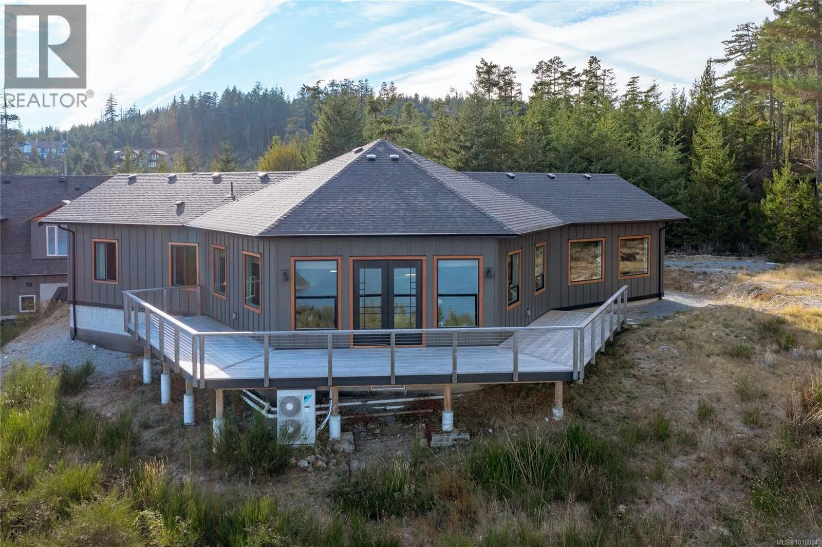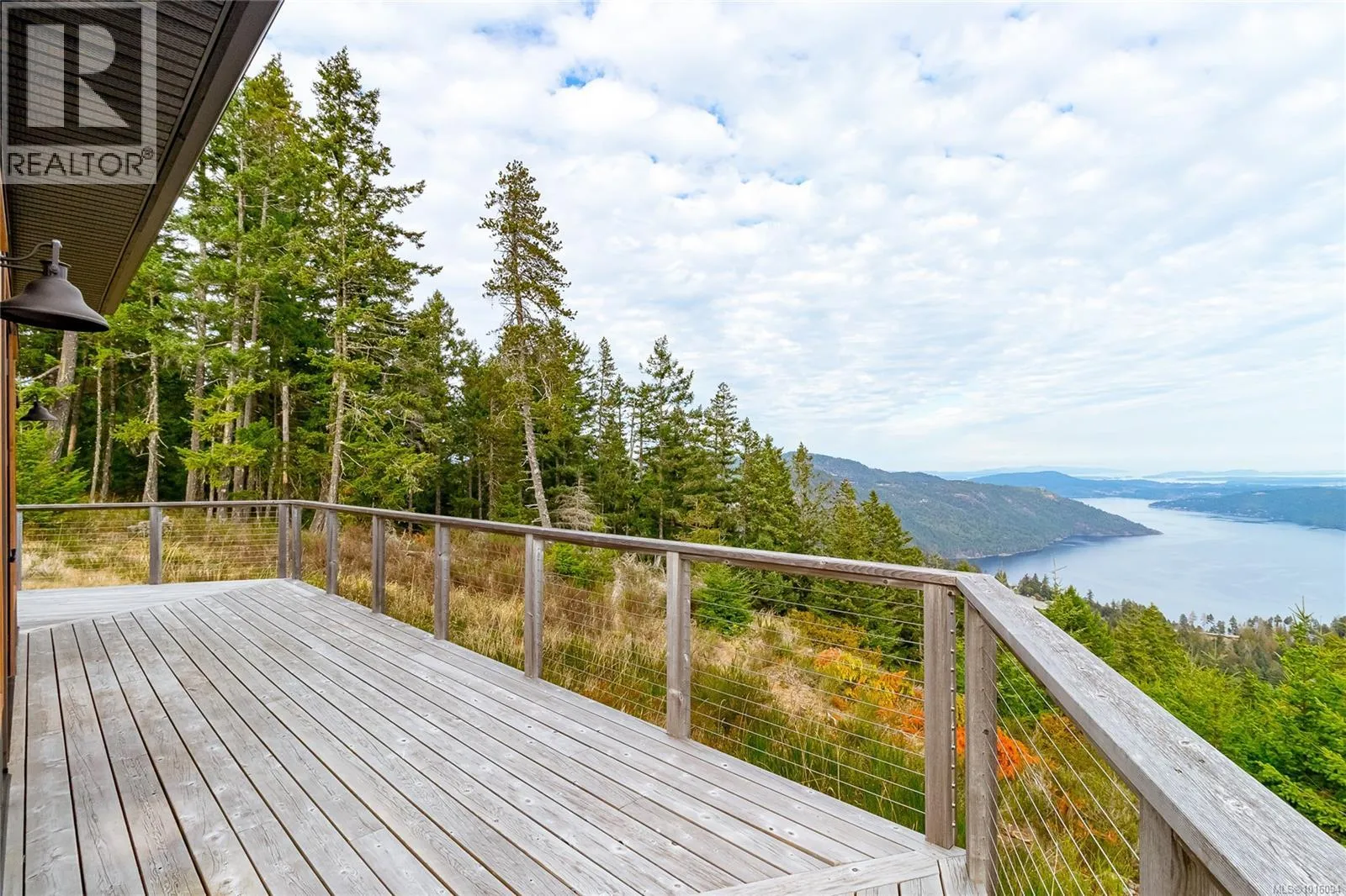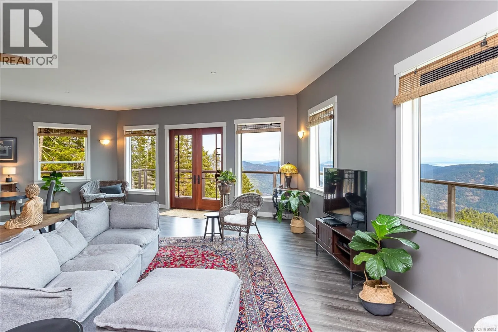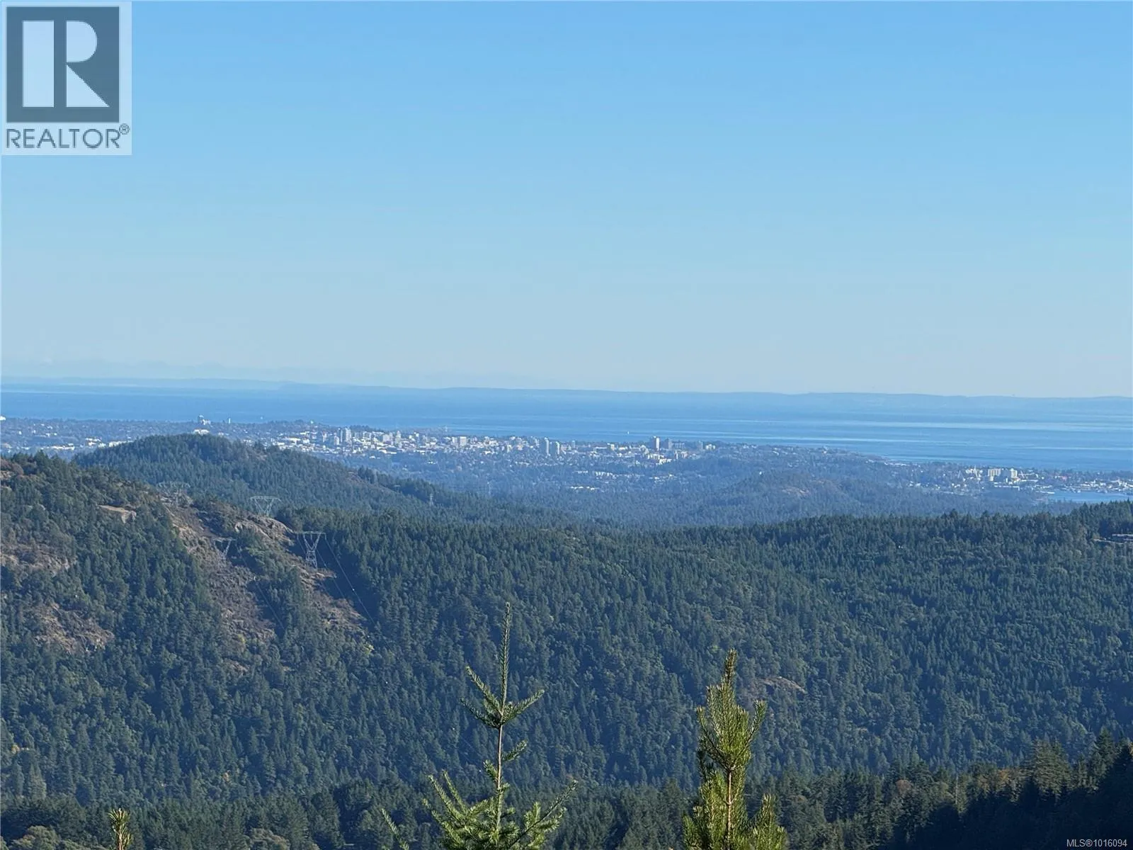 Perched on a mountainside in Goldstream Heights, this breathtaking 5.9 acre estate offers exceptional privacy and panoramic views of Finlayson Arm, Mt. Baker, the Gulf & San Juan Islands, downtown Victoria, and the Peninsula. The property features a modern 3-bed, 2-bath rancher (2,030 sq. ft.) and a detached 1-bed, 1-bath carriage house (1,025 sq. ft.) with a 1,225 sq. ft. triple garage/shop. Both dwellings are mobility-friendly, offering single-level living and ground-level access. Designed to capture the views from nearly every room, the home showcases 10â ceilings, oversized windows, an open-concept layout, a gourmet kitchen with propane range, and a spa-inspired ensuite. Enjoy outdoor living on the 600 sq. ft. wraparound deck. Additional features include a fully ducted heat pump, state-of-the-art fire suppression system, and low-maintenance landscaping. Located on a quiet cul-de-sac with direct access to horse and hiking trails, the Sooke Hills Wilderness Trail, and Wrigglesworth Lake, all just 20 minutes to Langford or Mill Bay. (id:27476)