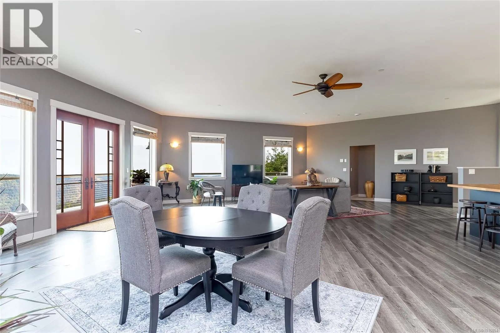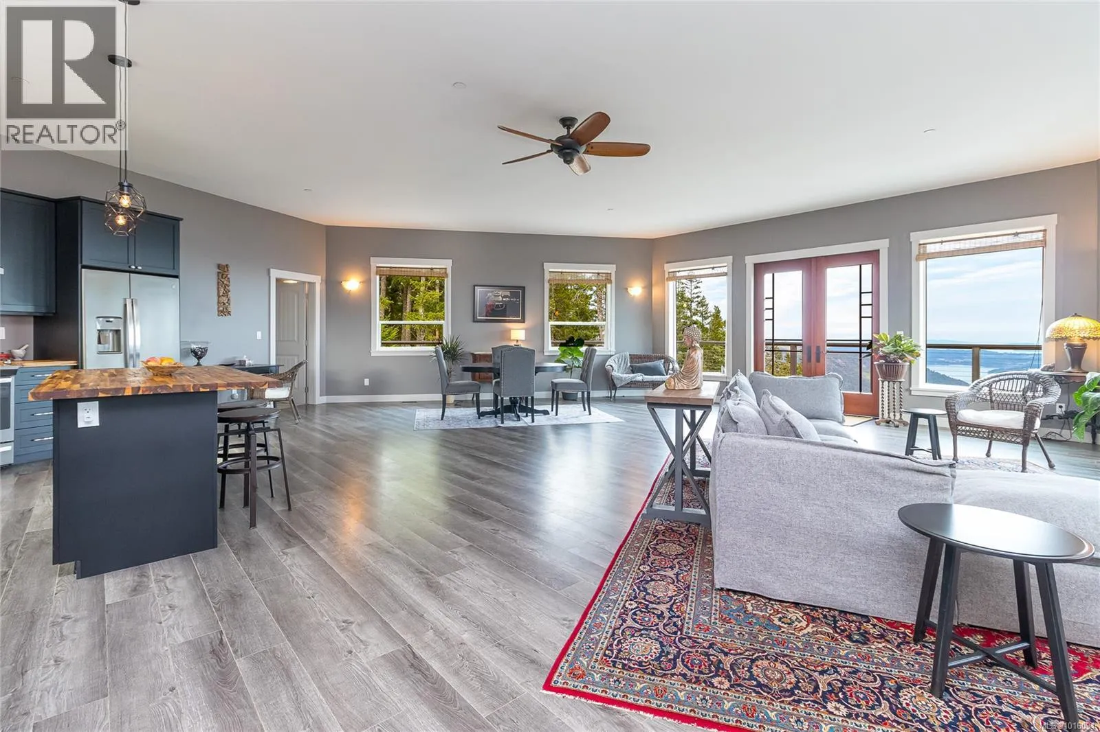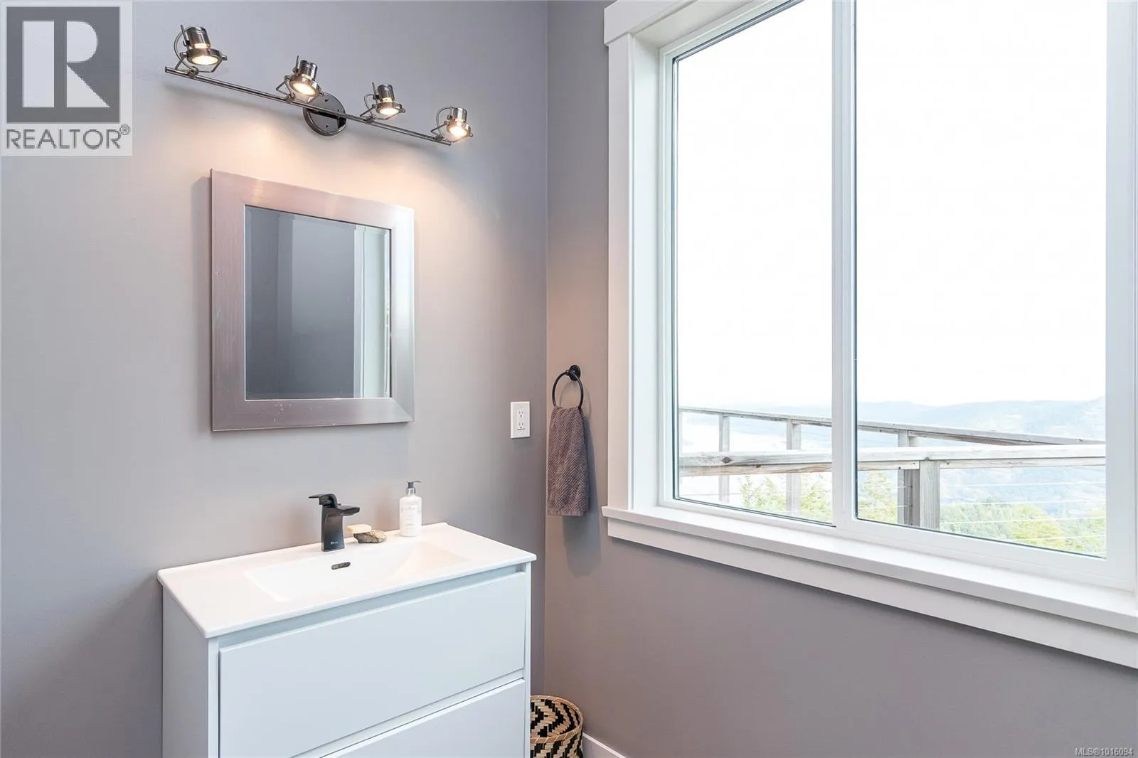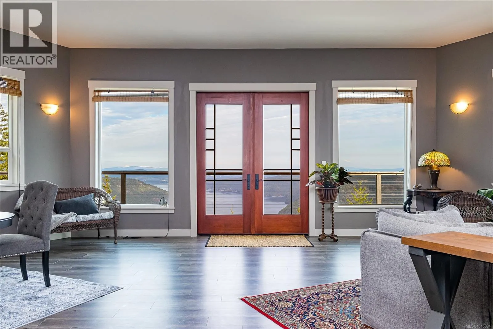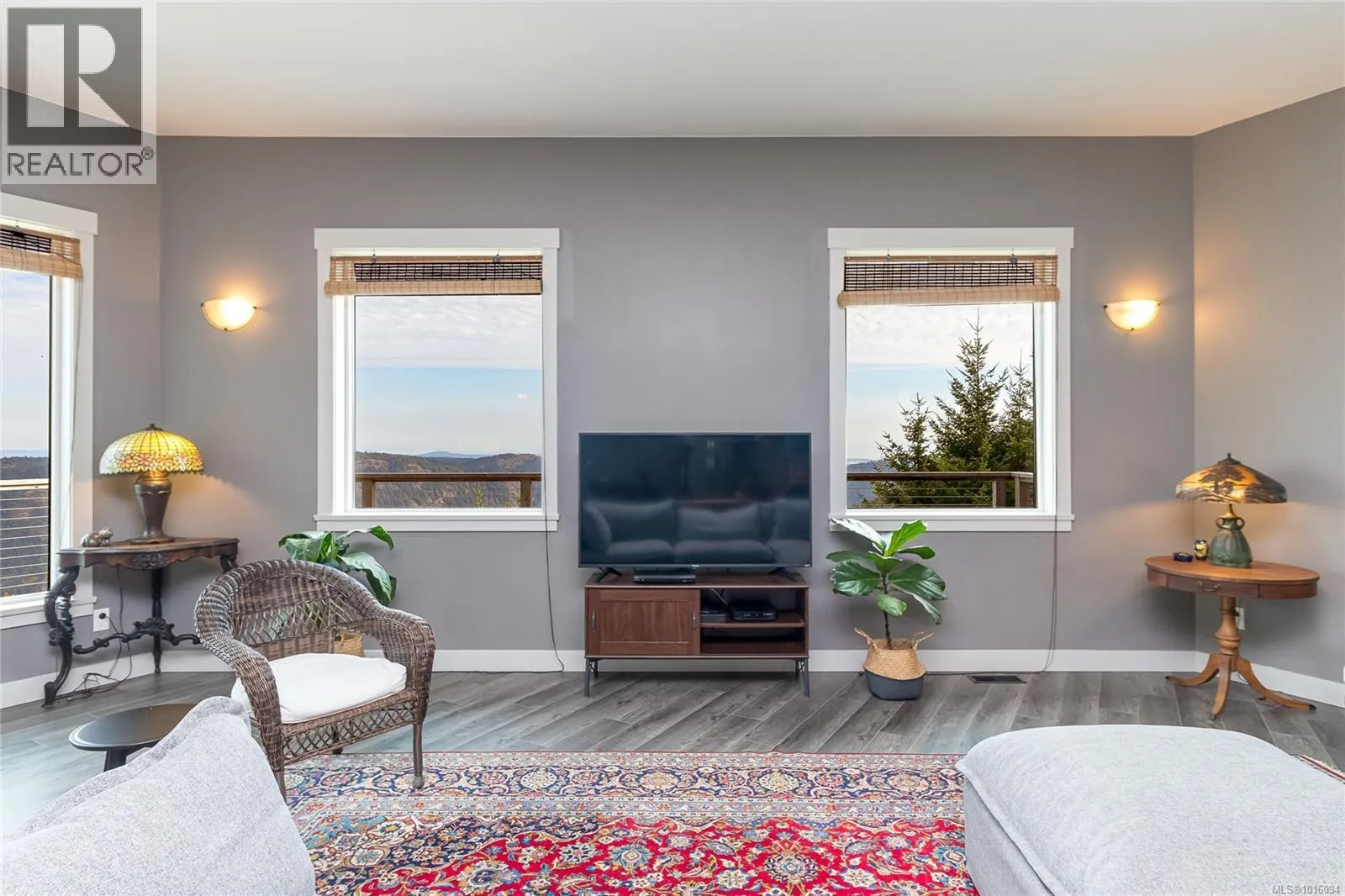 Perched on a mountainside in Goldstream Heights, this breathtaking 5.9 acre estate offers exceptional privacy and panoramic views of Finlayson Arm, Mt. Baker, the Gulf & San Juan Islands, downtown Victoria, and the Peninsula. The property features a modern 3-bed, 2-bath rancher (2,030 sq. ft.) and a detached 1-bed, 1-bath carriage house (1,025 sq. ft.) with a 1,225 sq. ft. triple garage/shop. Both dwellings are mobility-friendly, offering single-level living and ground-level access. Designed to capture the views from nearly every room, the home showcases 10â ceilings, oversized windows, an open-concept layout, a gourmet kitchen with propane range, and a spa-inspired ensuite. Enjoy outdoor living on the 600 sq. ft. wraparound deck. Additional features include a fully ducted heat pump, state-of-the-art fire suppression system, and low-maintenance landscaping. Located on a quiet cul-de-sac with direct access to horse and hiking trails, the Sooke Hills Wilderness Trail, and Wrigglesworth Lake, all just 20 minutes to Langford or Mill Bay. (id:27476)