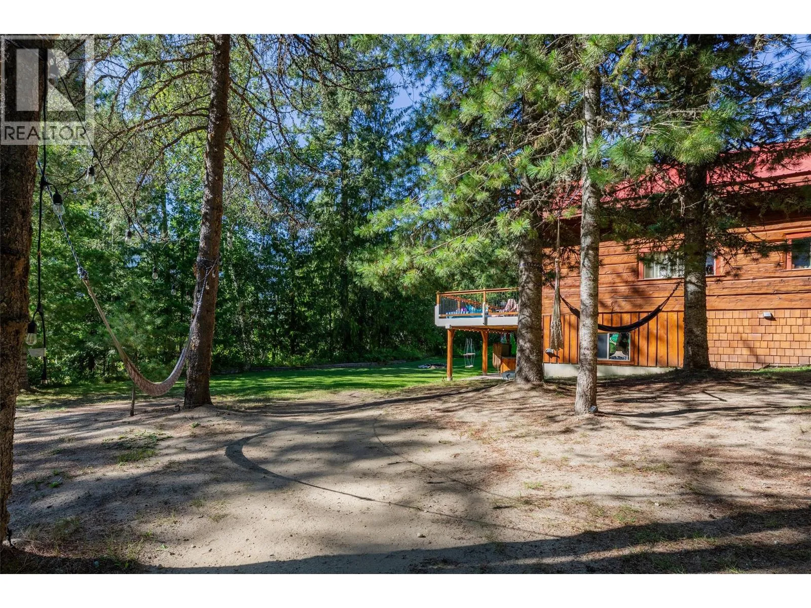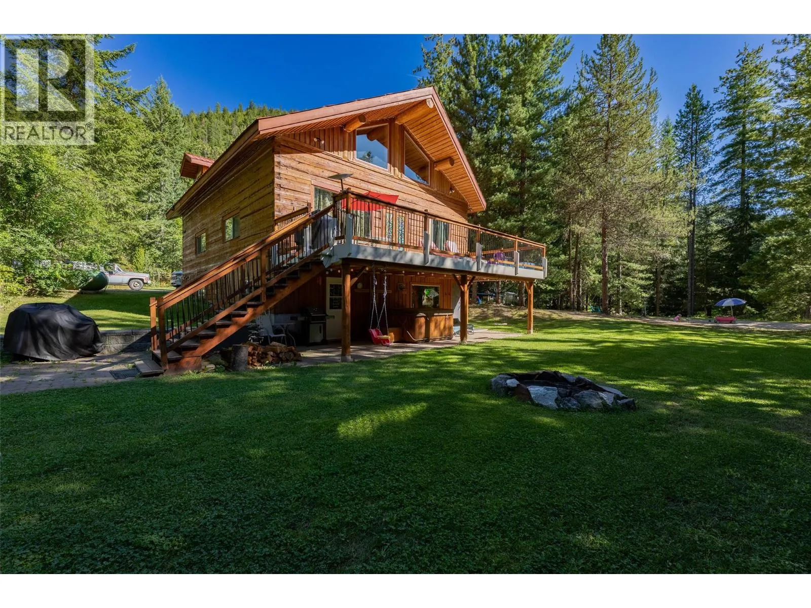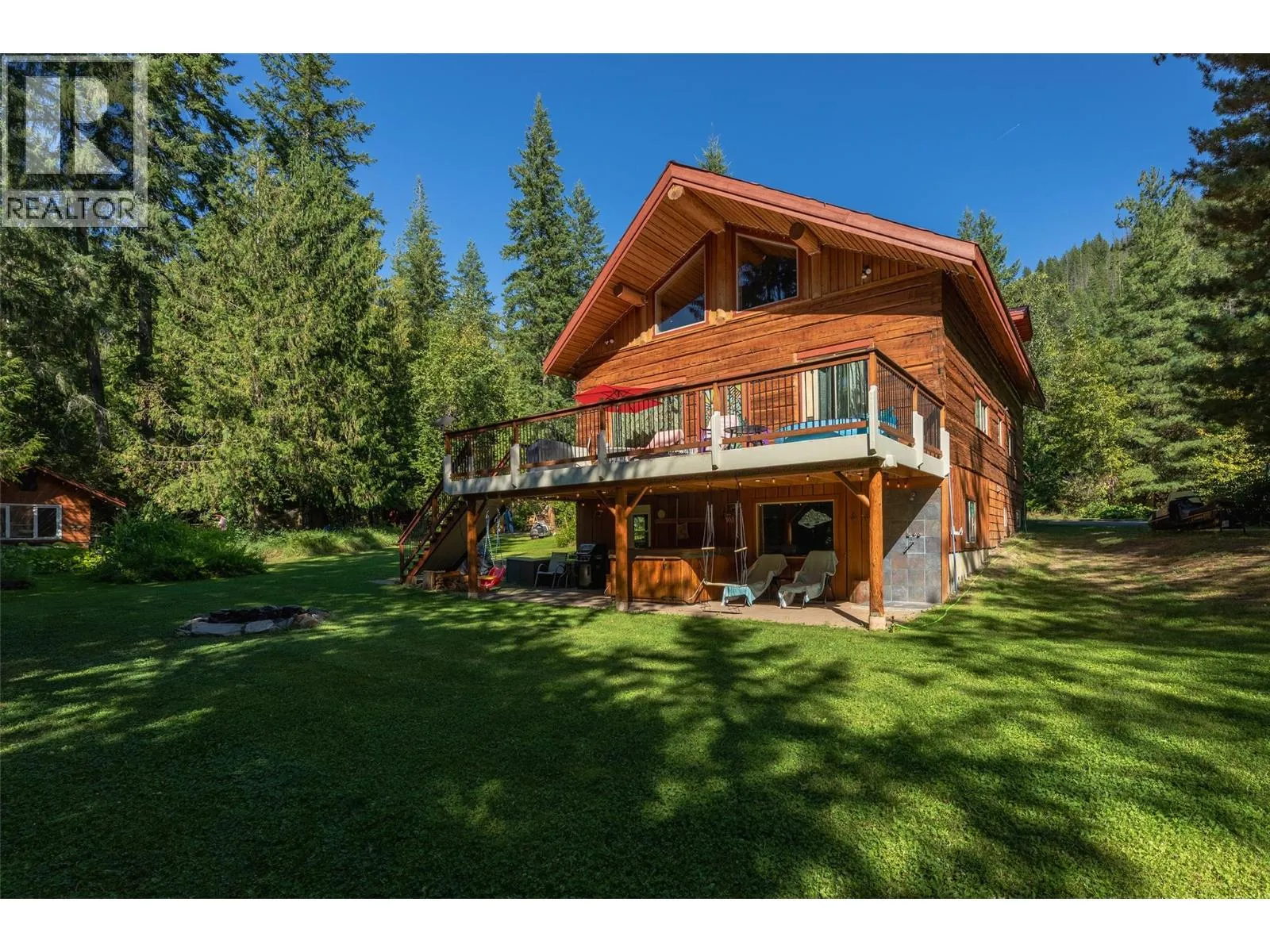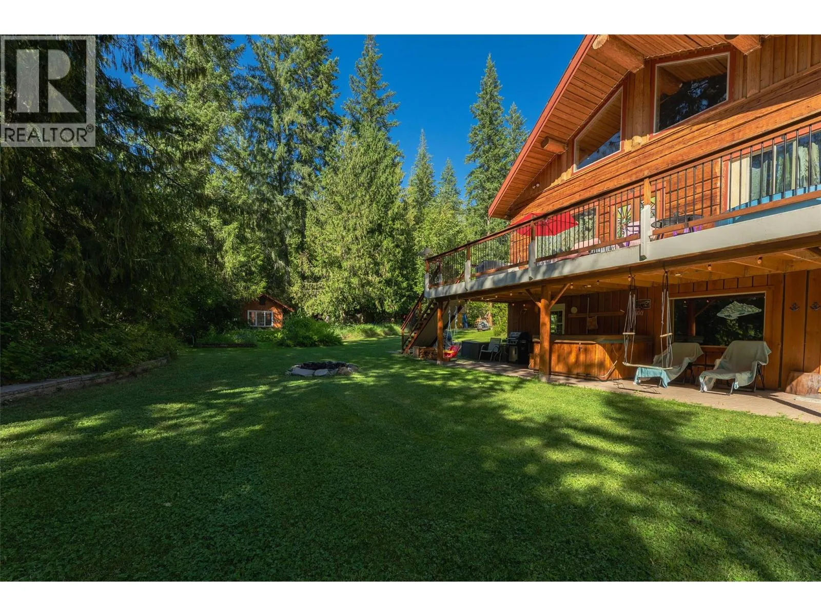 Rare Offering in Sicamous! Tucked away on 1.48 private acres, this custom Finlander hand-axed barn home is full of character and charm. With 4 bedrooms and 3 bathrooms, including a full suite downstairs that provides excellent short-term rental opportunities to help offset your mortgage, this home offers both comfort and income potential. Located only 5 minutes from downtown Sicamous, the boat launch, and the public beach, the property also features 70 feet of river frontage on Owl Creek, pastoral mountain views, and direct access to crown land right behind you. Outdoor living is at its best here with a large sundeck, hot tub with outdoor shower, fire pit, gardens, fruit trees, and a fully paved RV spot. A walk-out basement adds flexibility for family or guests, making this property a true Shuswap gem that blends privacy, lifestyle, and natural beauty. (id:27476)