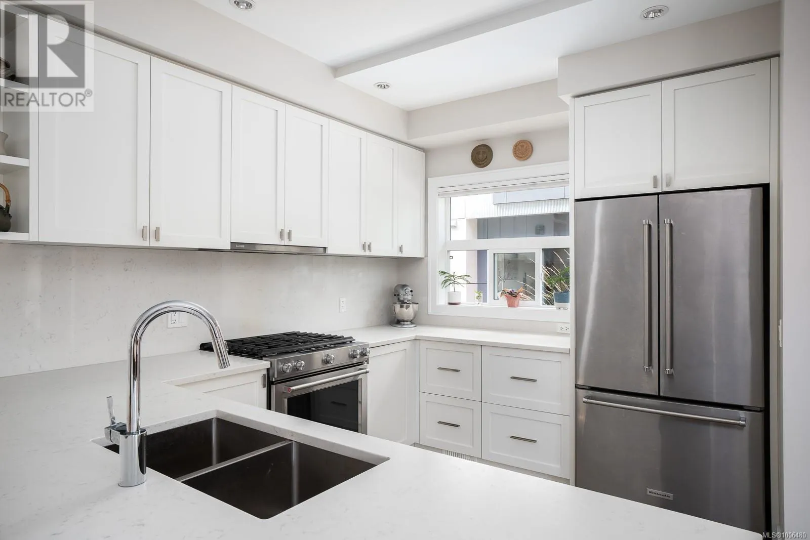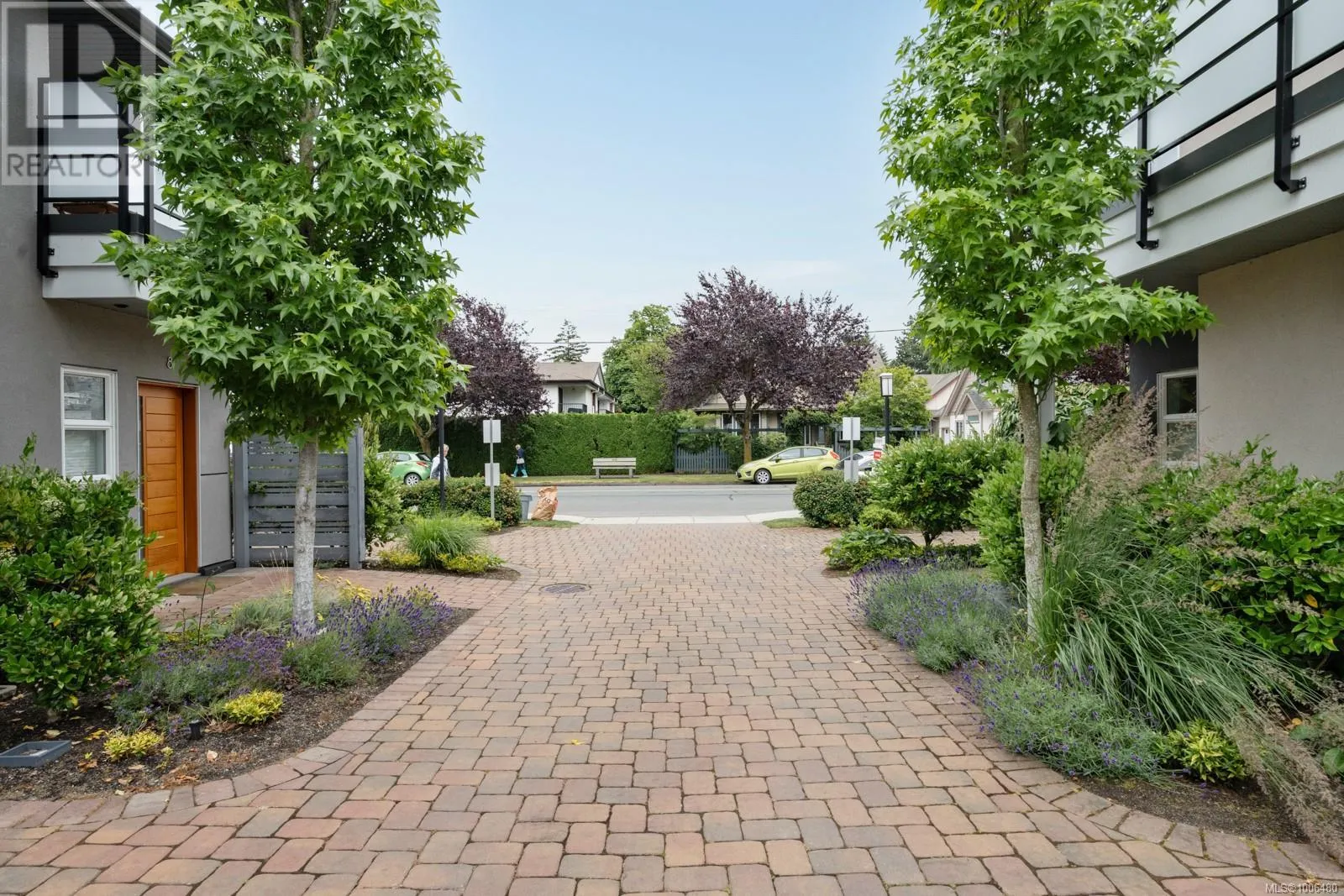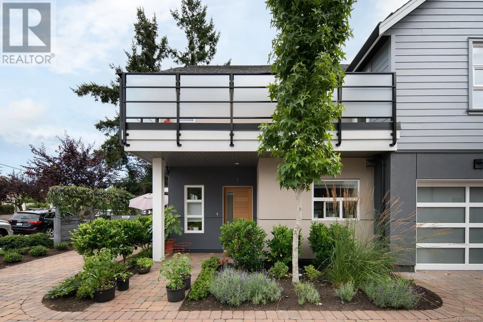Welcome to Seahaven, a locally inspired boutique development in an unparalleled Sidney location. Townhome 7 is a desirable end unit, and is one of only 4 with the large ground lvl side patio. Faultless features include wood flooring, high ceilings, EV-wired garages and more. On the main, a designer kitchen is fitted with chic white cabinetry, quartz counters and upscale SS appliances w/gas range. The open concept living/dining is flooded with natural light, and boasts cozy gas FP & french doors leading to the private patio. A good sized bedroom, laundry room and 3P bathroom completes. *This level is also wheelchair accessible*. Upstairs, you will find a lavish primary suite w/walk in closet, sumptuous 4P ensuite, and access to your private deck. Down the hall, another large bedroom and 4P bathroom. Lastly, a massive flex space lends itself to either a family room or bedroom. Located steps to shops, dining & parks, this is your opportunity to live the urban seaside lifestyle. (id:27476)