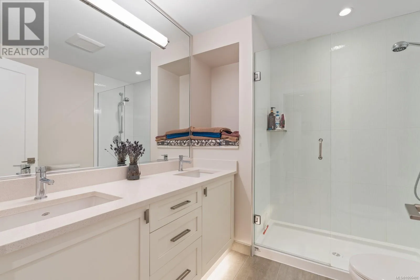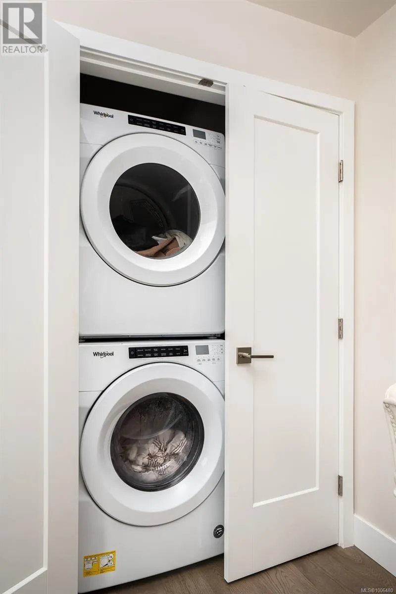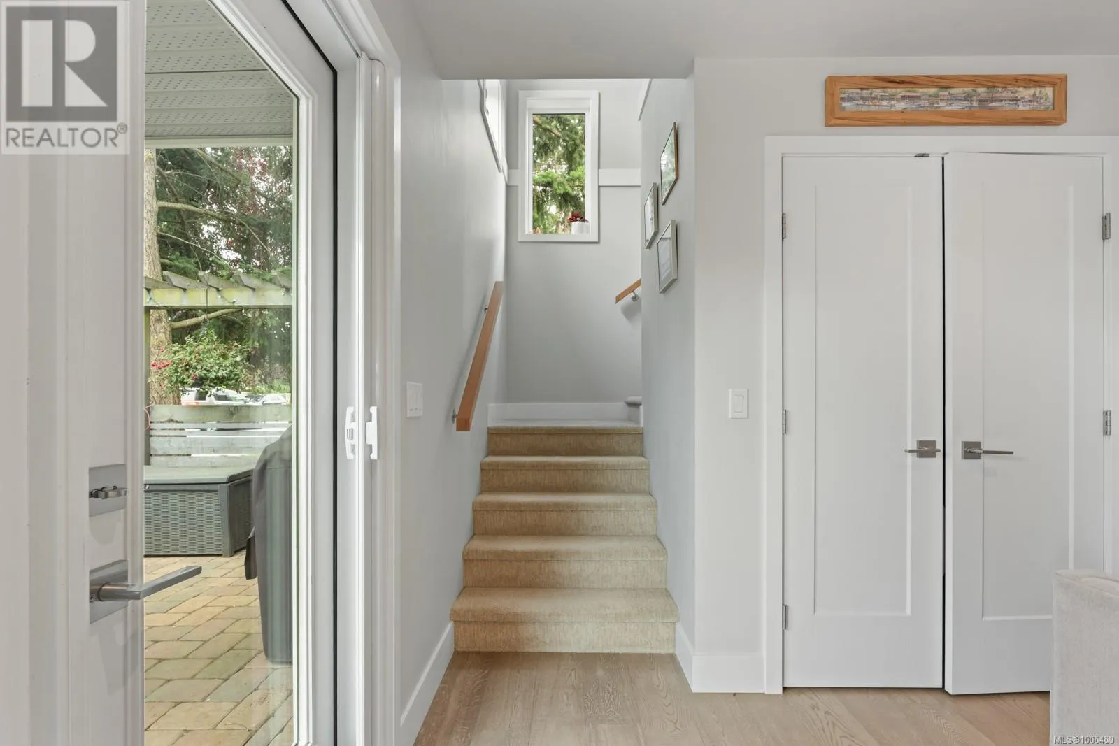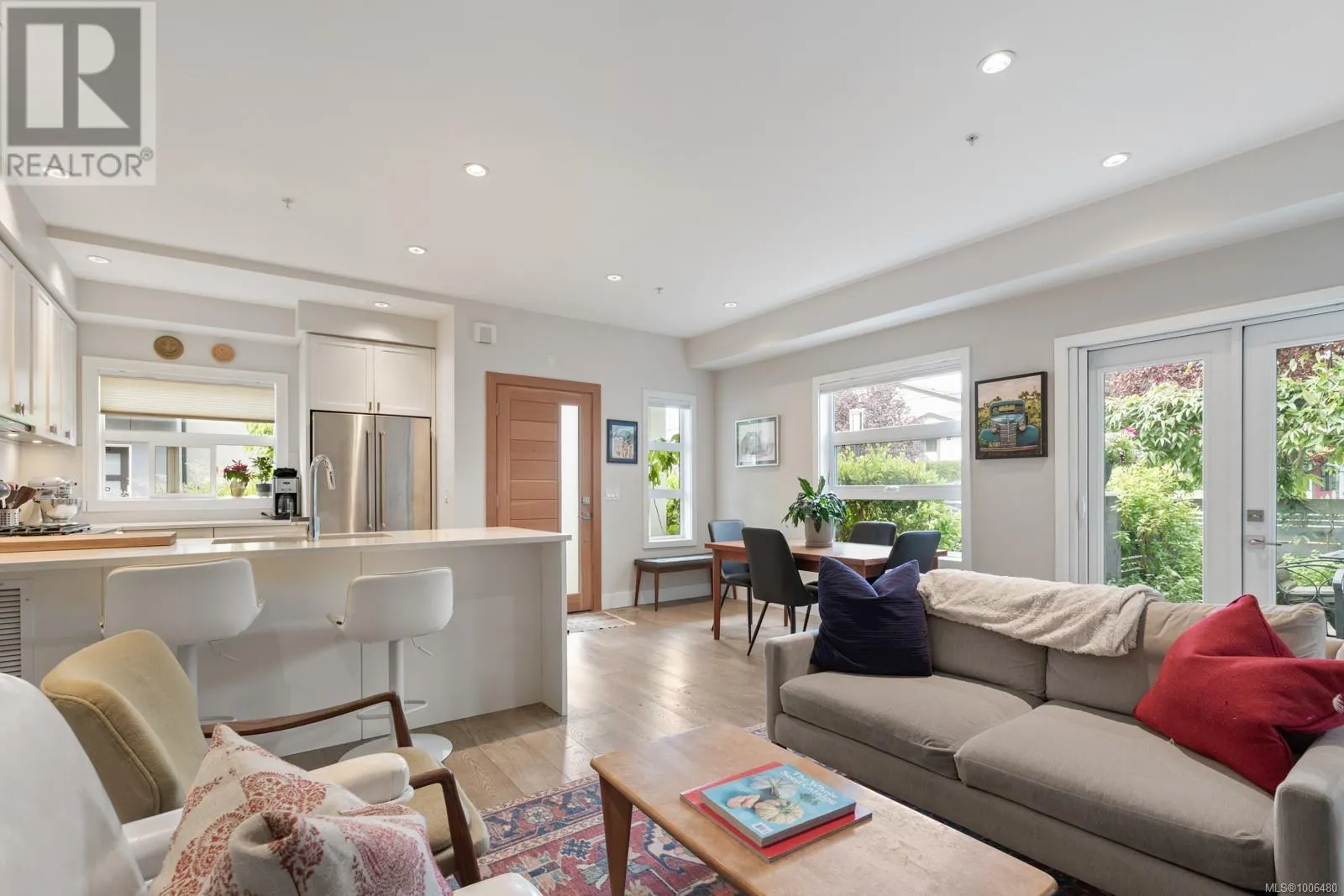Welcome to Seahaven, a locally inspired boutique development in an unparalleled Sidney location. Townhome 7 is a desirable end unit, and is one of only 4 with the large ground lvl side patio. Faultless features include wood flooring, high ceilings, EV-wired garages and more. On the main, a designer kitchen is fitted with chic white cabinetry, quartz counters and upscale SS appliances w/gas range. The open concept living/dining is flooded with natural light, and boasts cozy gas FP & french doors leading to the private patio. A good sized bedroom, laundry room and 3P bathroom completes. *This level is also wheelchair accessible*. Upstairs, you will find a lavish primary suite w/walk in closet, sumptuous 4P ensuite, and access to your private deck. Down the hall, another large bedroom and 4P bathroom. Lastly, a massive flex space lends itself to either a family room or bedroom. Located steps to shops, dining & parks, this is your opportunity to live the urban seaside lifestyle. (id:27476)
