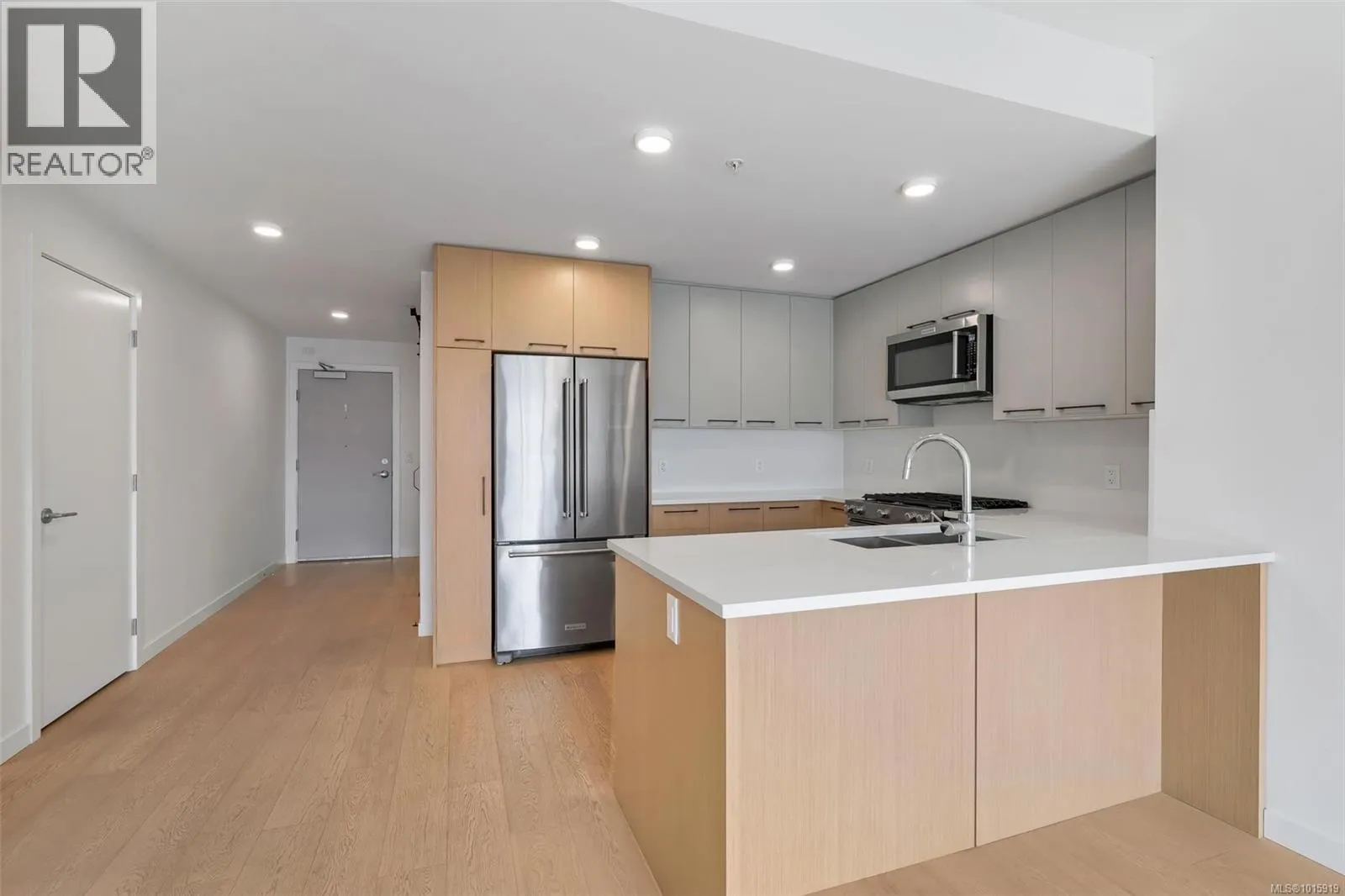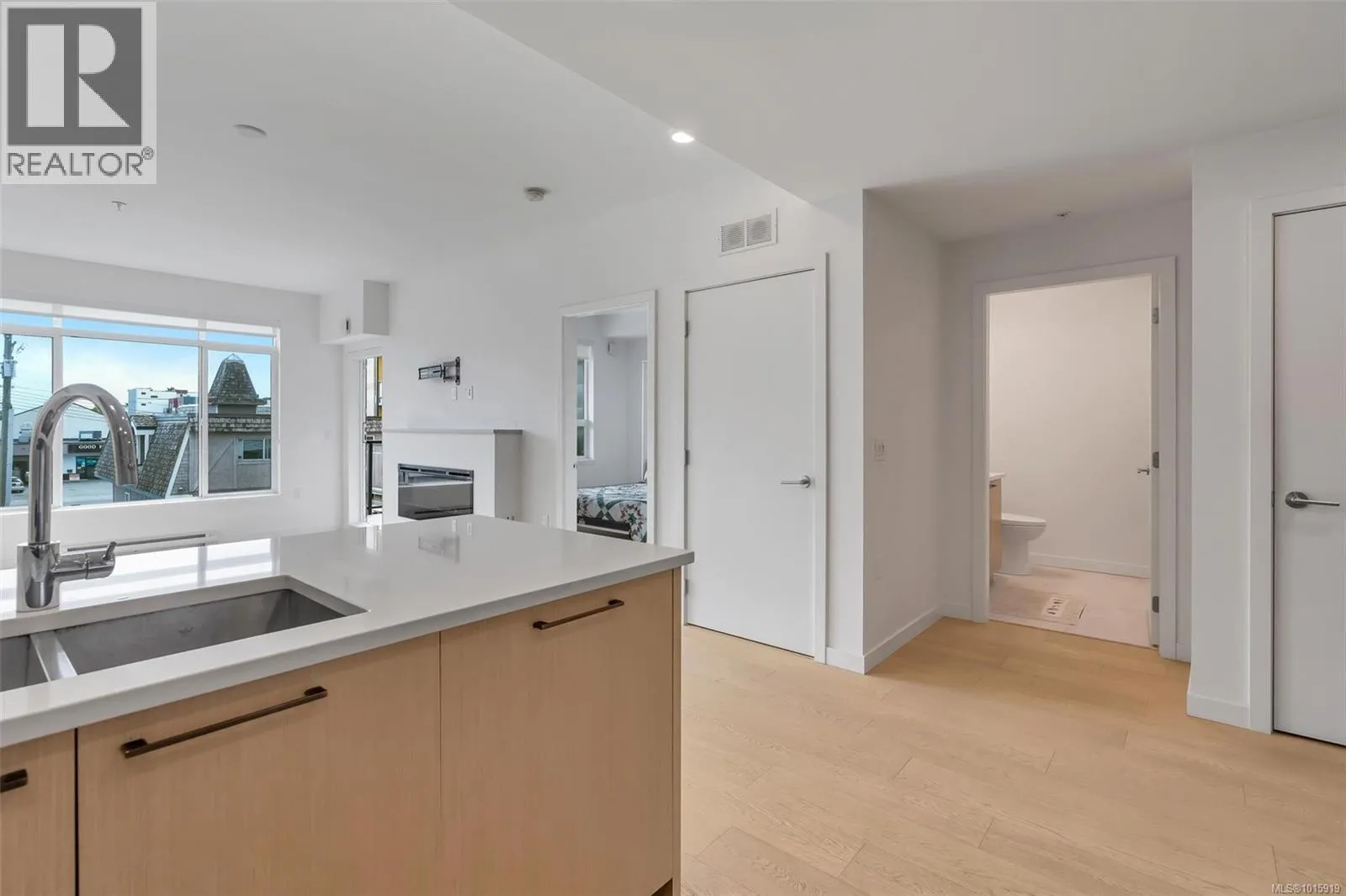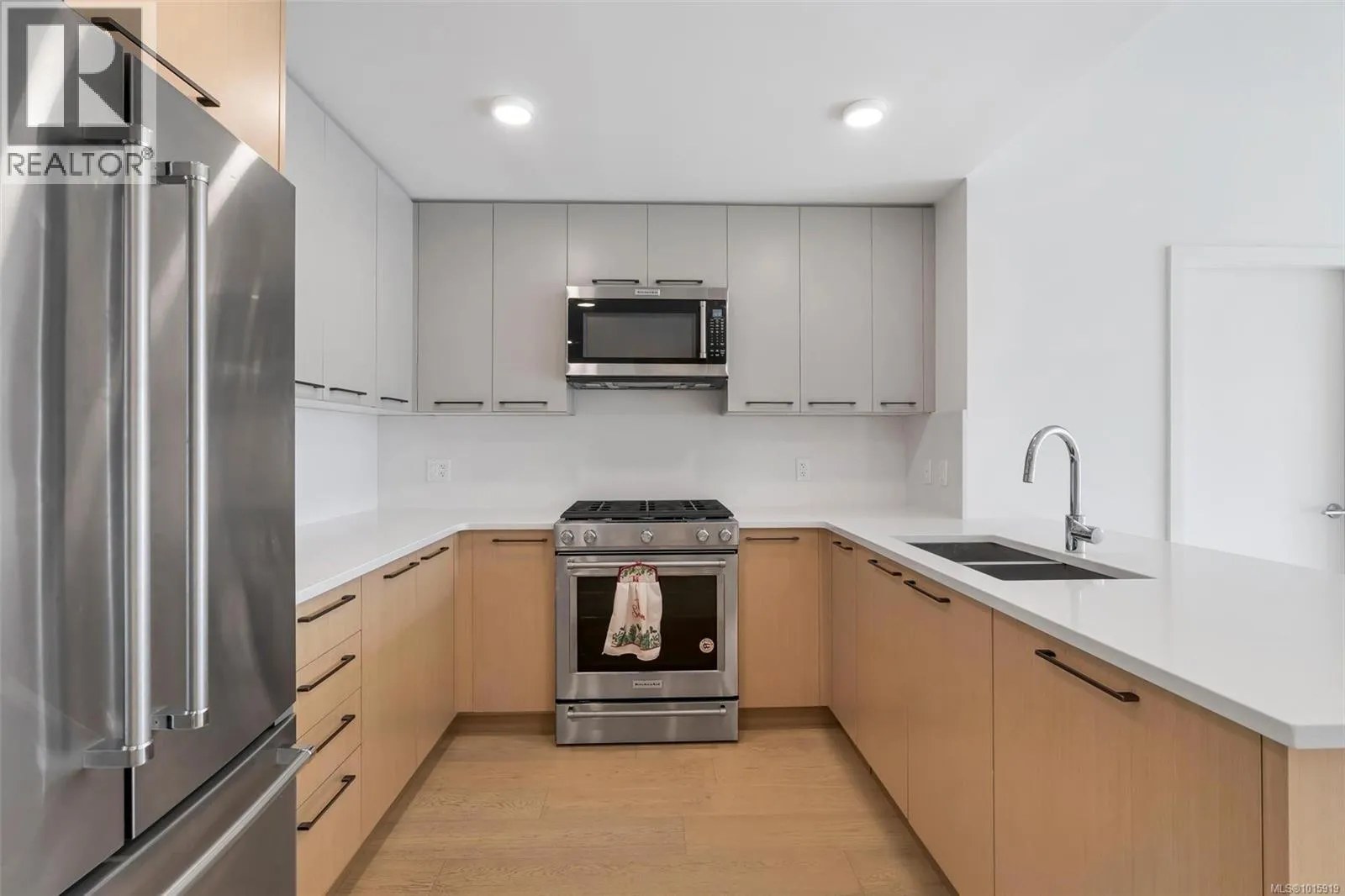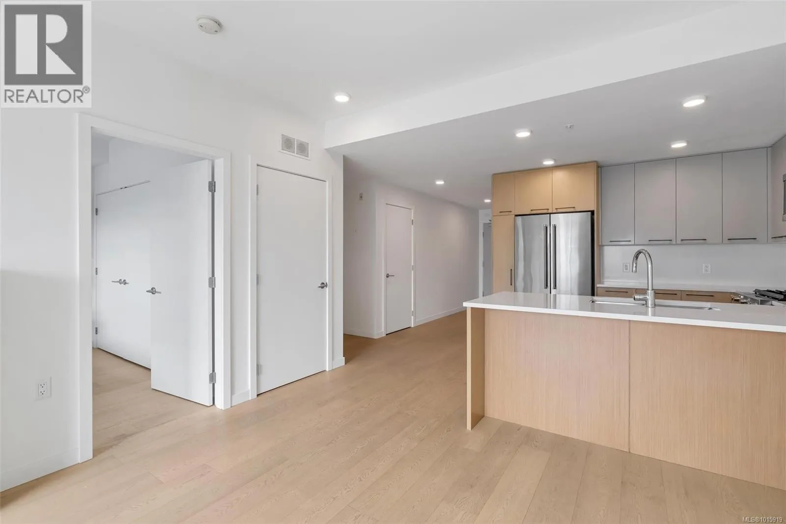 This almost-new 2 bed, 2 bath home offers 1,062 sq.ft. of thoughtfully designed living space in the heart of Sidney. As you enter, a spacious foyer and engineered hardwood floors lead to a stunning kitchen featuring Kitchenaid stainless appliances, quartz counters and backsplash, slow-close cabinetry, under-cabinet lighting, and a peninsula overlooking the bright great room. Large windows, 9â ceilings, and an electric fireplace enhance the living space, which opens to a massive 10â4 x 9â5 covered patioâideal for outdoor living. The generous primary bedroom includes two closets and a sleek 3-piece ensuite with a walk-in shower. A second bedroom with a Murphy bed sits opposite, next to the main 4-piece bath. A separate den adds versatility as a home office or storage. The Quartet is pet-friendly (no size limit), rental-friendly, and has no age restrictions. Itâs also a 100% non-smoking building. Just steps to Beacon Ave, the ocean, parks, and trailsâenjoy a true West Coast lifestyle. (id:27476)