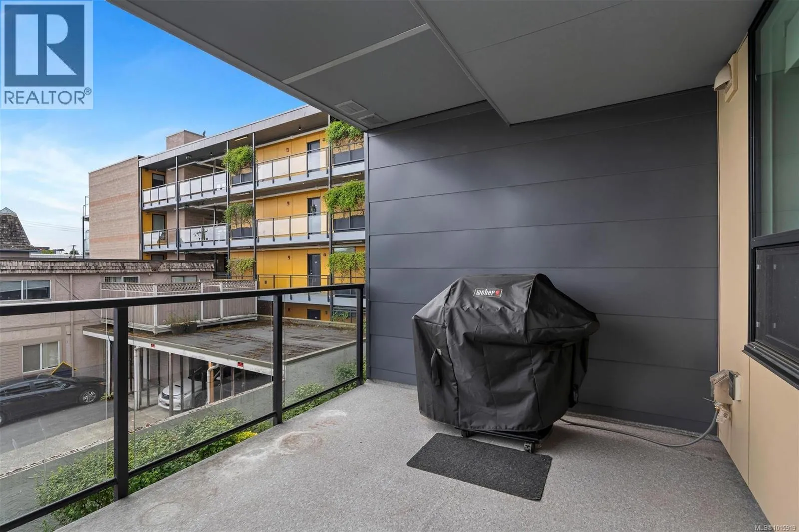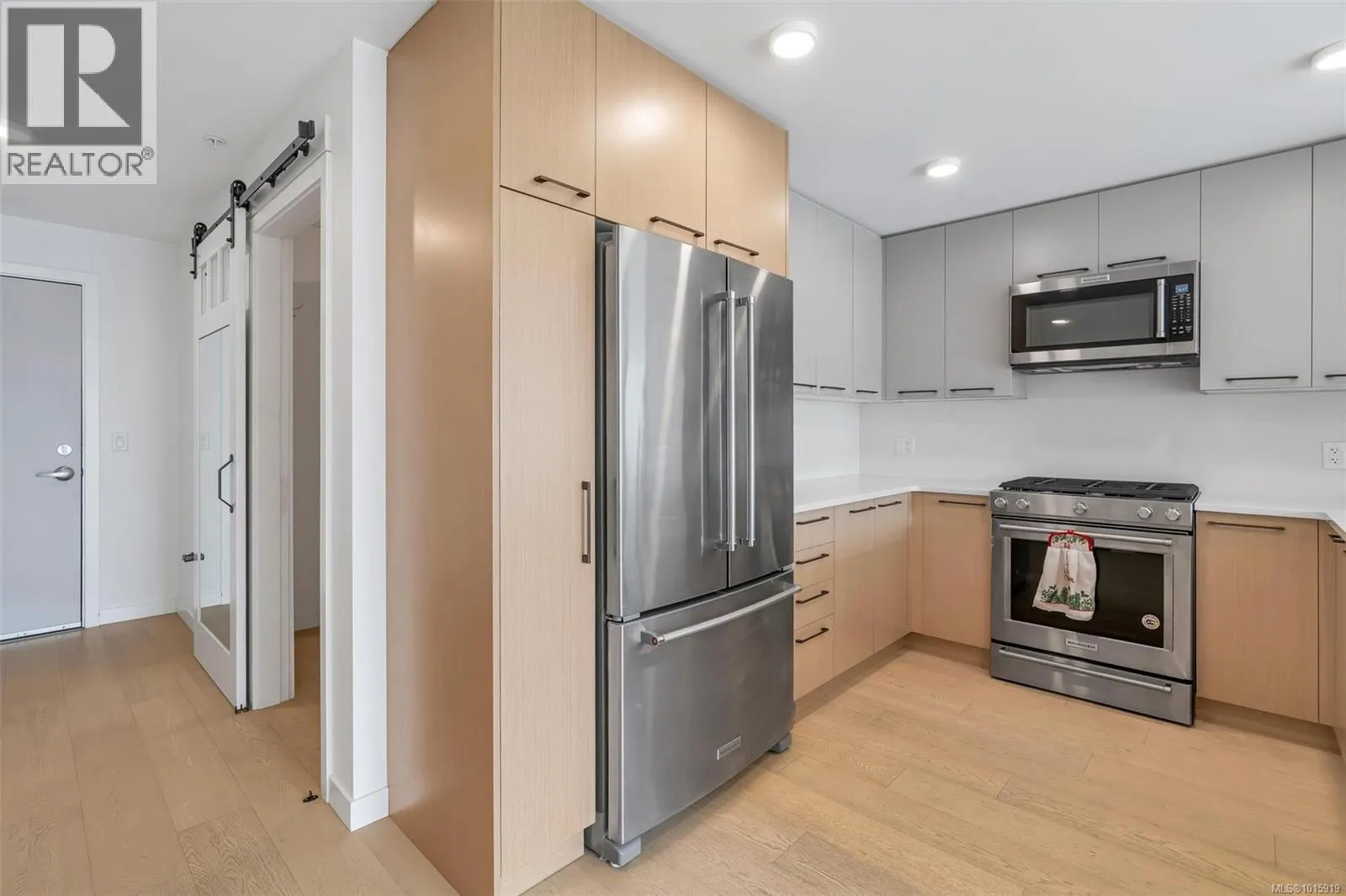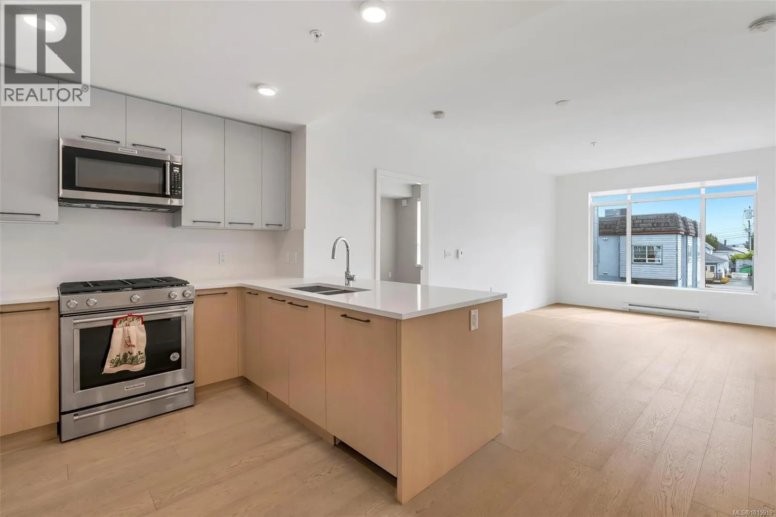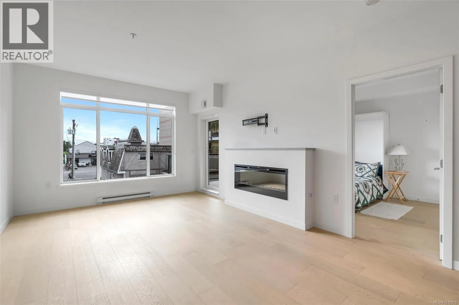 This almost-new 2 bed, 2 bath home offers 1,062 sq.ft. of thoughtfully designed living space in the heart of Sidney. As you enter, a spacious foyer and engineered hardwood floors lead to a stunning kitchen featuring Kitchenaid stainless appliances, quartz counters and backsplash, slow-close cabinetry, under-cabinet lighting, and a peninsula overlooking the bright great room. Large windows, 9â ceilings, and an electric fireplace enhance the living space, which opens to a massive 10â4 x 9â5 covered patioâideal for outdoor living. The generous primary bedroom includes two closets and a sleek 3-piece ensuite with a walk-in shower. A second bedroom with a Murphy bed sits opposite, next to the main 4-piece bath. A separate den adds versatility as a home office or storage. The Quartet is pet-friendly (no size limit), rental-friendly, and has no age restrictions. Itâs also a 100% non-smoking building. Just steps to Beacon Ave, the ocean, parks, and trailsâenjoy a true West Coast lifestyle. (id:27476)