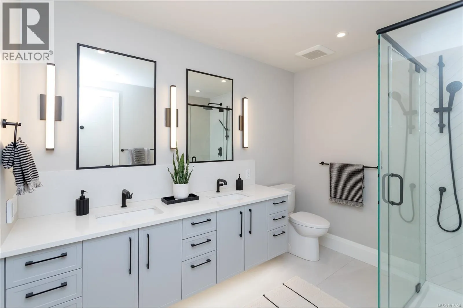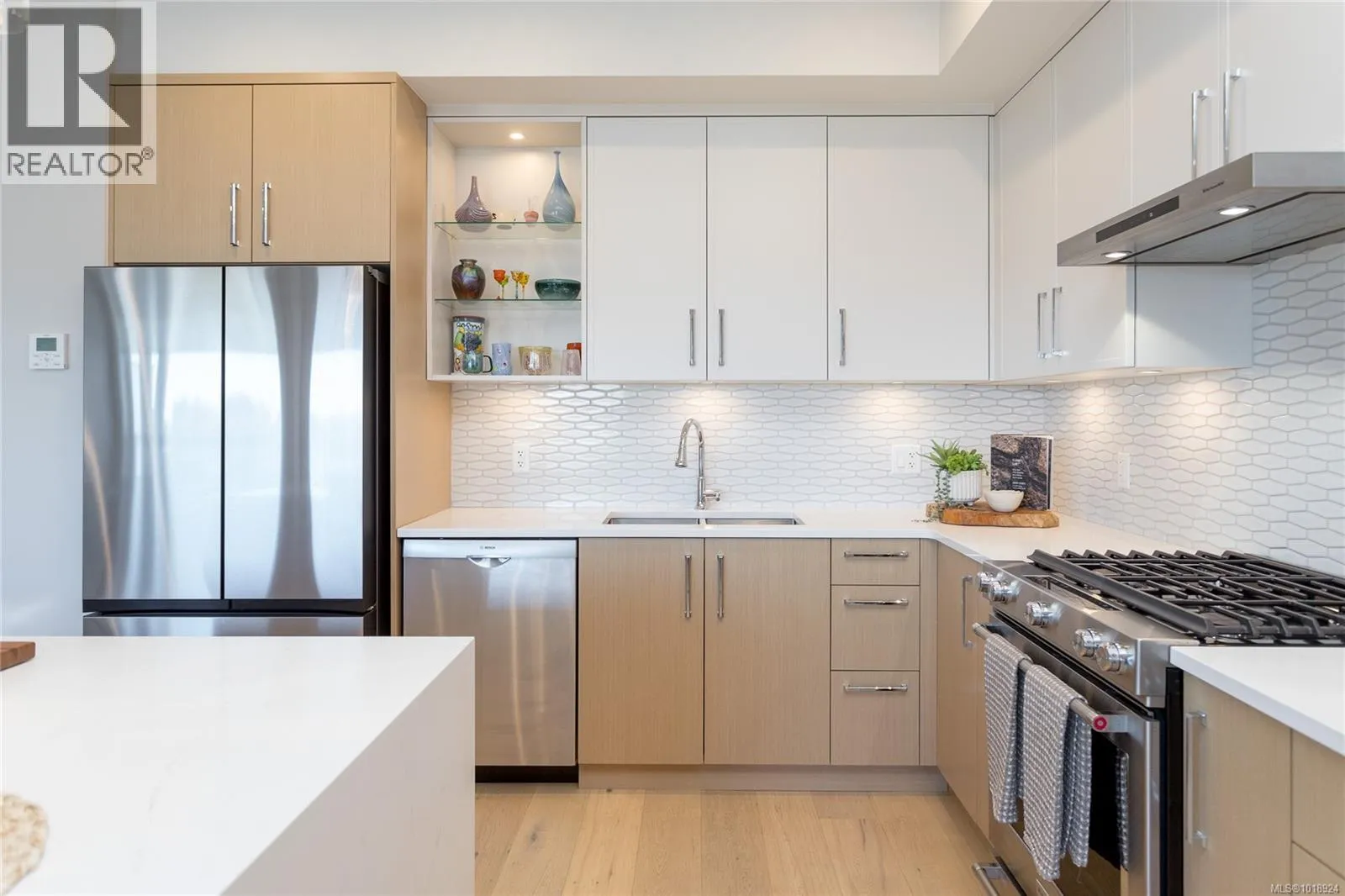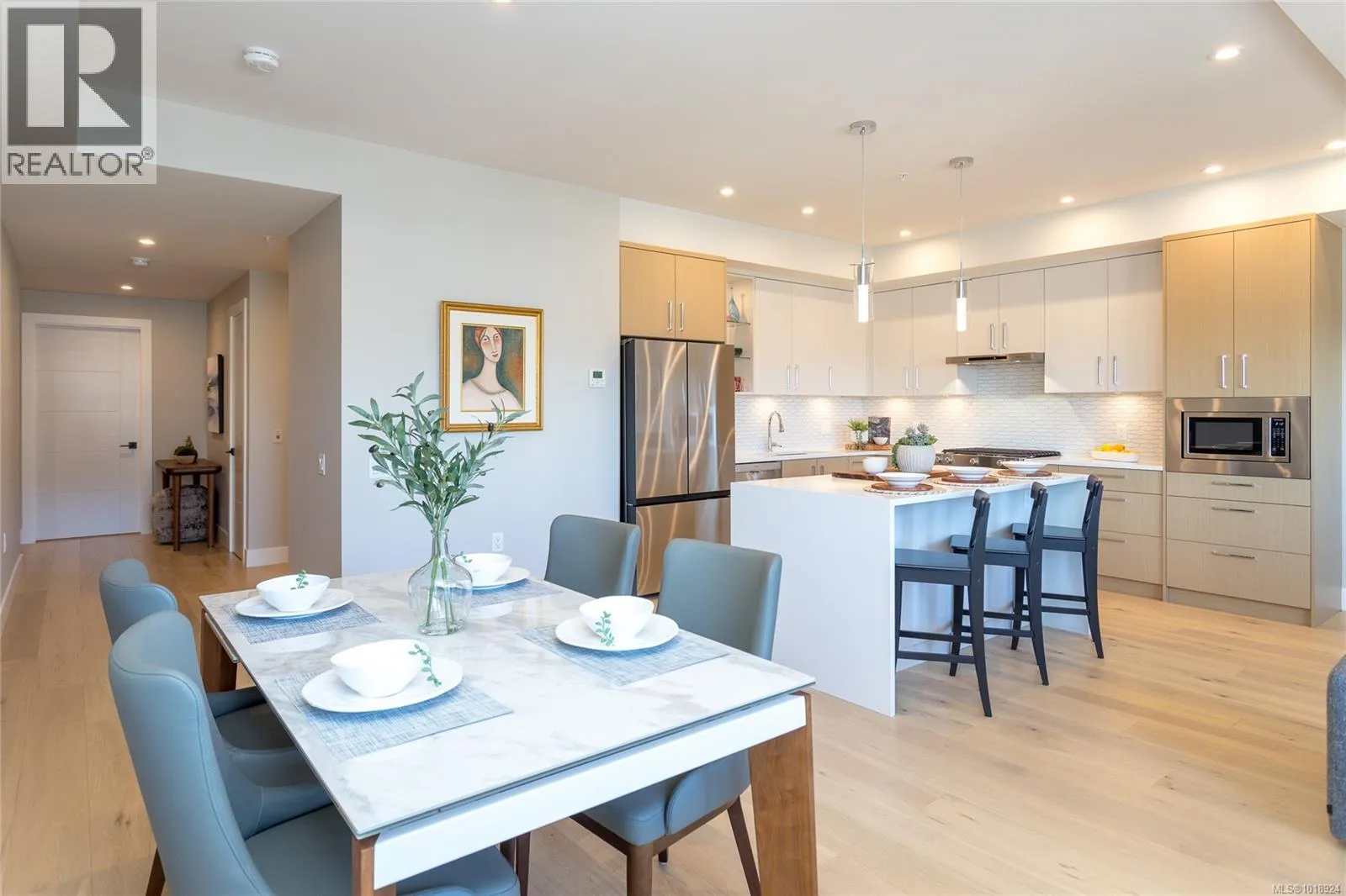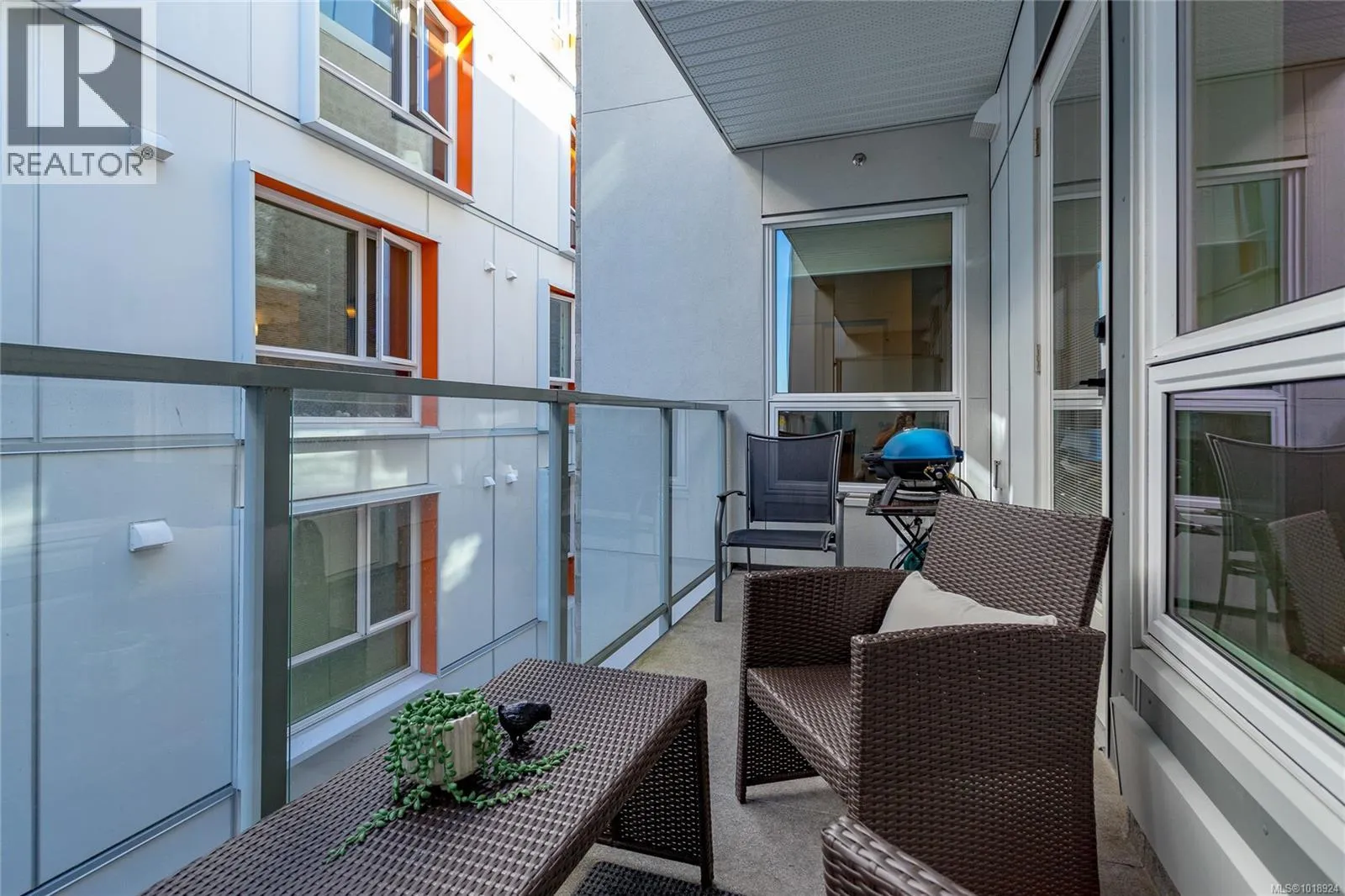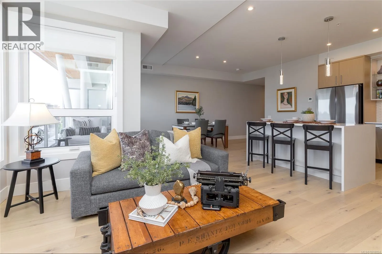 Welcome to the heart of Sidney-by-the-Sea, where everyday life feels like a getaway. Step outside to the waterfront, vibrant markets, and cozy cafés that define this friendly coastal town. Built in 2023 and still under home warranty, this modern 2-bed, 2-bath condo offers 1,244 sq ft of refined living with 9-ft ceilings, huge windows, AC, in-suite laundry and two private balconies. The kitchen pairs form and function with quartz countertops, a gas range, and premium appliances, flowing seamlessly into a bright, open living space with a gas fireplace. The spacious primary suite features heated floors, a walk-in glass shower, and double vanity. Freshly painted with thoughtful upgrades like powered blinds, motion-sensor lighting, and custom storage. Secure parking with common EV charger, separate storage, and a bike locker complete this exceptional home. The Beacon offers modern comfort in one of Vancouver Islandâs most walkable seaside communities. (id:27476)