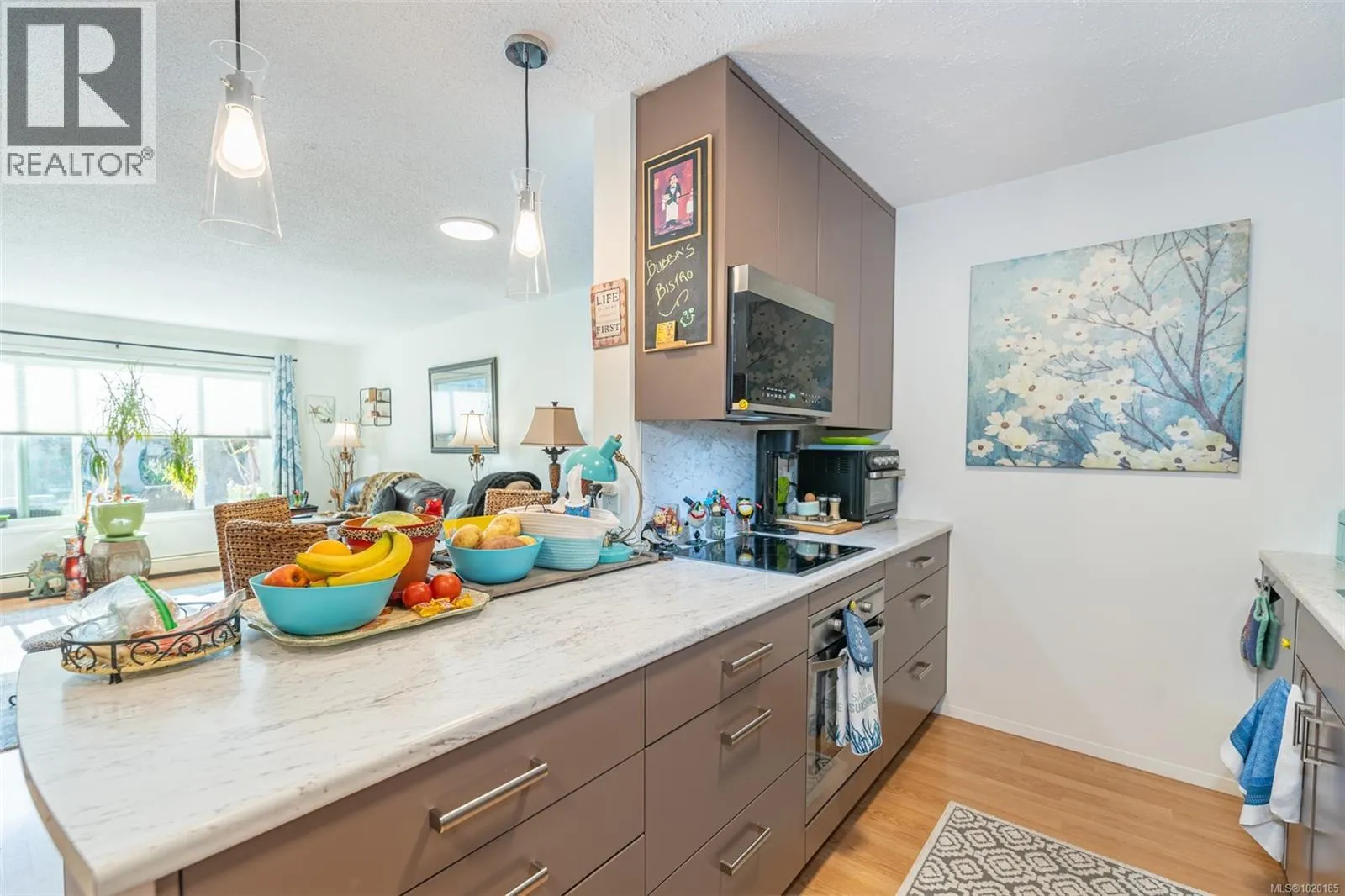 Discover effortless living at The Briarwood, a peaceful and well-maintained 55+ building tucked away in one of Sidneyâs most walkable neighbourhoods. This 2-bed, 2-bath updated ground suite offers a light-filled layout and a covered front patio with storageâperfect for morning coffee or afternoon reading. Inside, enjoy a combined living and dining room and an upgraded kitchen that awaits the chef in you, complete with a Bosch fridge, Blomberg dishwasher, and AEG induction cooktop. The bathrooms have been renovated, featuring a new soaker tub in the main bath and a walk-in shower ensuite in the large primary bedroom with walk-through closets. A great-sized second bedroom offers a double closet and great light. With new carpets, fresh paint, and updated fixtures, this home is truly move-in ready. Assigned parking, a storage locker, and strata fees covering heat and hot water add everyday ease. Pet-friendly and part of a proactive, well-managed strata, this is seaside living at its peak. (id:27476)