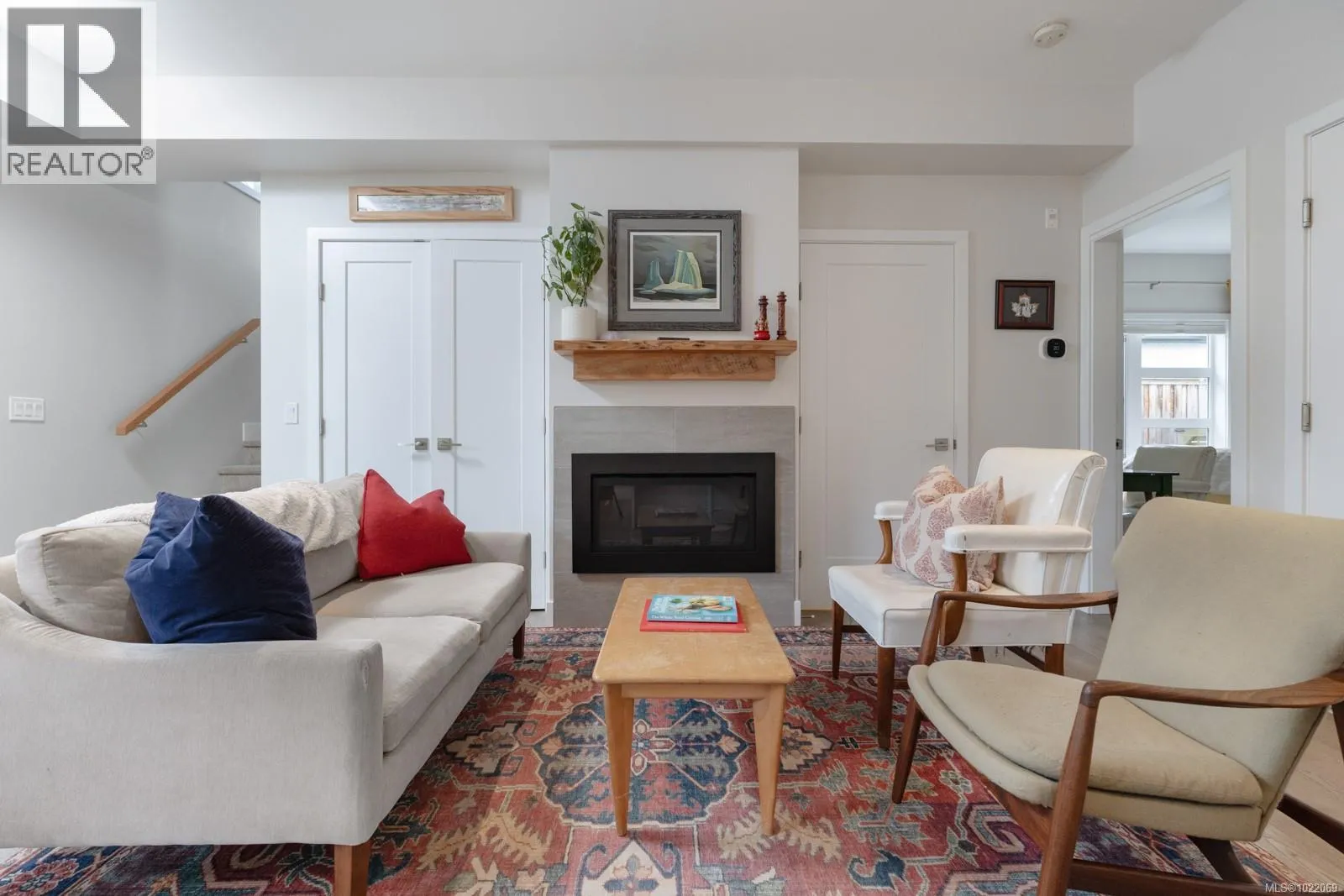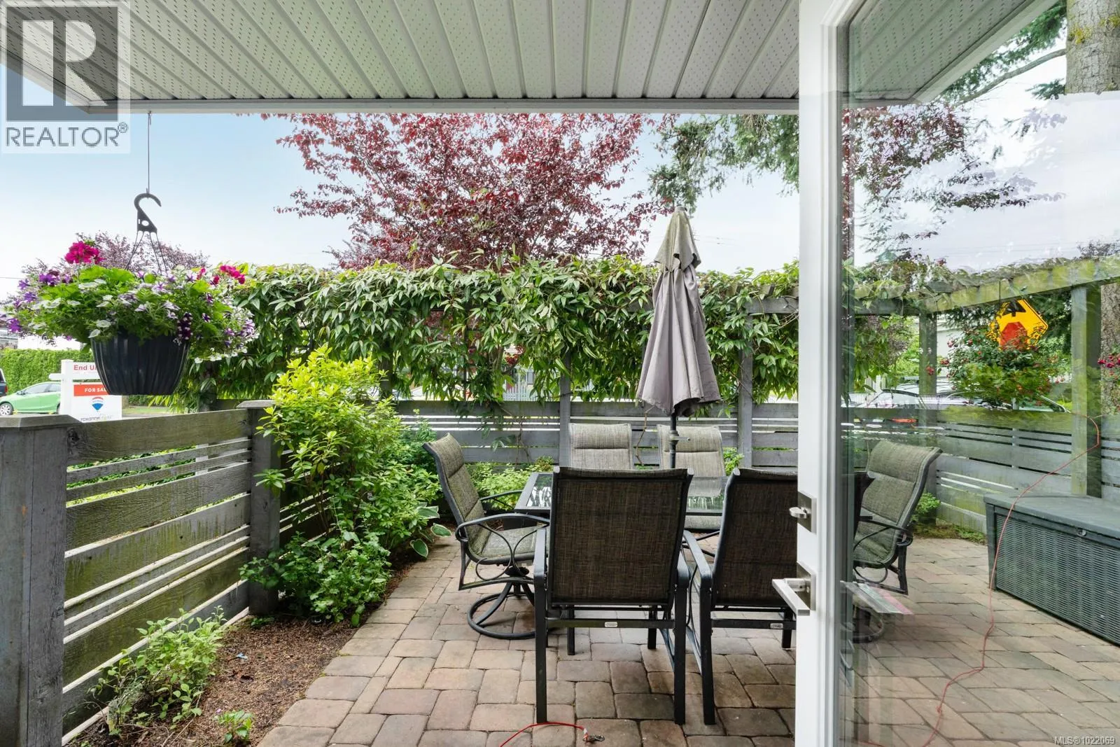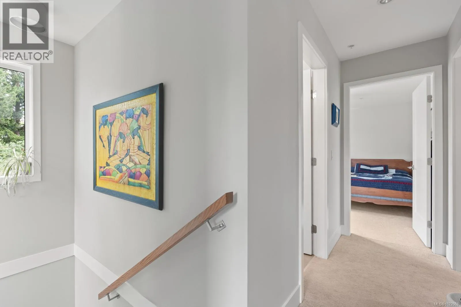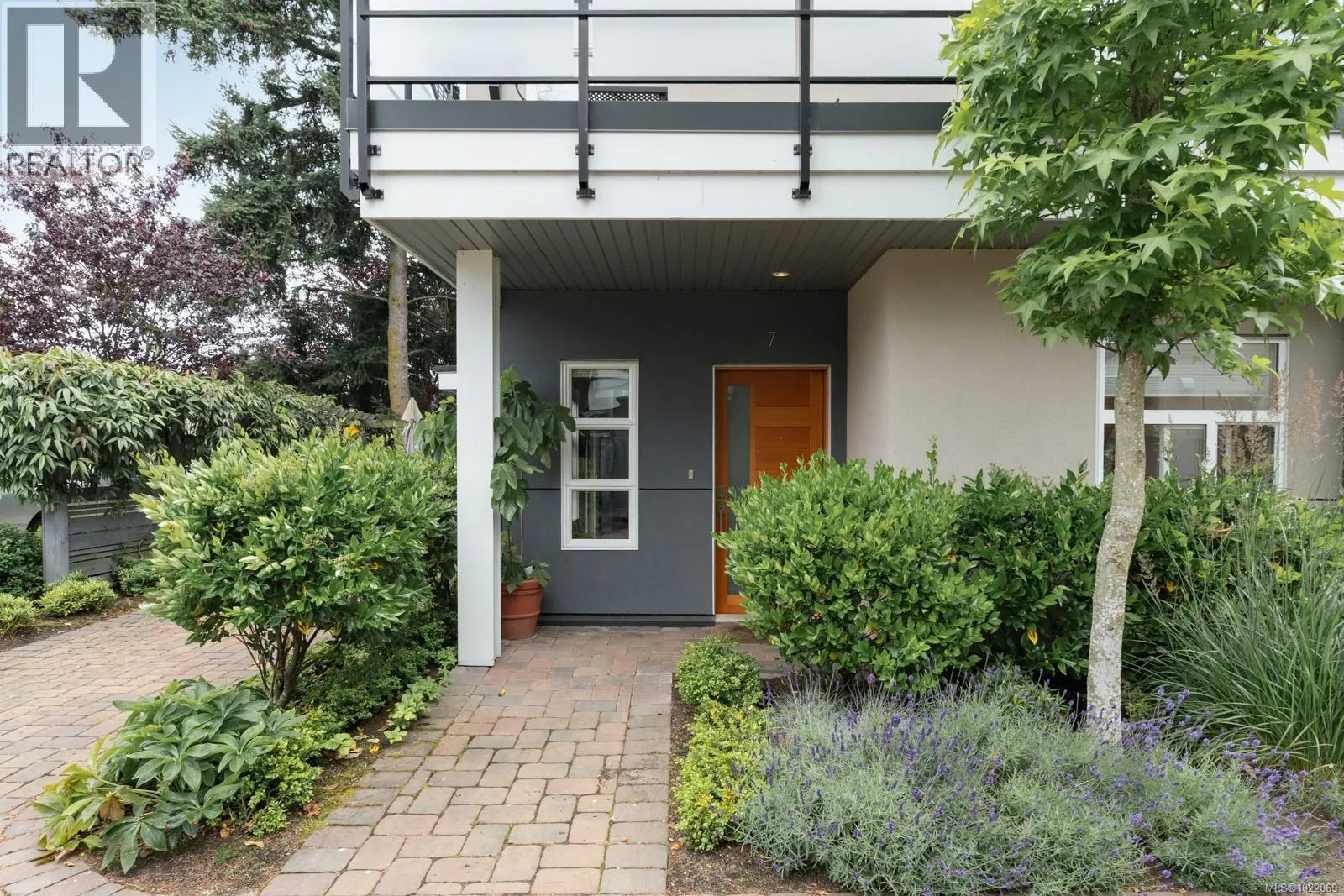 Welcome to Seahaven, a locally inspired boutique development in an unparalleled Sidney location. Townhome 7 is a desirable end unit, and is one of only 4 with the large ground lvl side patio. Faultless features include wood flooring, high ceilings, EV-wired garages and more. On the main, a designer kitchen is fitted with chic white cabinetry, quartz counters and upscale SS appliances w/gas range. The open concept living/dining is flooded with natural light, and boasts cozy gas FP & french doors leading to the private patio. A good sized bedroom, laundry room and 3P bathroom completes. *This level is also wheelchair accessible*. Upstairs, you will find a lavish primary suite w/walk in closet, sumptuous 4P ensuite, and access to your private deck. Down the hall, another large bedroom and 4P bathroom. Lastly, a massive flex space lends itself to either a family room or bedroom. Located steps to shops, dining & parks, this is your opportunity to live the urban seaside lifestyle. (id:27476)