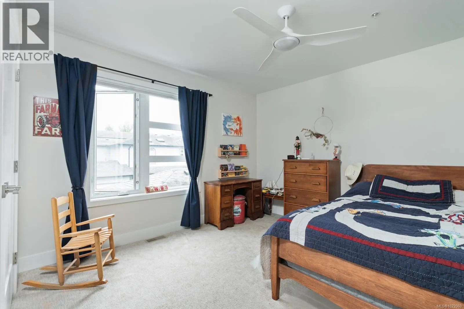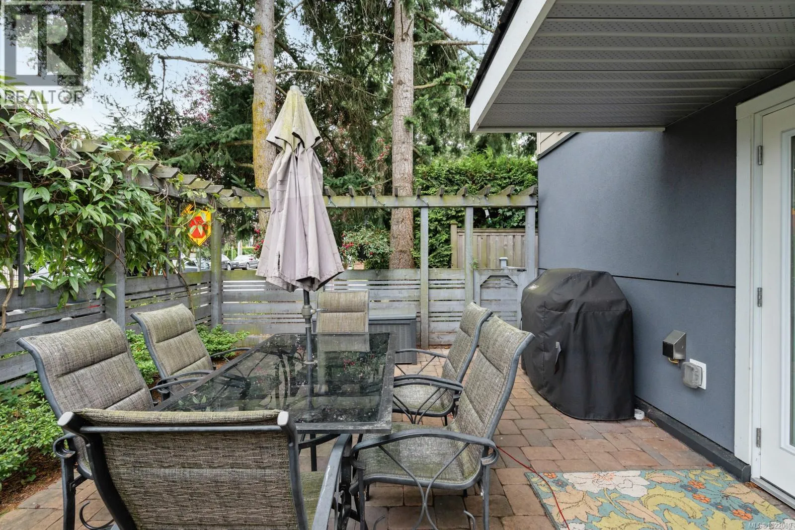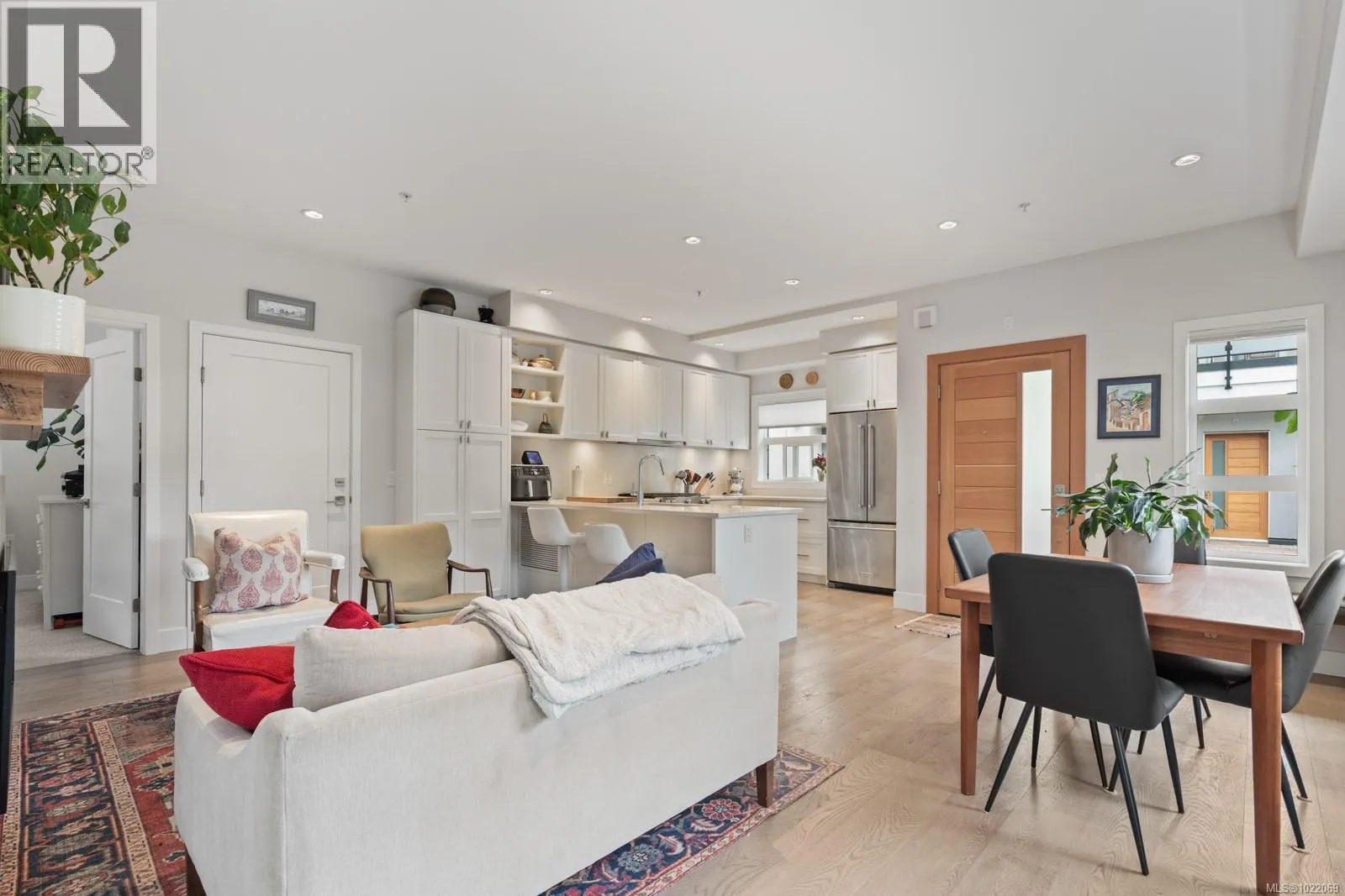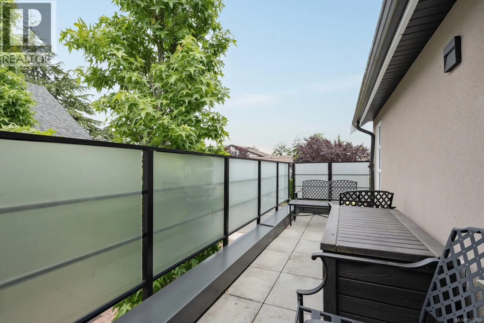 Welcome to Seahaven, a locally inspired boutique development in an unparalleled Sidney location. Townhome 7 is a desirable end unit, and is one of only 4 with the large ground lvl side patio. Faultless features include wood flooring, high ceilings, EV-wired garages and more. On the main, a designer kitchen is fitted with chic white cabinetry, quartz counters and upscale SS appliances w/gas range. The open concept living/dining is flooded with natural light, and boasts cozy gas FP & french doors leading to the private patio. A good sized bedroom, laundry room and 3P bathroom completes. *This level is also wheelchair accessible*. Upstairs, you will find a lavish primary suite w/walk in closet, sumptuous 4P ensuite, and access to your private deck. Down the hall, another large bedroom and 4P bathroom. Lastly, a massive flex space lends itself to either a family room or bedroom. Located steps to shops, dining & parks, this is your opportunity to live the urban seaside lifestyle. (id:27476)